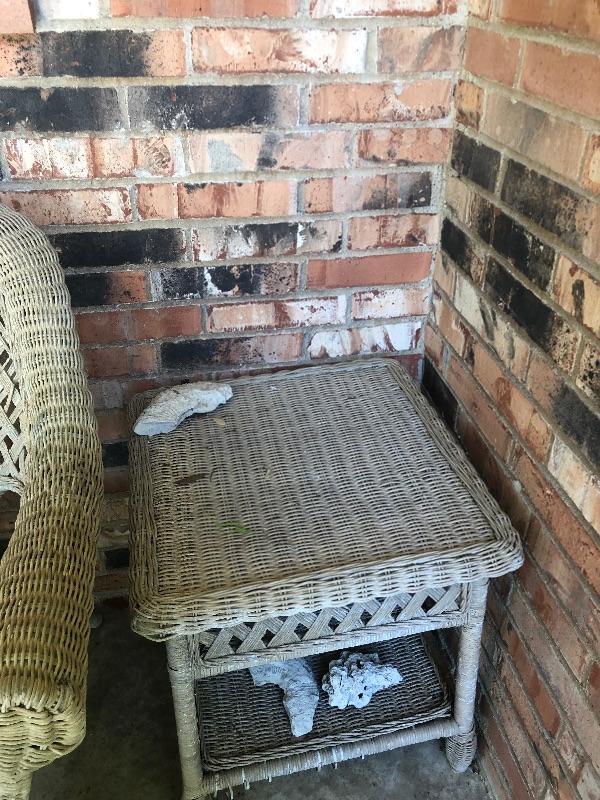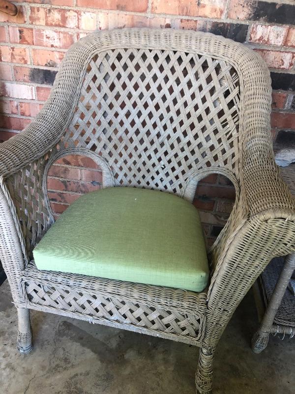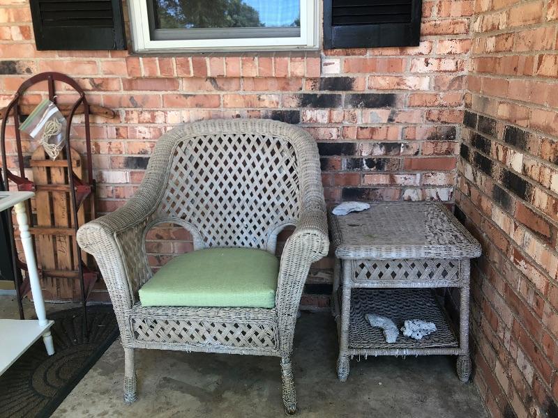 Outdoor chair and table made of heavy resin has a nice light green clean cushion