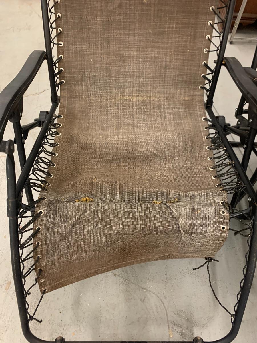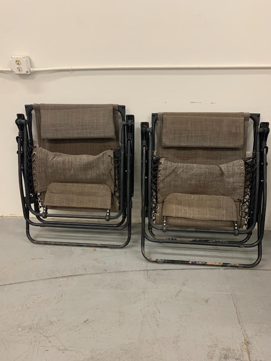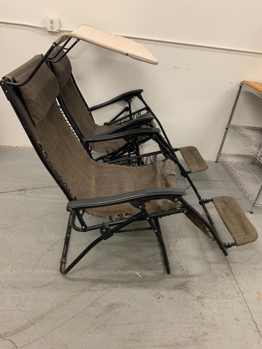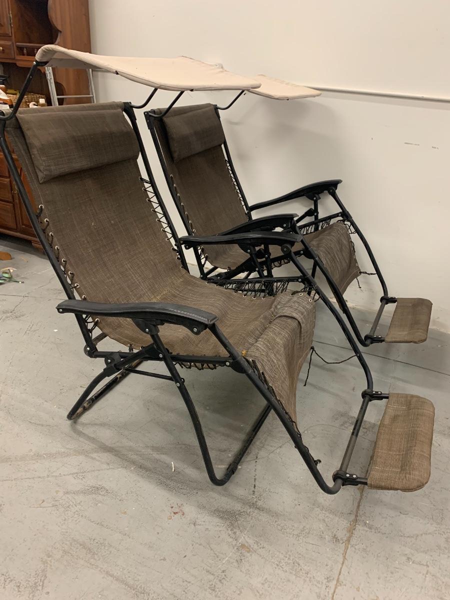 Folding Outdoor Chairs with visor and footrest. Good condition, one chair needs to be re-roped to the metal bar by the foot area and has a small rip in the visor
