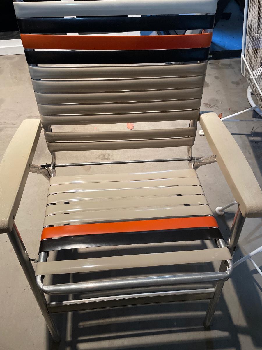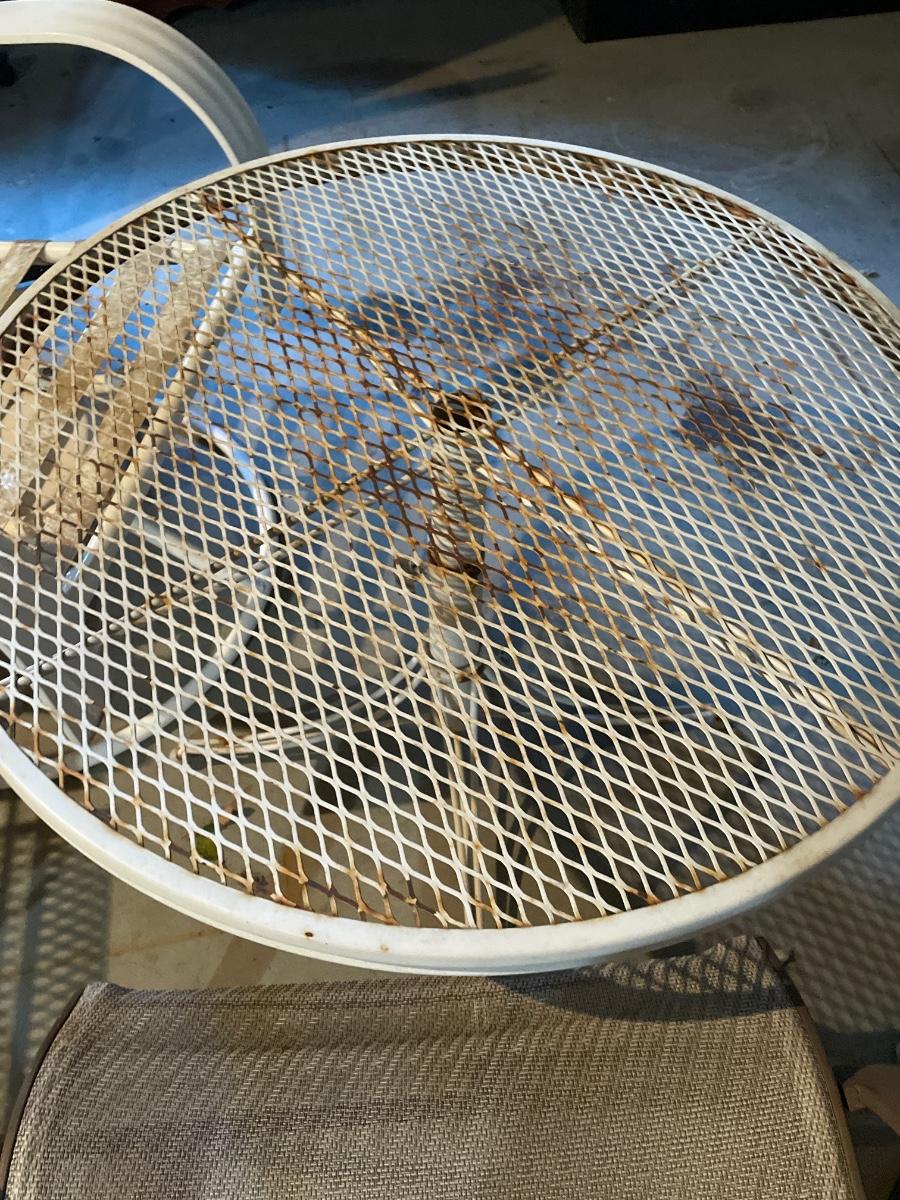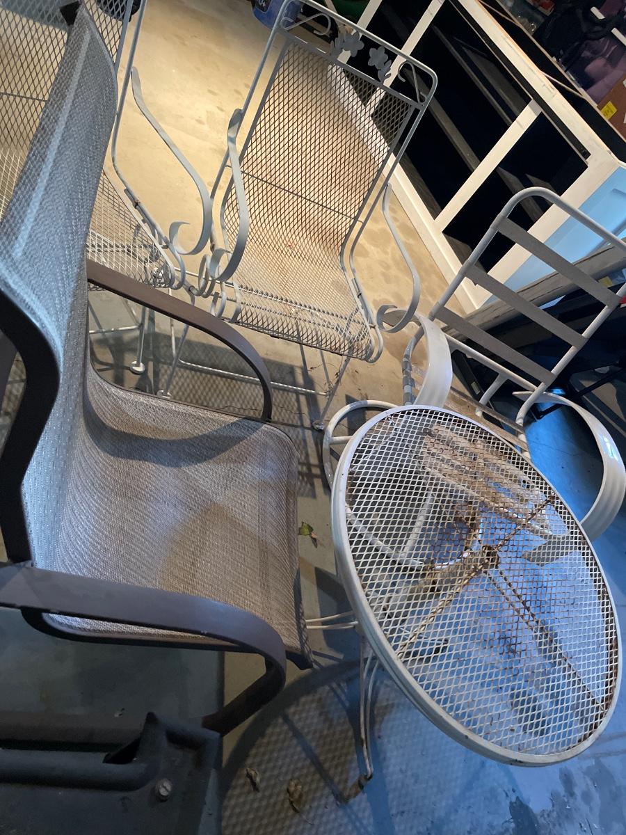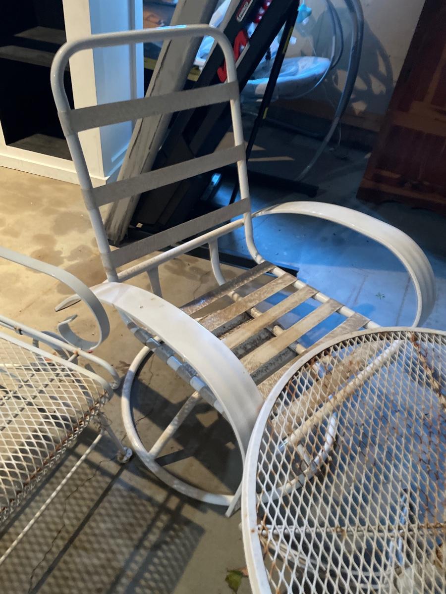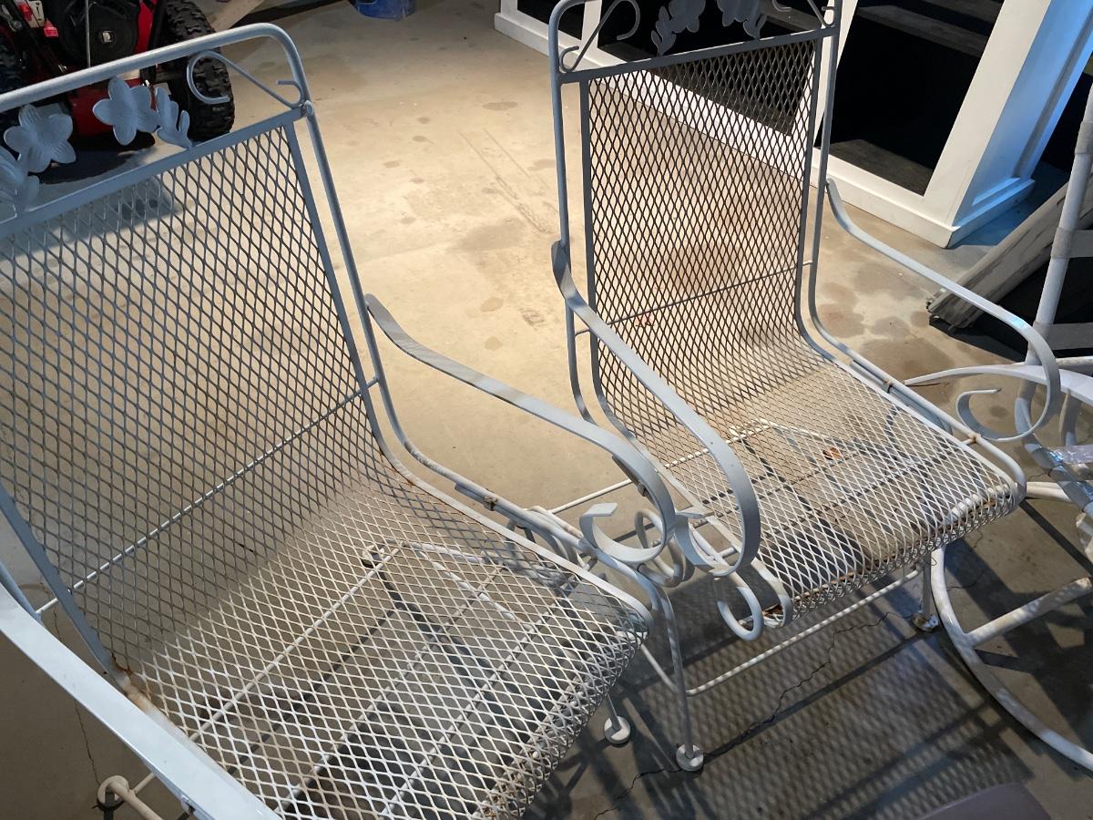Includes two white metal outdoor rocking chairs with metal table and two other outdoor chairs