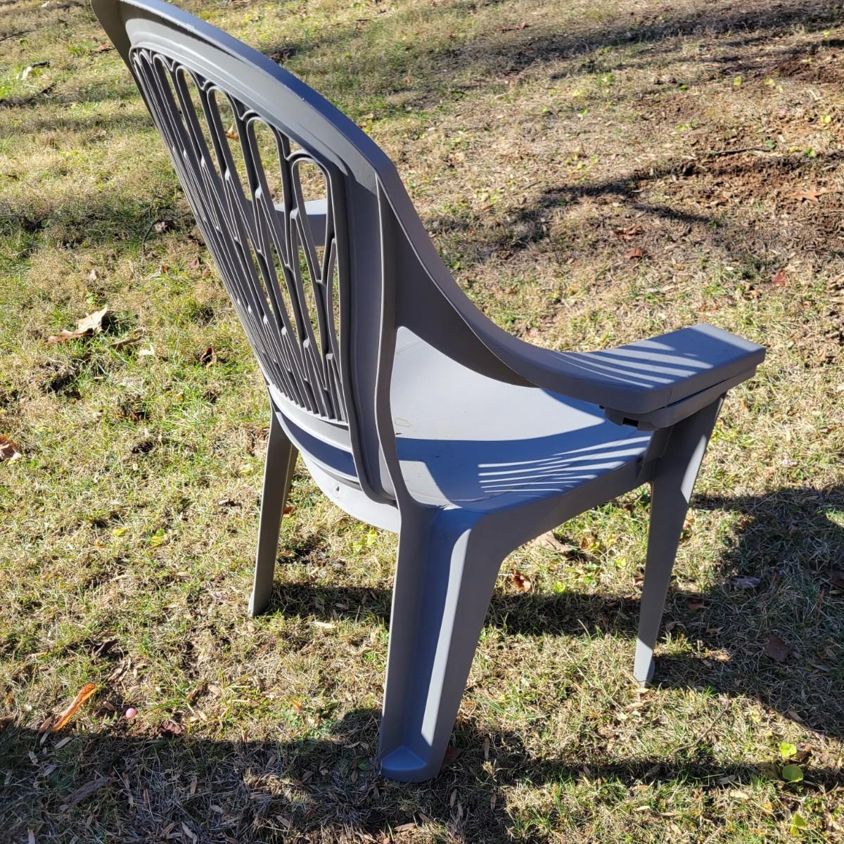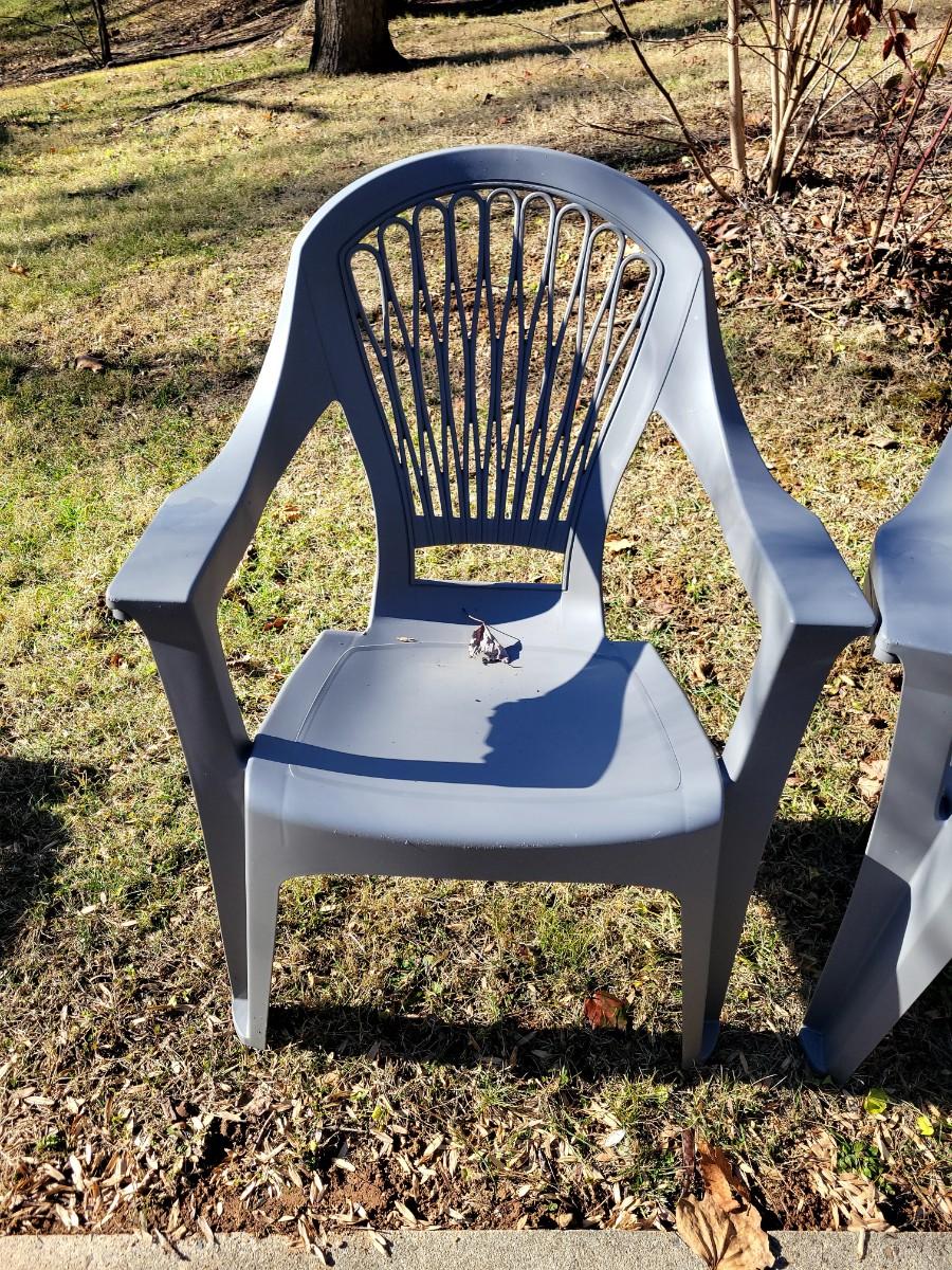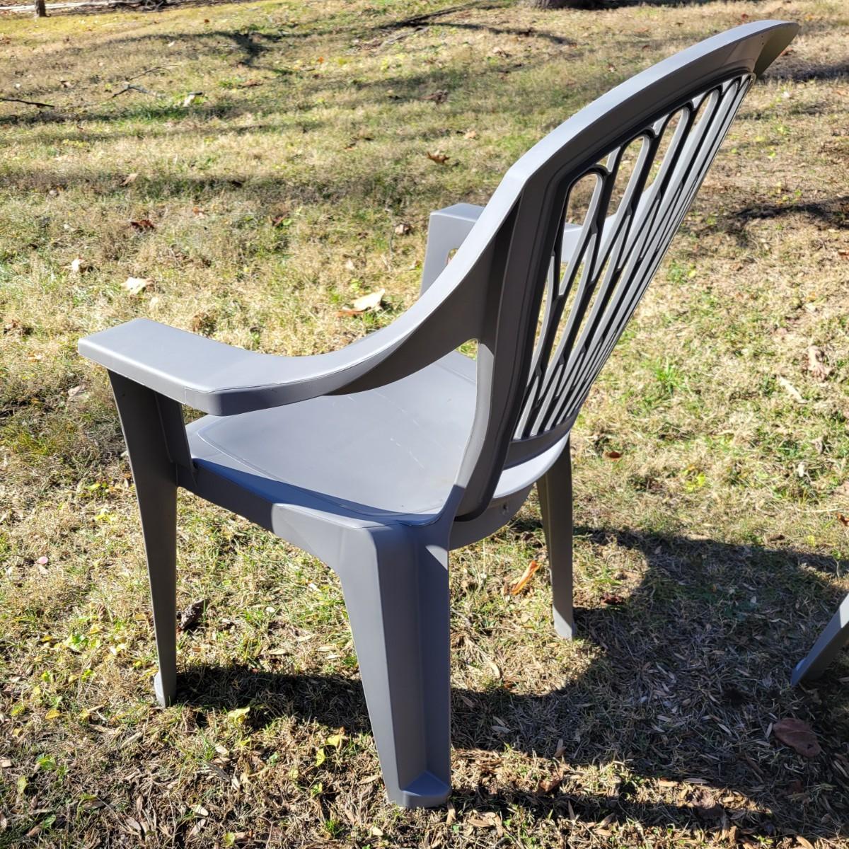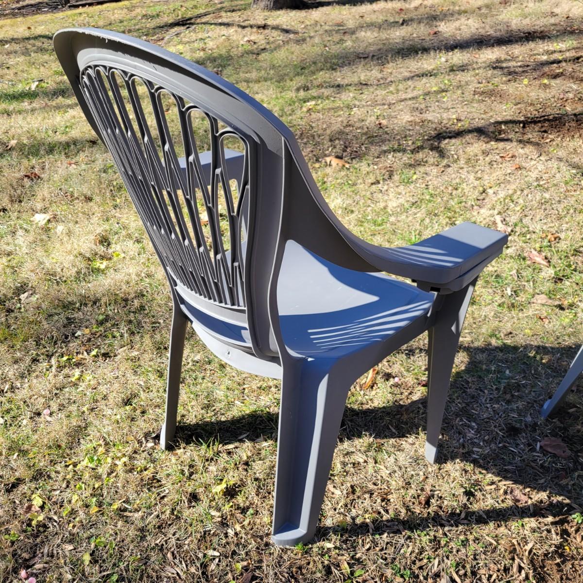 A set of four outdoor chairs and tables made of plastic. The chairs measure approximately 30.5" x 25" x 38"H with a seat height of 15.5". Local pickup only
