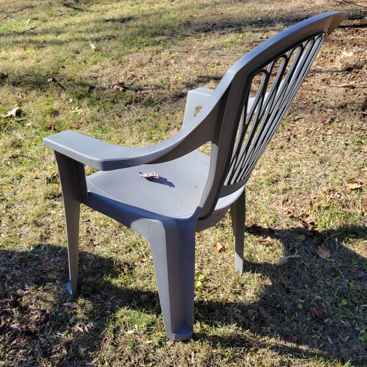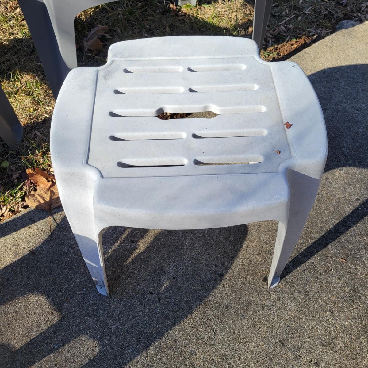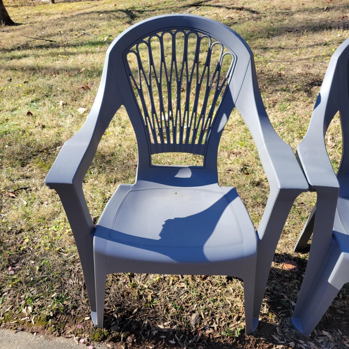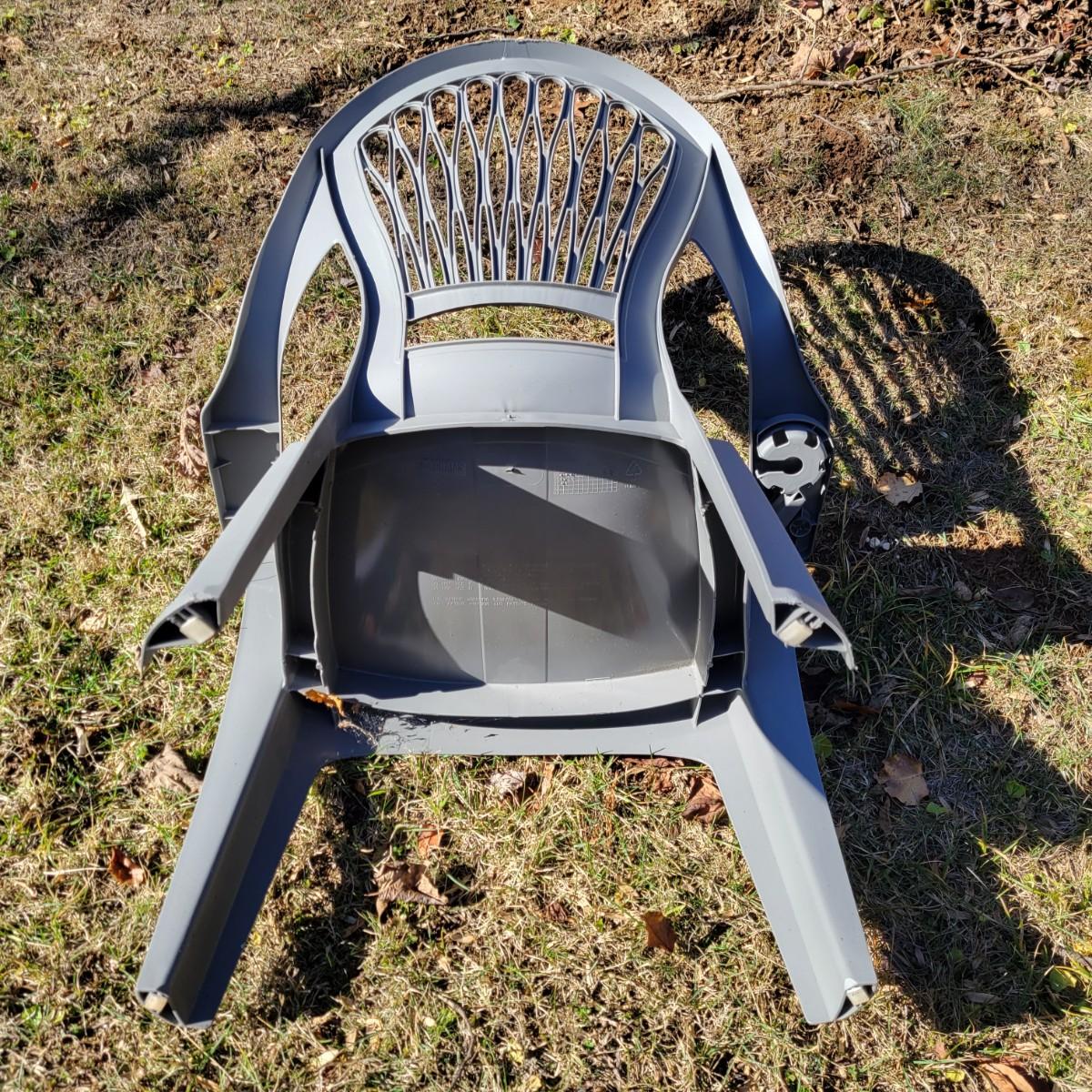 A set of four outdoor chairs and tables made of plastic. The chairs measure approximately 30.5" x 25" x 38"H with a seat height of 15.5". Local pickup only