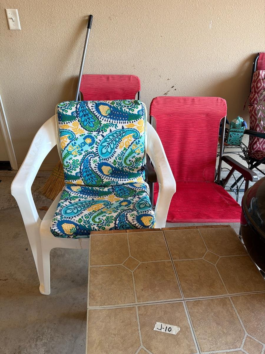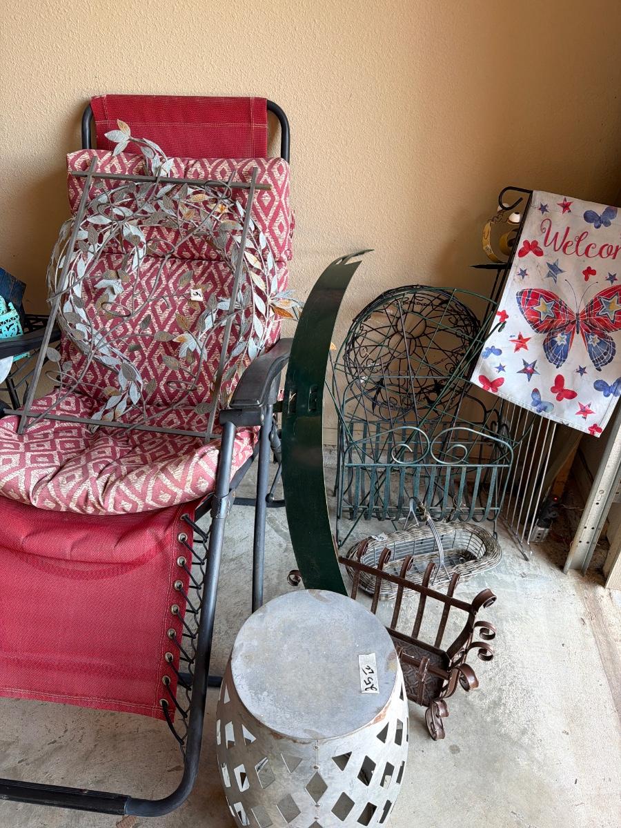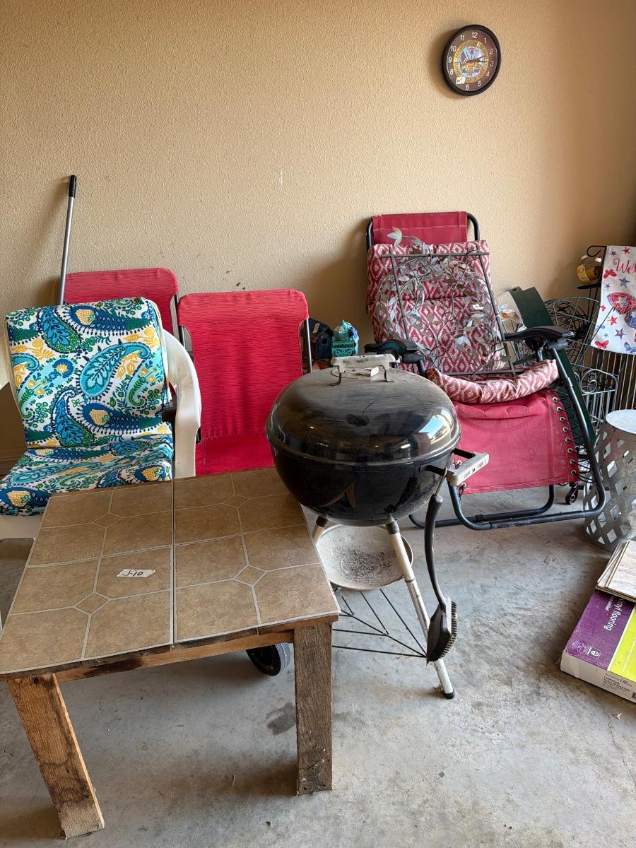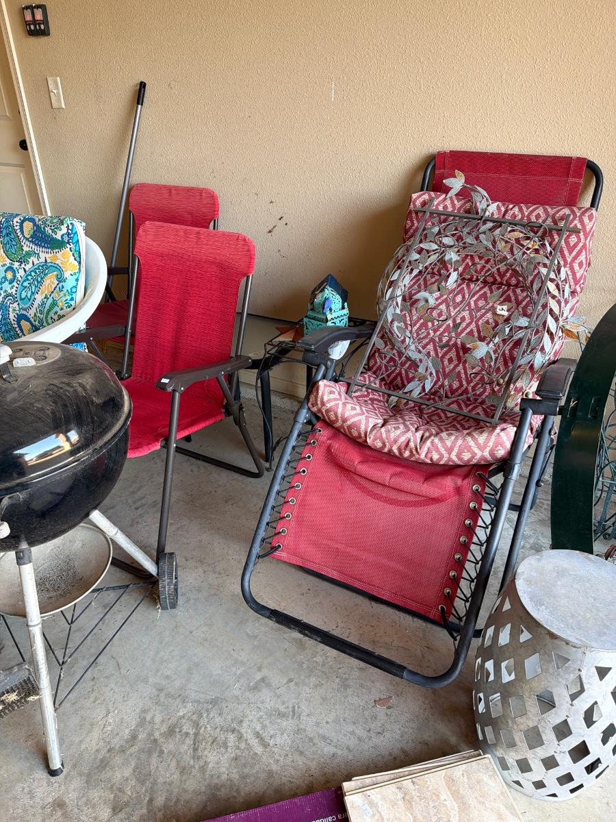 Grill, Outdoor Yard Art, and Chairs.