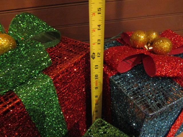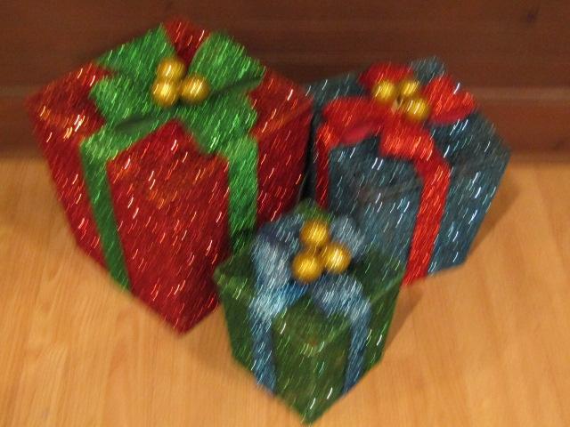 Outdoor Chrismas Decor- Graduated Sized 'Presents'. Lights do not function on middle sized box. Please see pictures.
