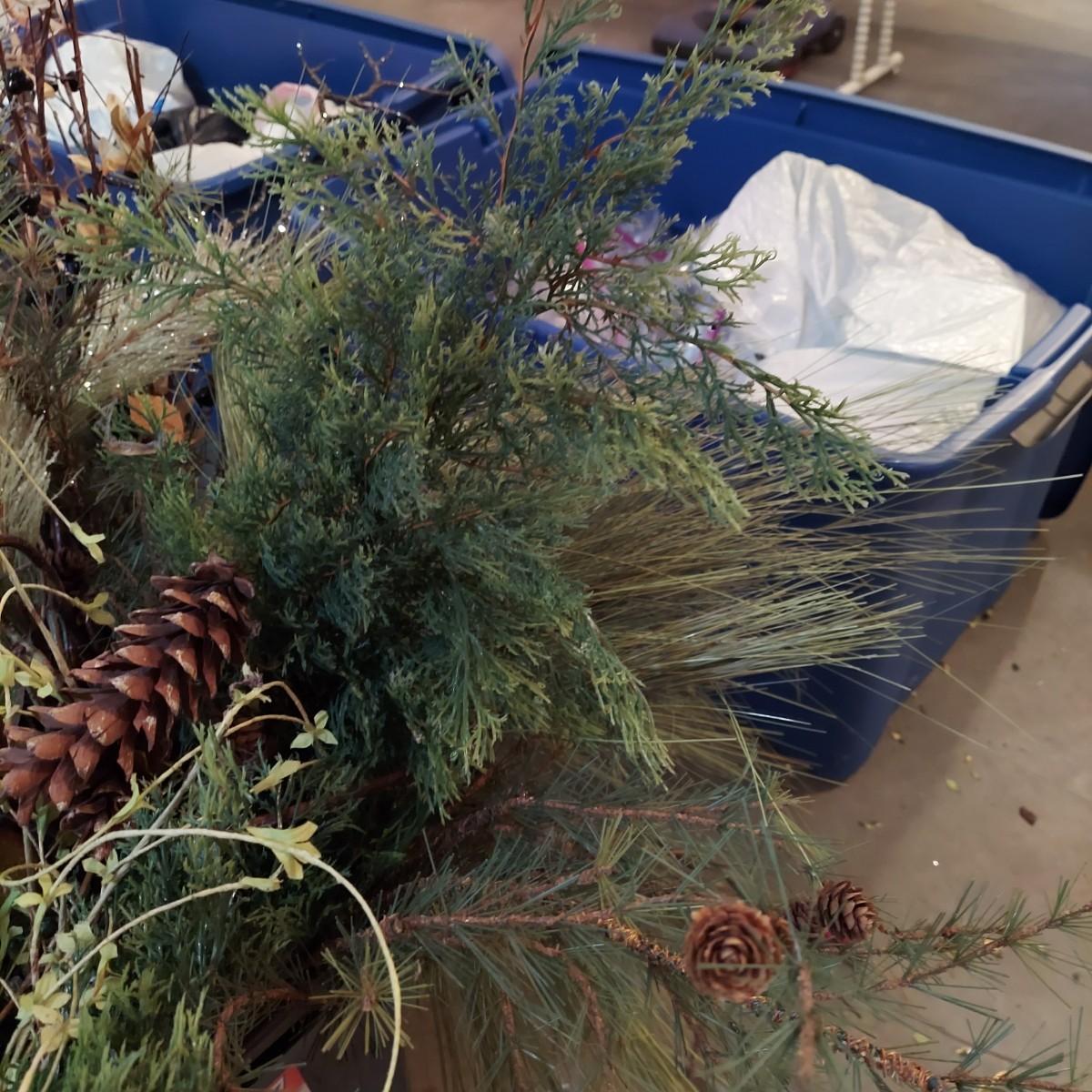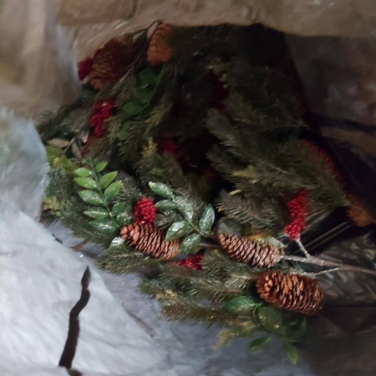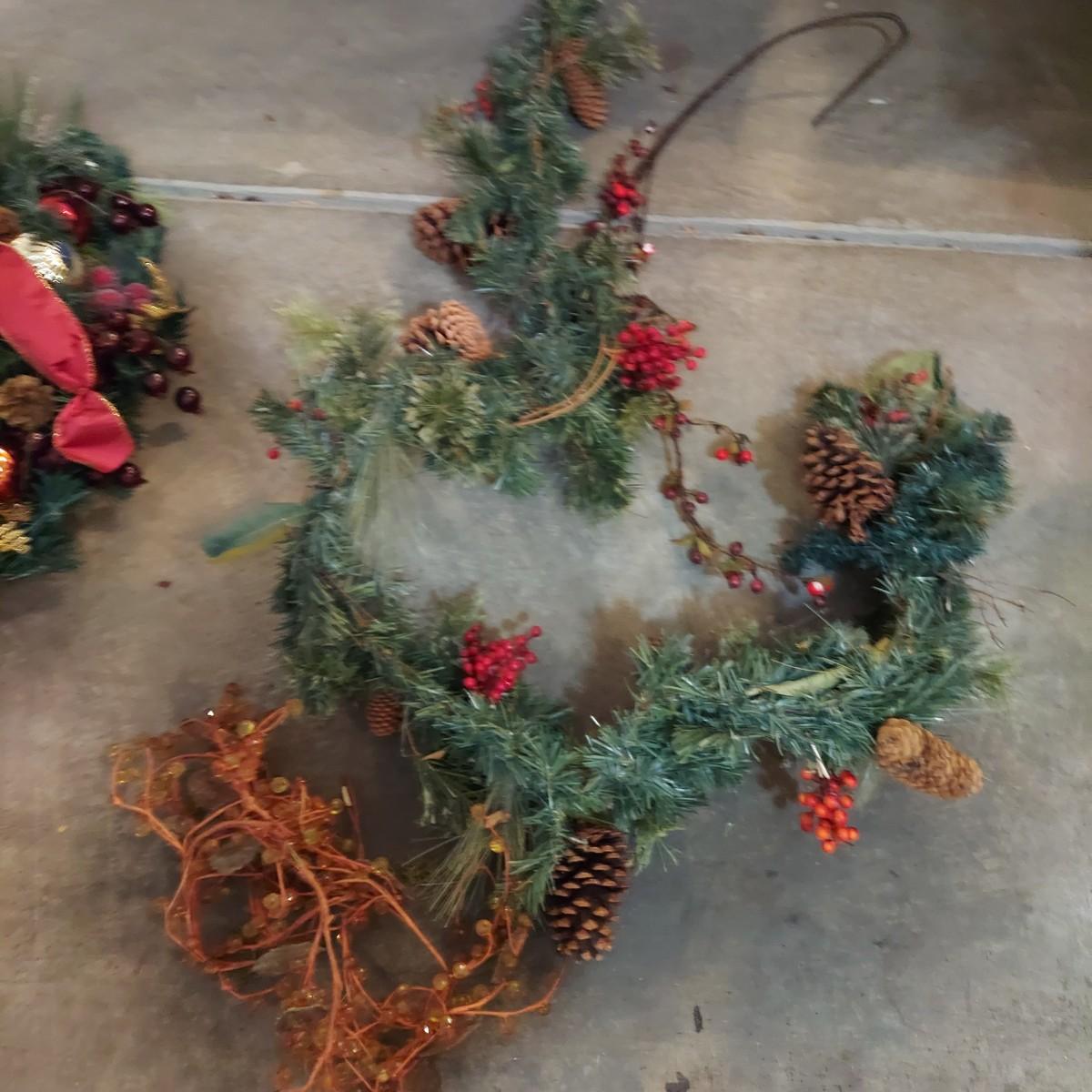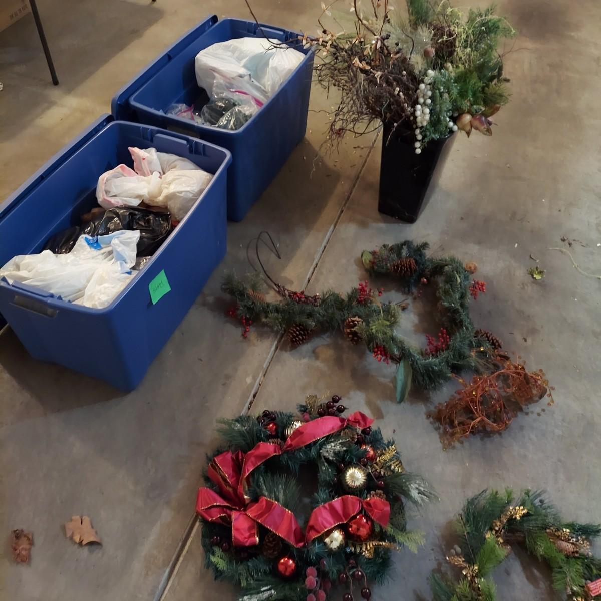 Lot includes more than two large bins of outdoor Christmas decor and lights. There are two wreaths, several garland pieces and many floral picks as well as Christmas lights. All are faux florals/plants. Please see photos for details. Local Pickup Only