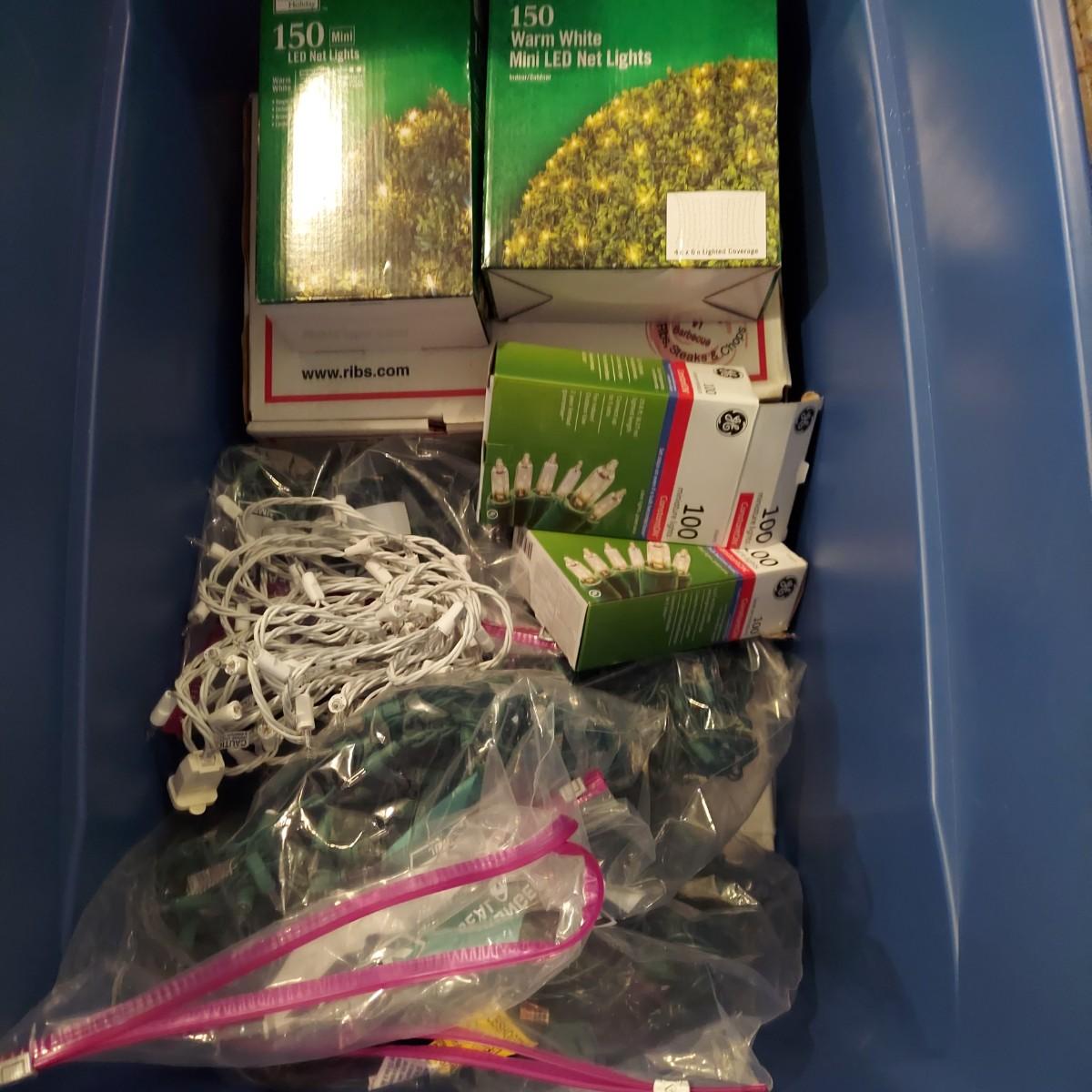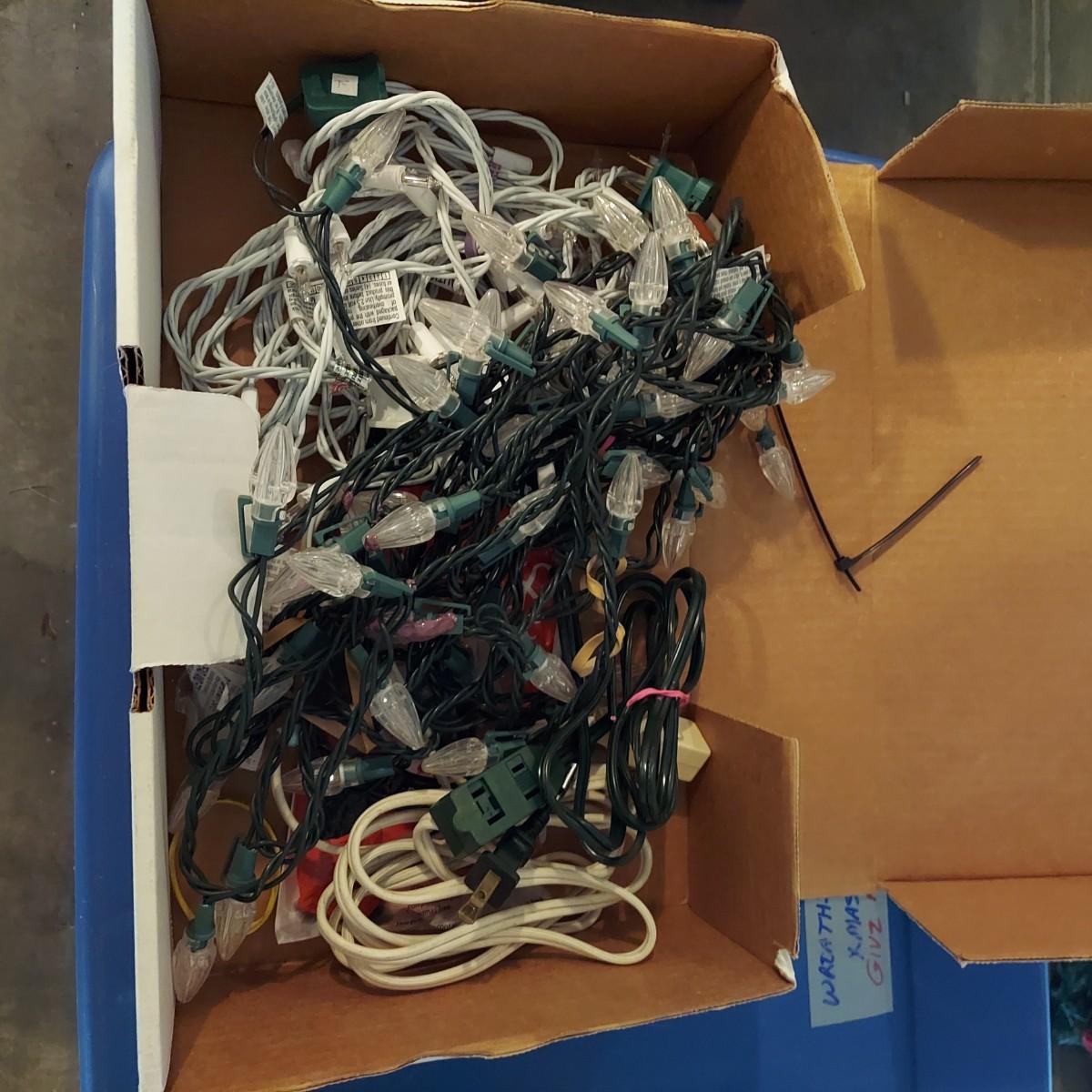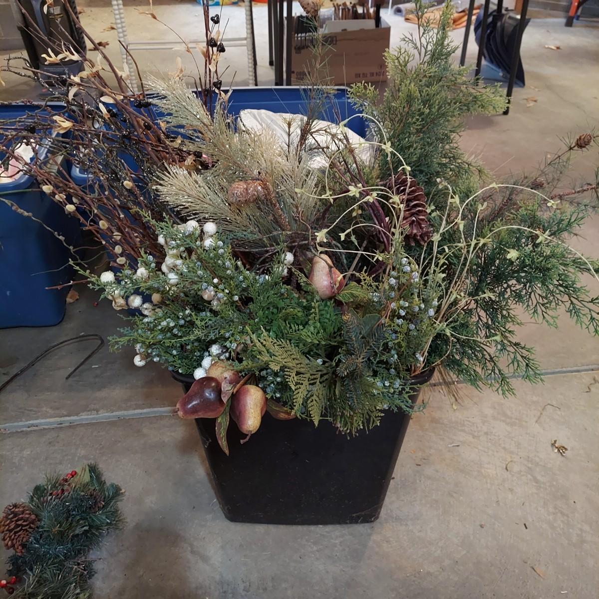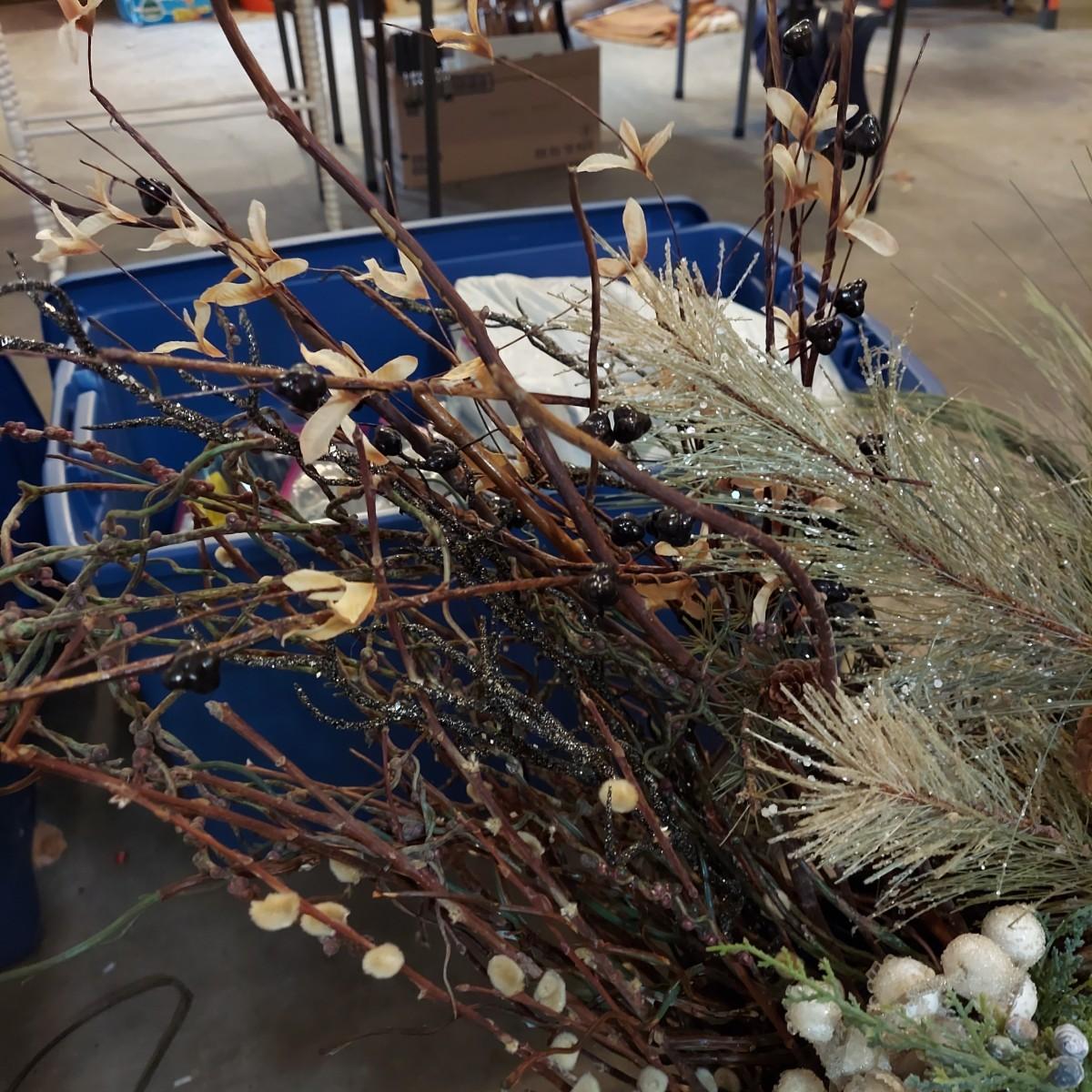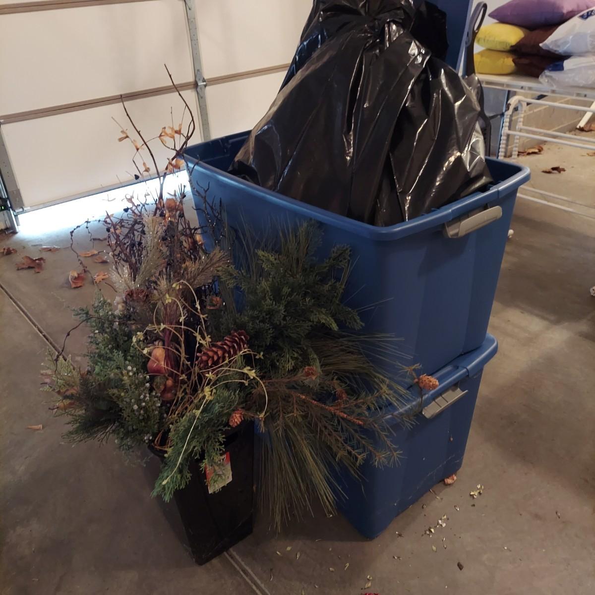 Lot includes more than two large bins of outdoor Christmas decor and lights. There are two wreaths, several garland pieces and many floral picks as well as Christmas lights. All are faux florals/plants. Please see photos for details. Local Pickup Only