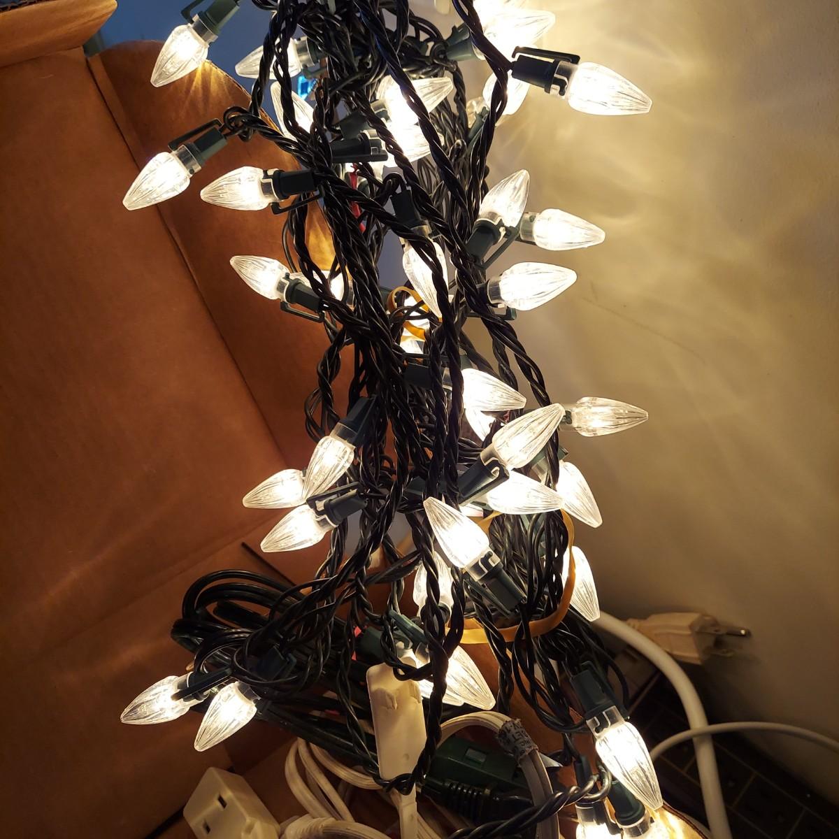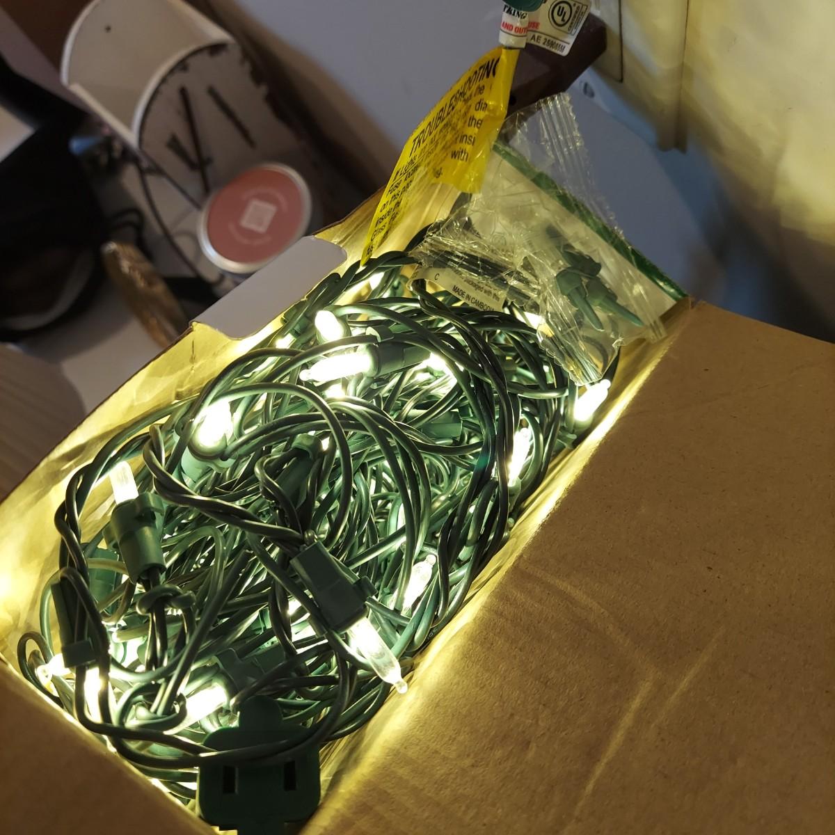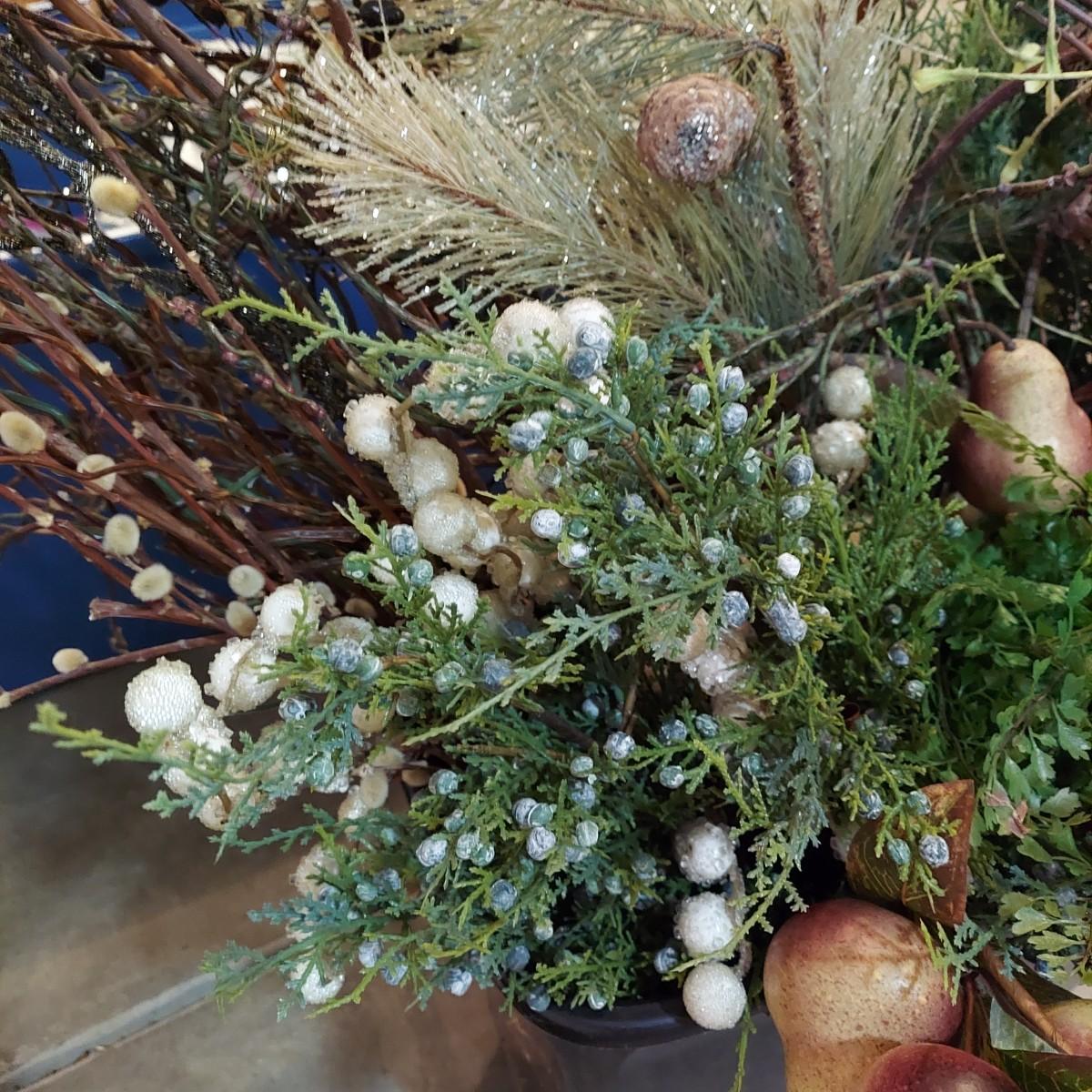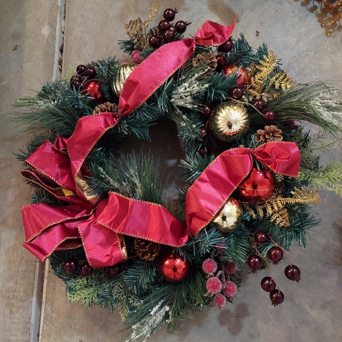 Lot includes more than two large bins of outdoor Christmas decor and lights. There are two wreaths, several garland pieces and many floral picks as well as Christmas lights. All are faux florals/plants. Please see photos for details. Local Pickup Only