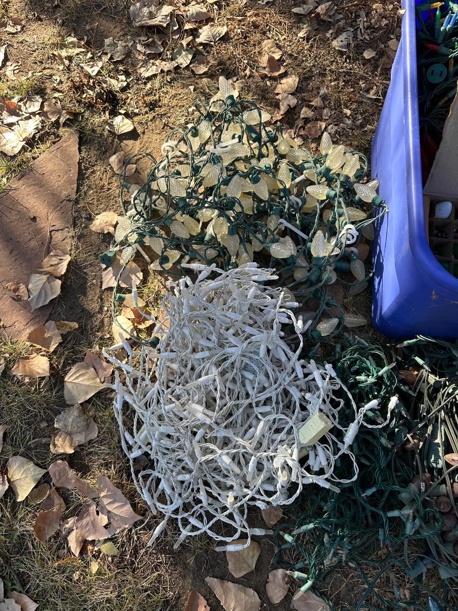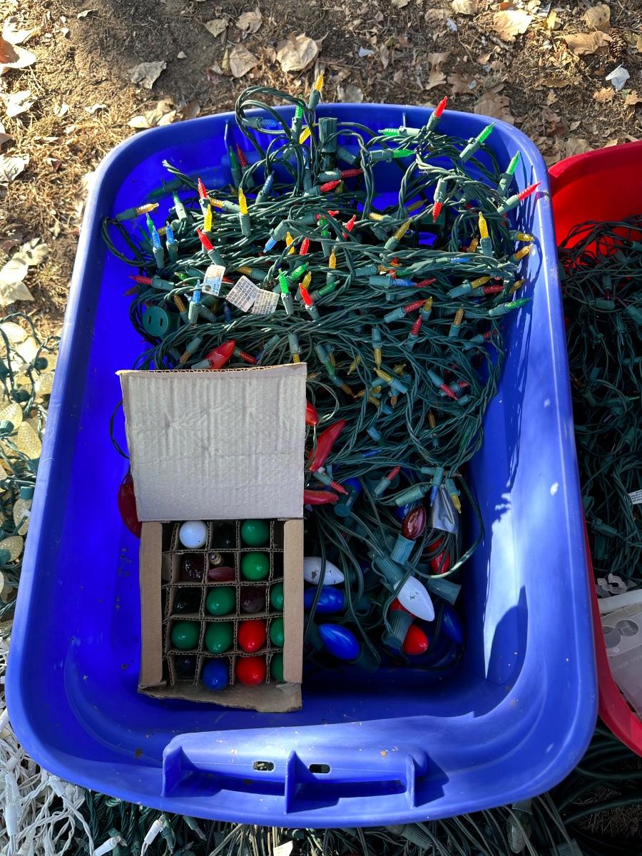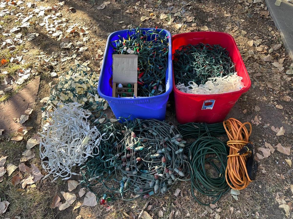 VARIOUS OUTDOOR CHRISTMAS LIGHTS, EXTENSION CORDS AND TOTES