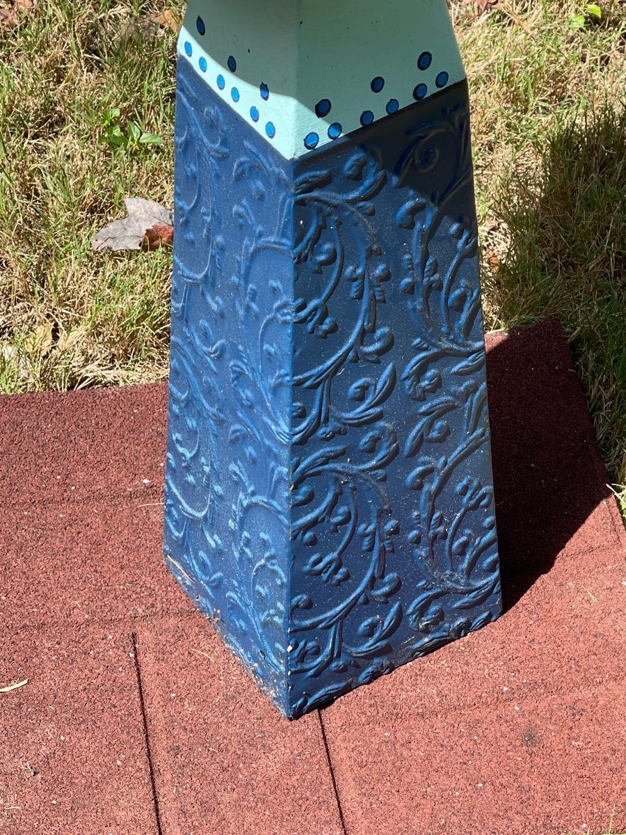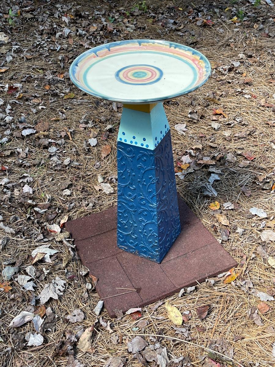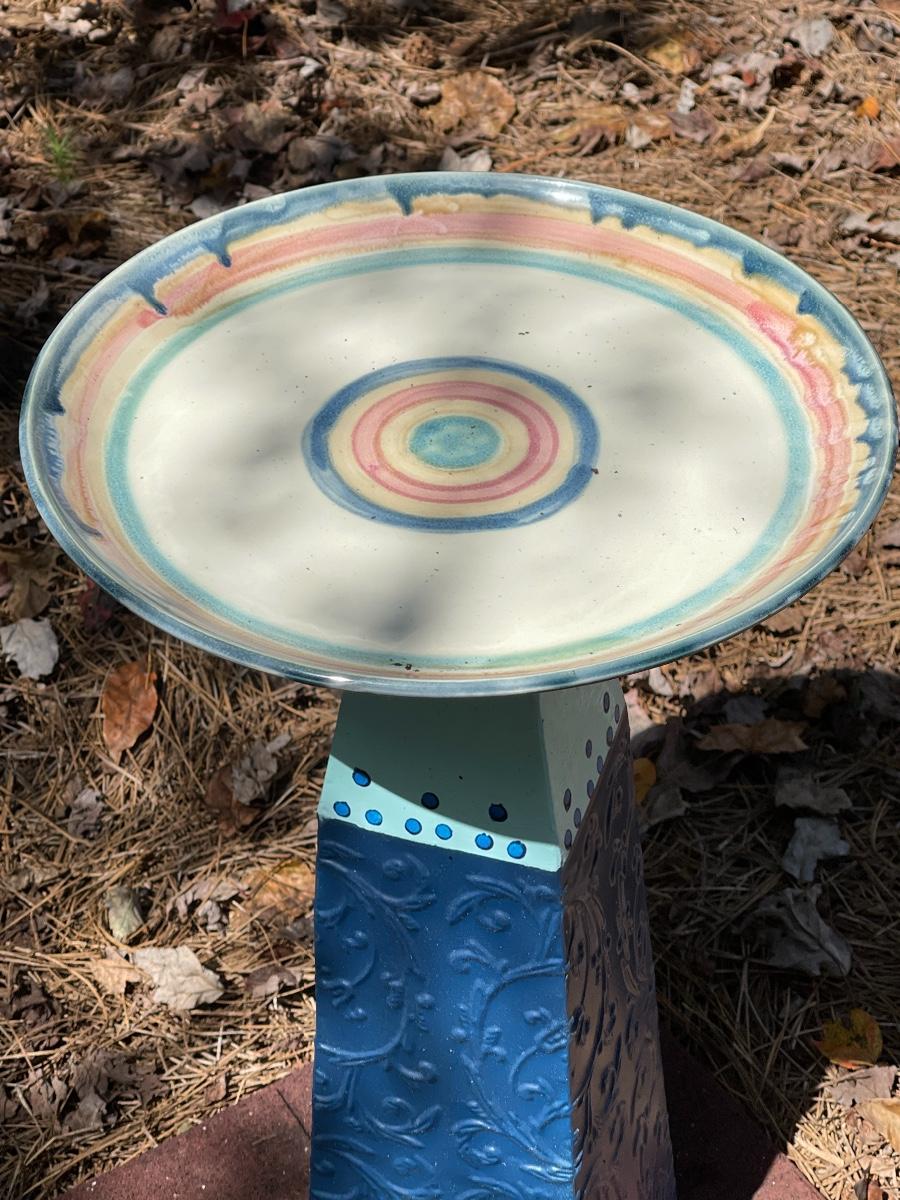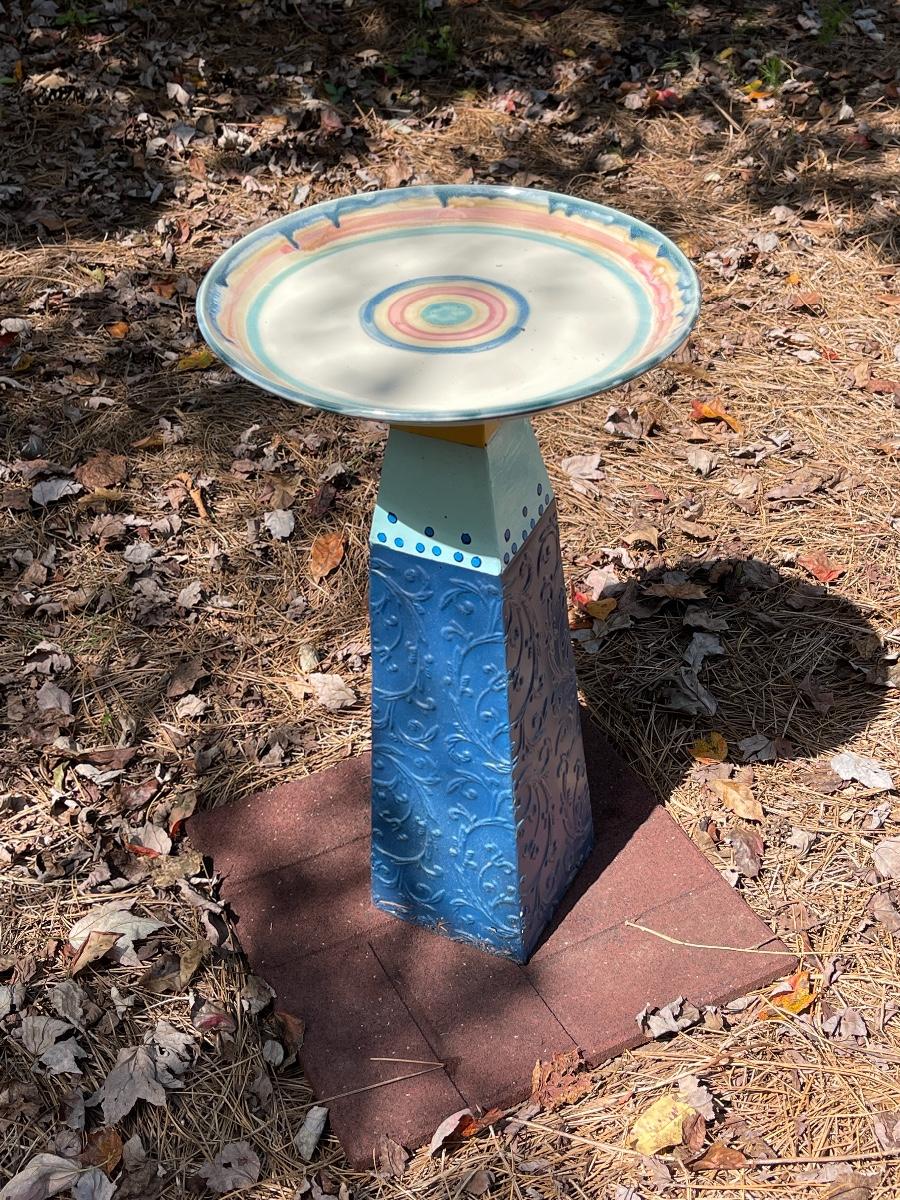 Adorable Handmade Birdbath made with a platter and Weighted Metal Bottom