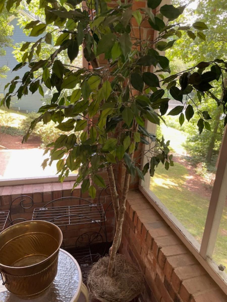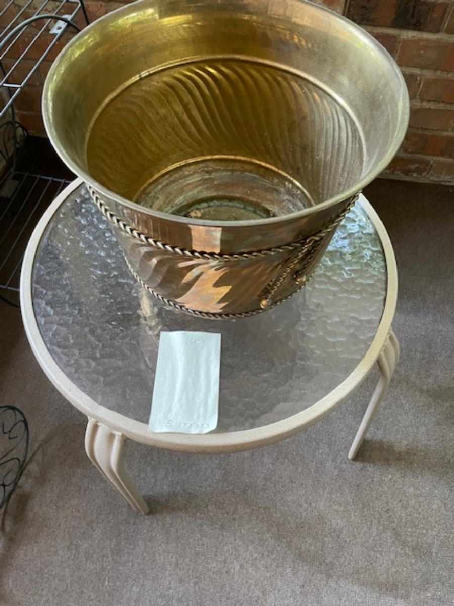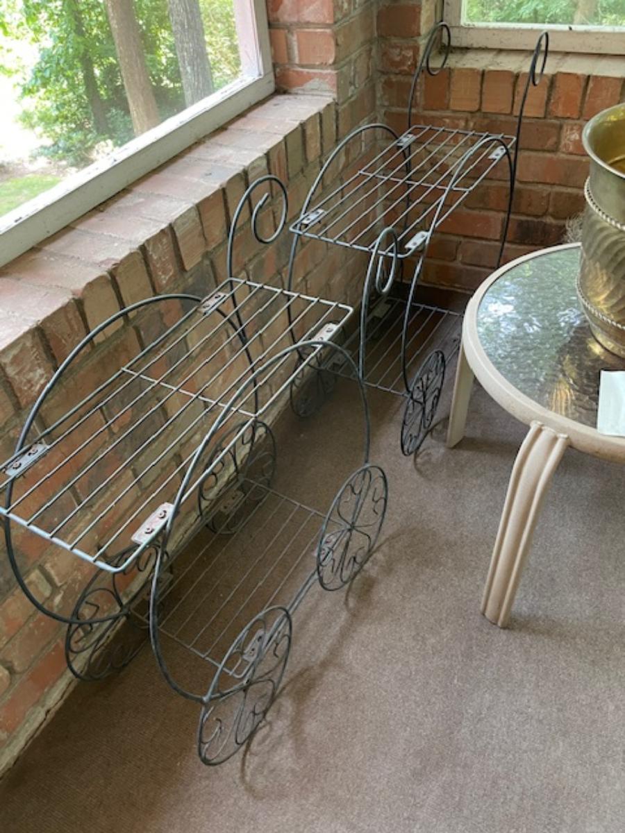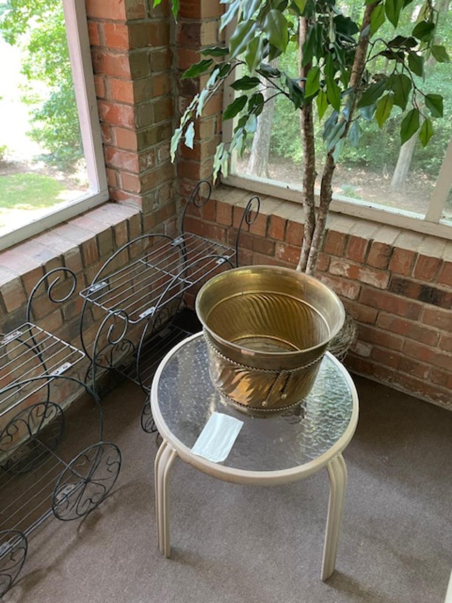2 black metal plant stands, outdoor side table, brass container & artificial tree