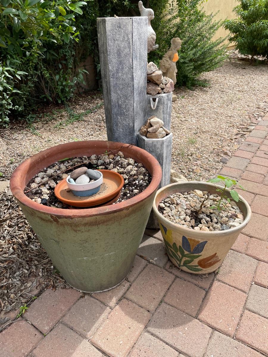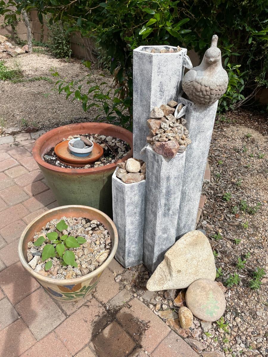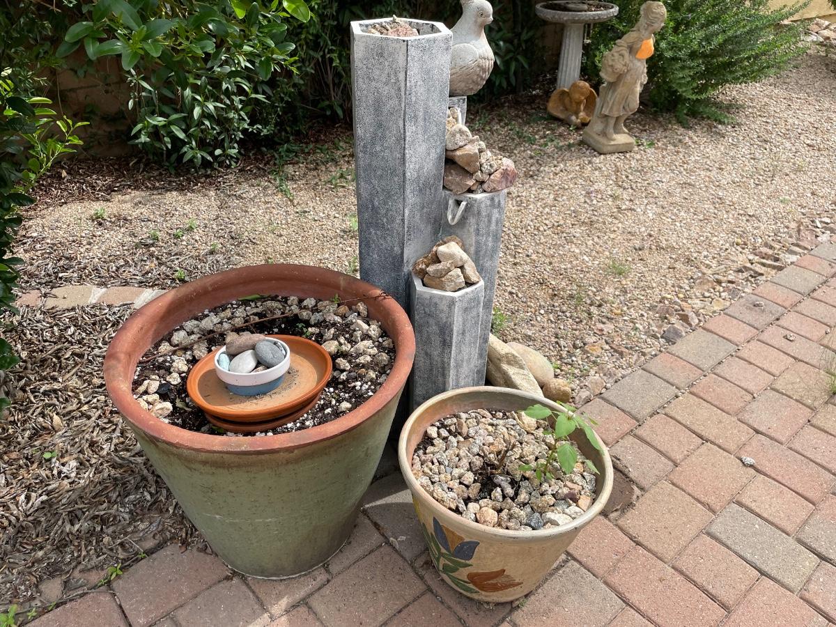 An assortment of outdoor decor items including a ceramic multi-tiered ceramic decorative display piece approx 3 feet in height. 2 pots varying in size in good condition