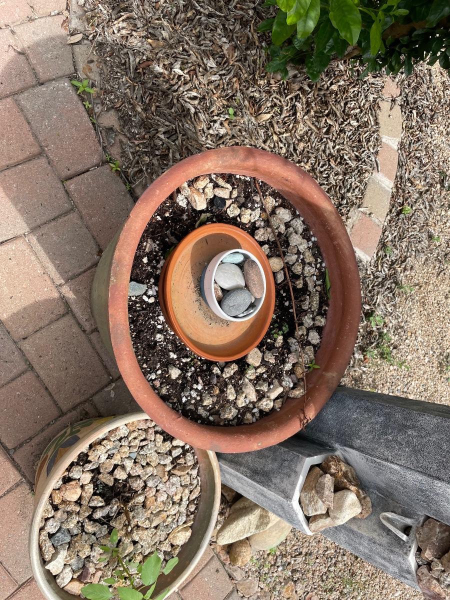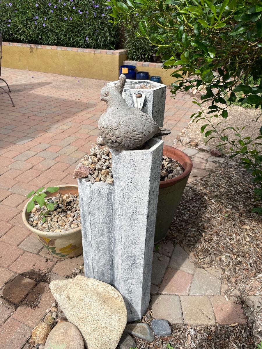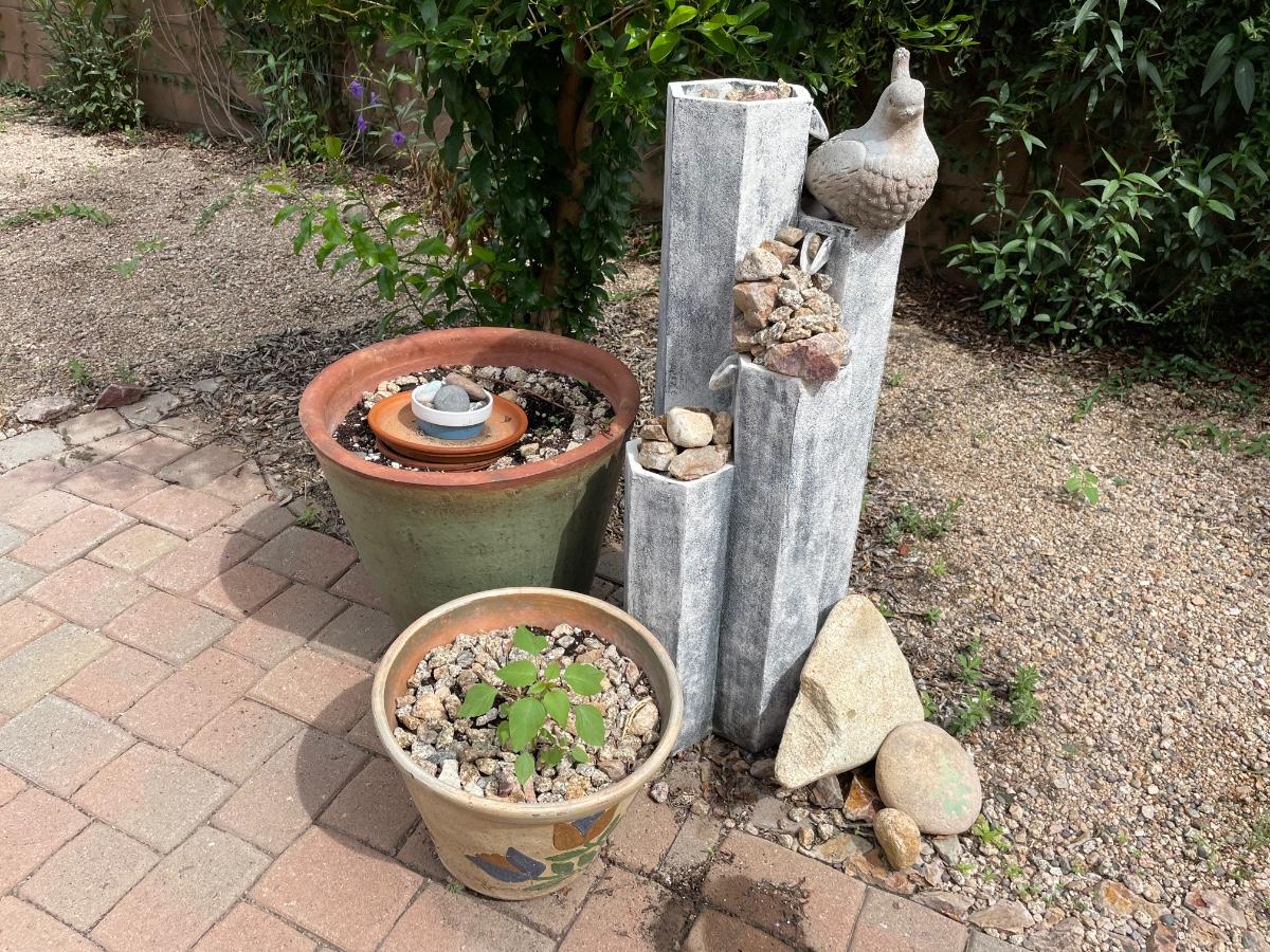 An assortment of outdoor decor items including a ceramic multi-tiered ceramic decorative display piece approx 3 feet in height. 2 pots varying in size in good condition