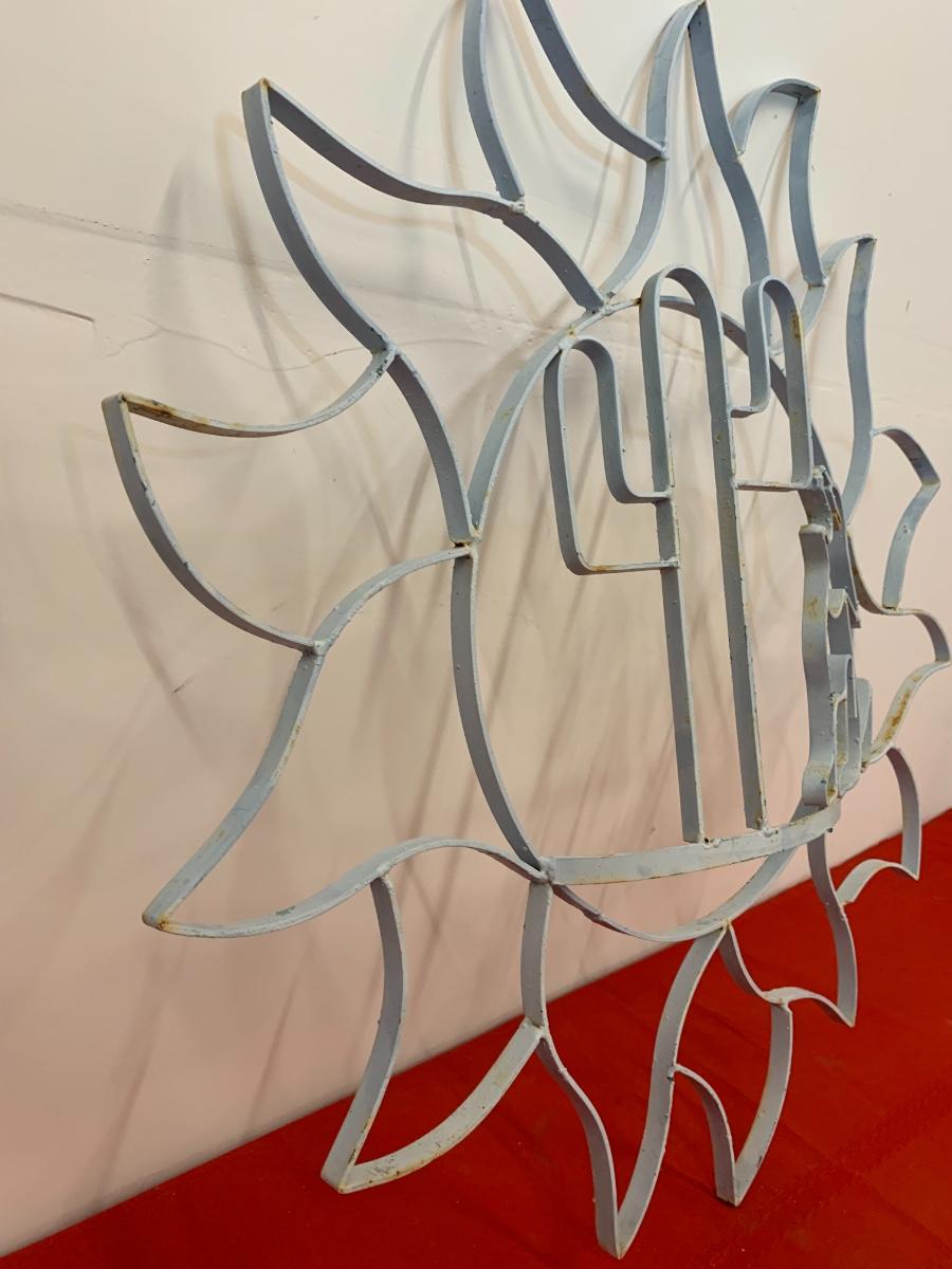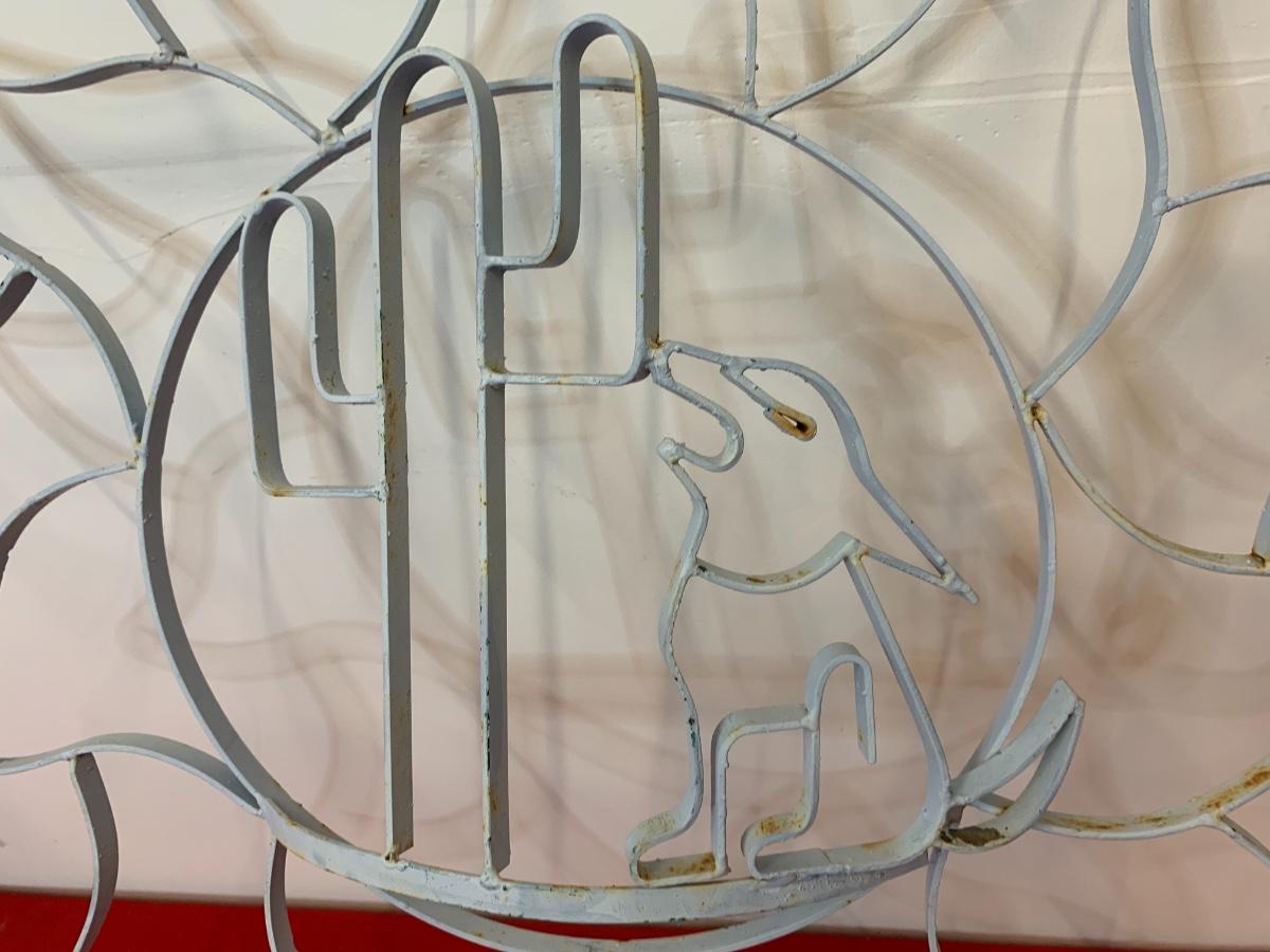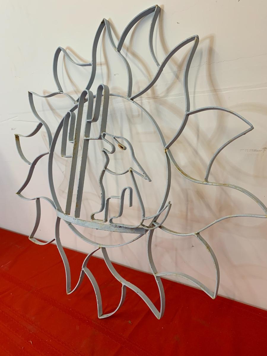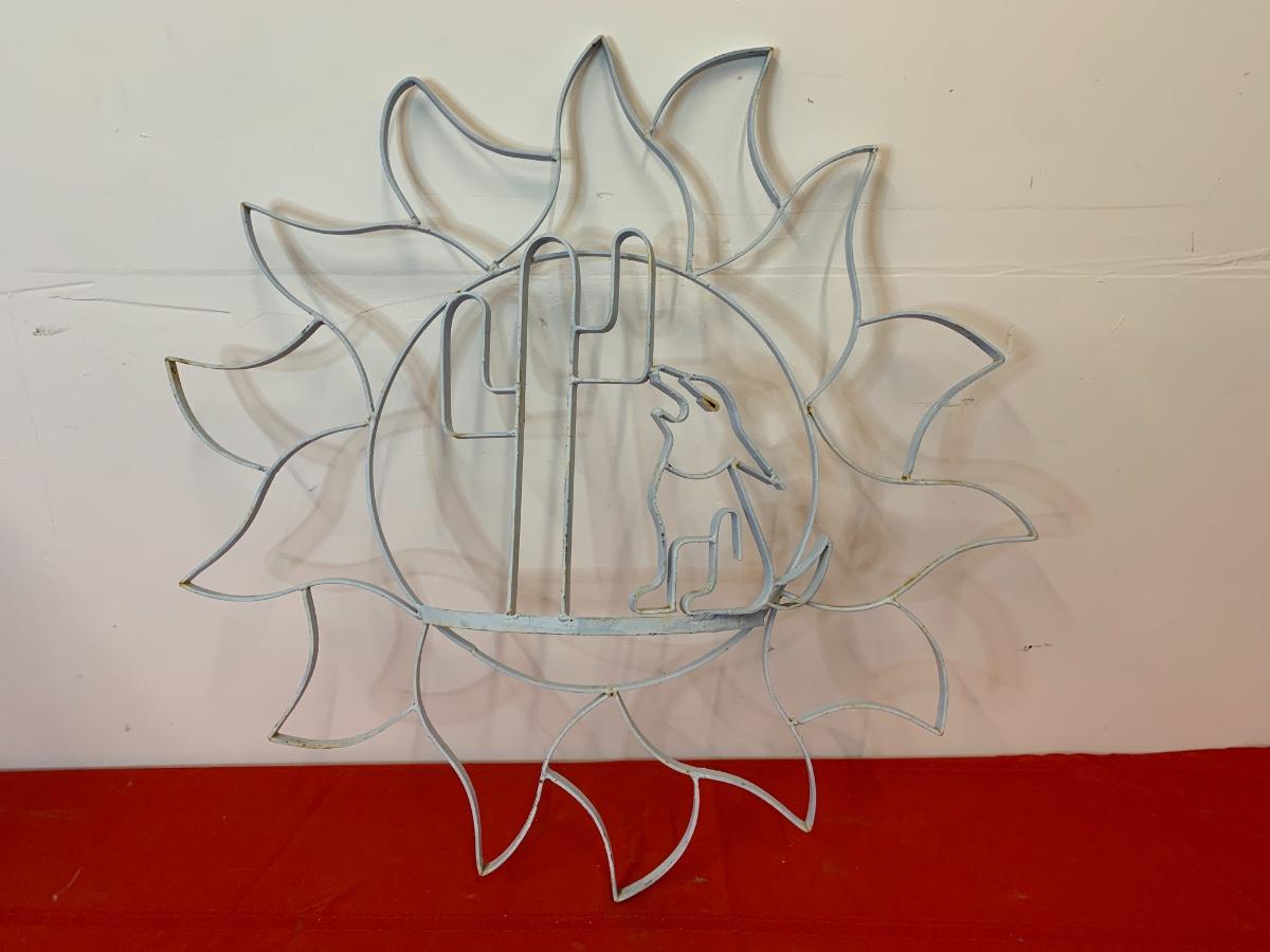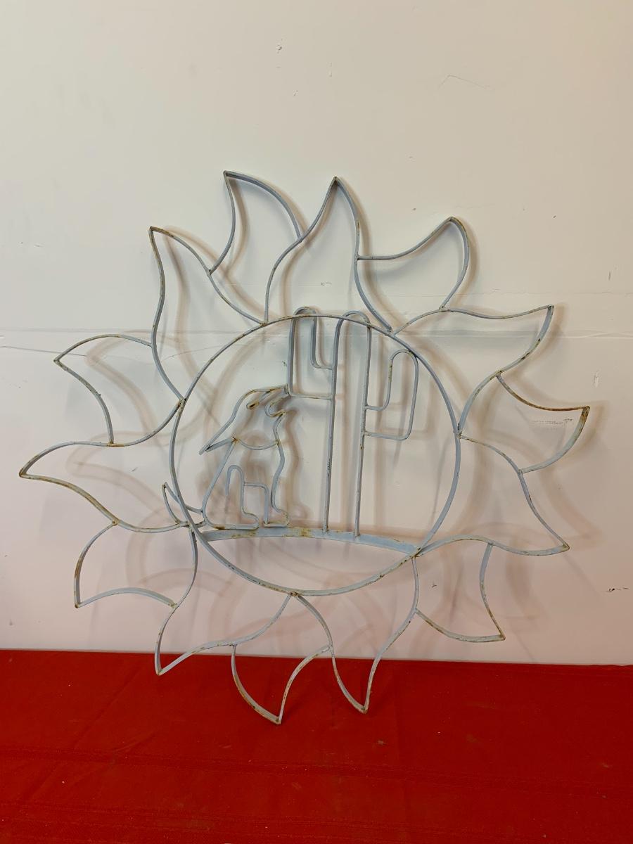 One outdoor metal decor piece depicting a large sun with a saguaro and coyote. (28 inches in height, 28 inches in width)