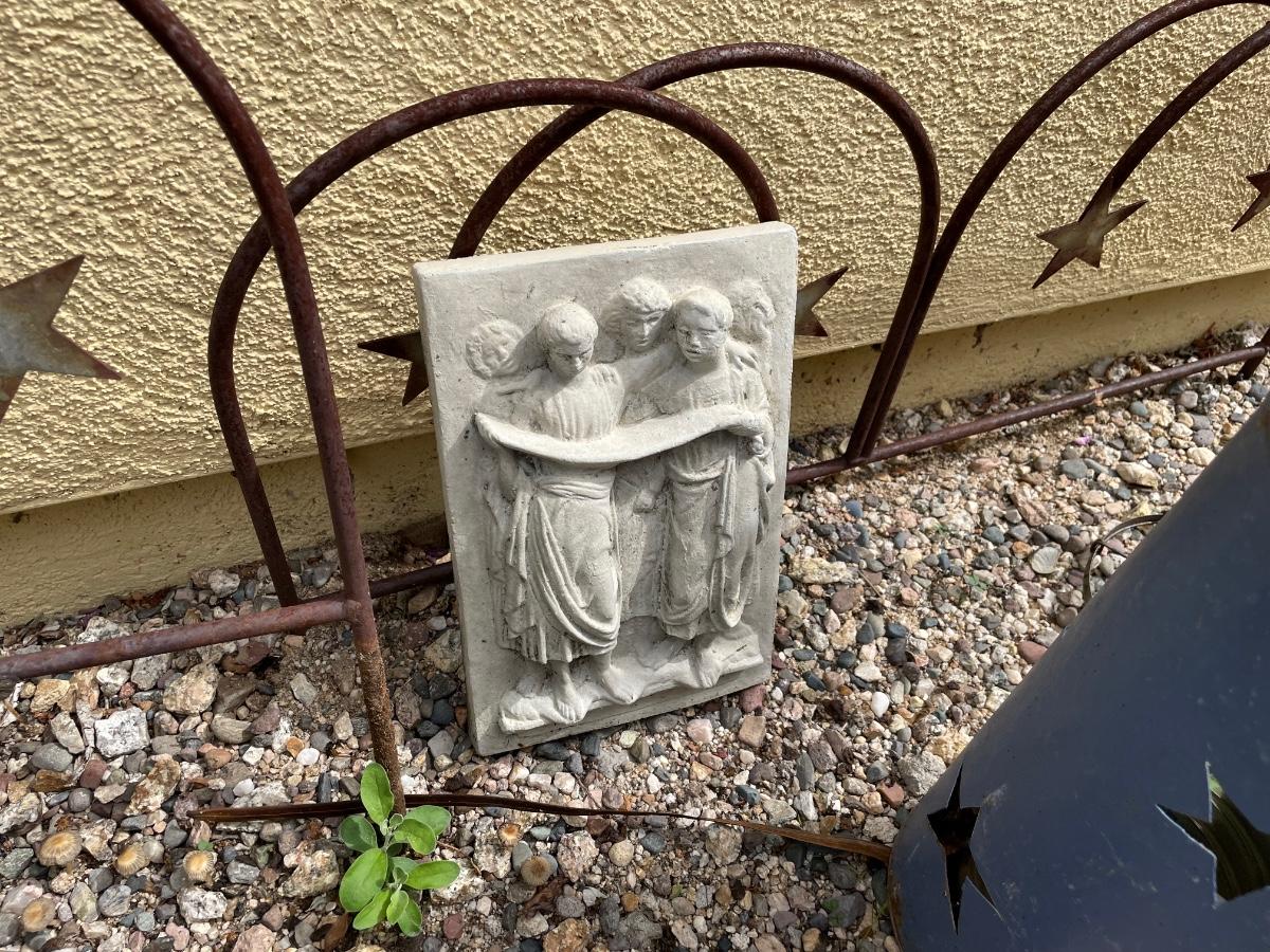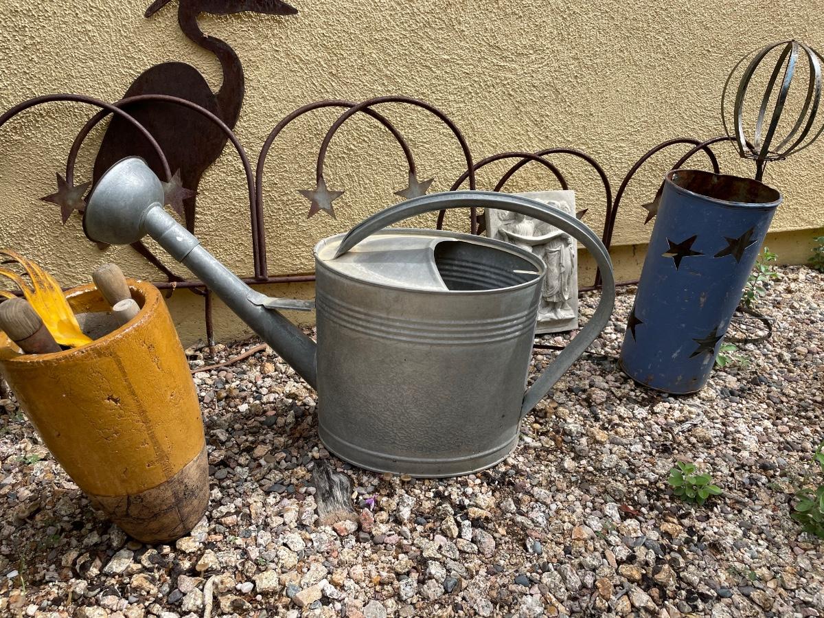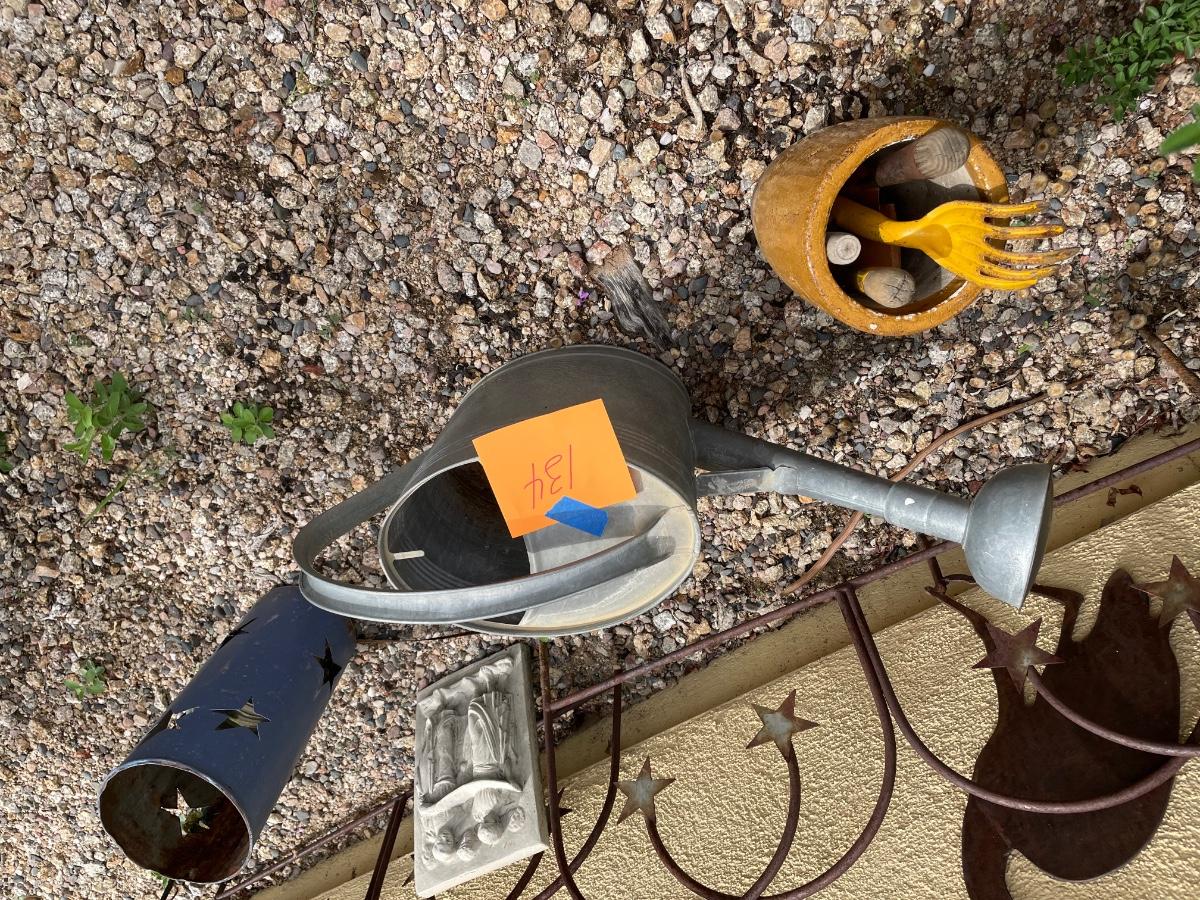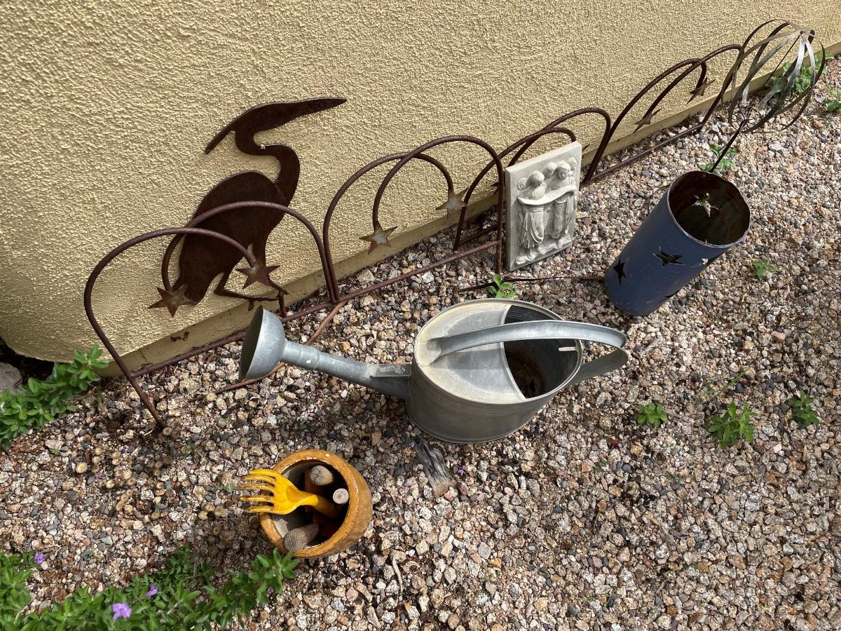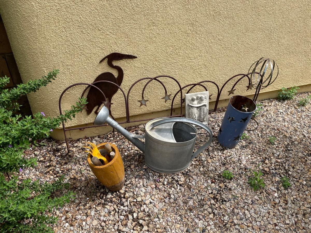 An assortment of outdoor decor items including pots, iron decorative border fencing and more