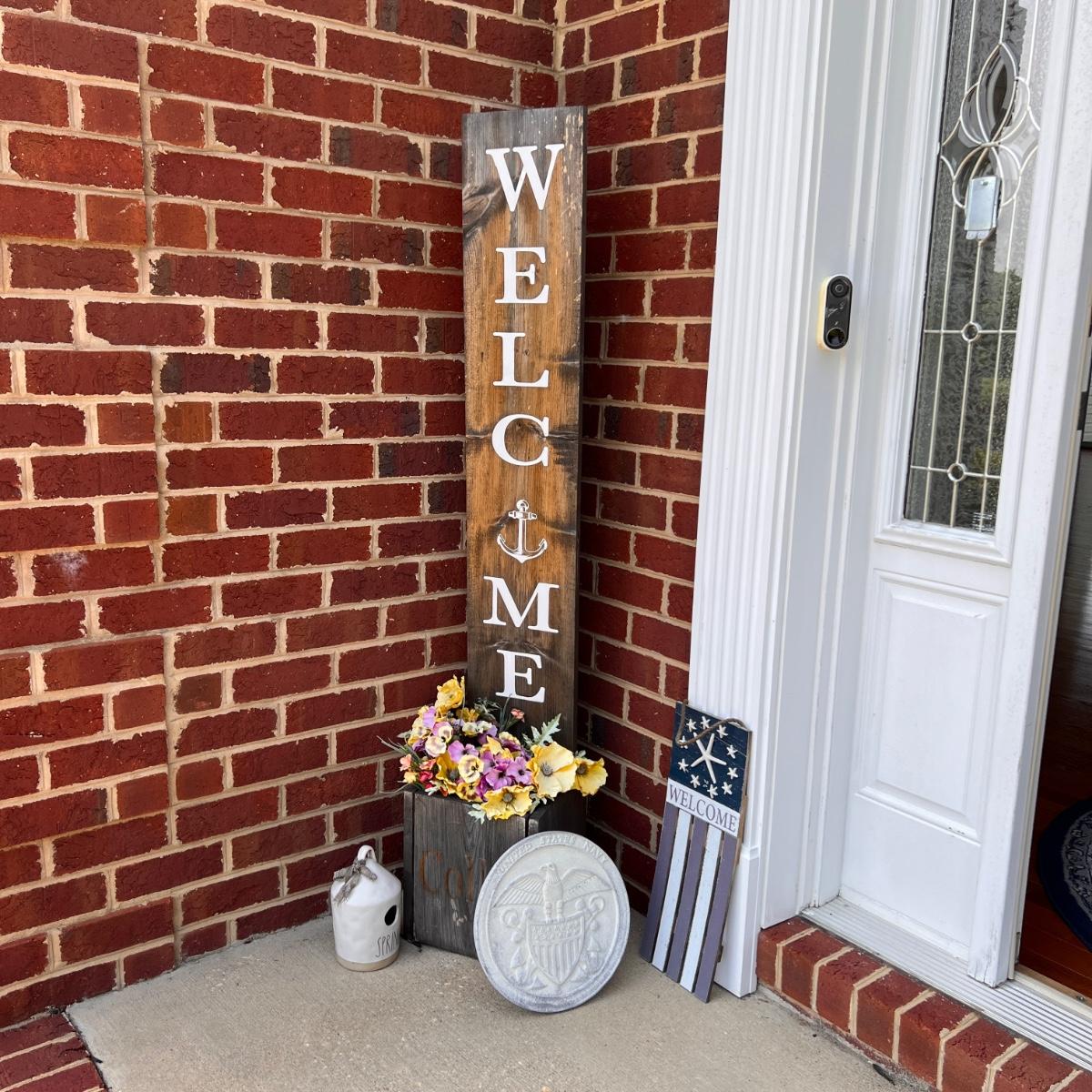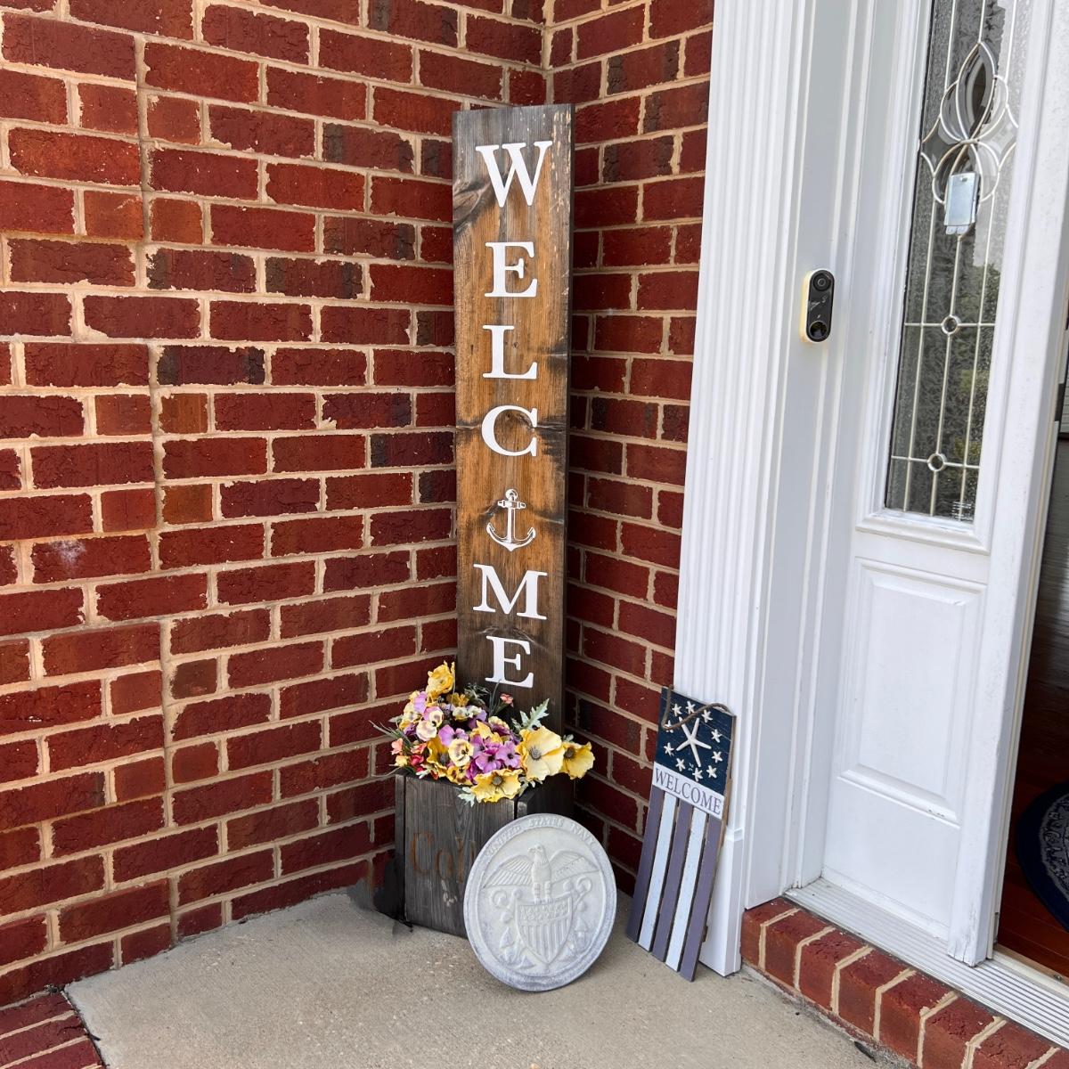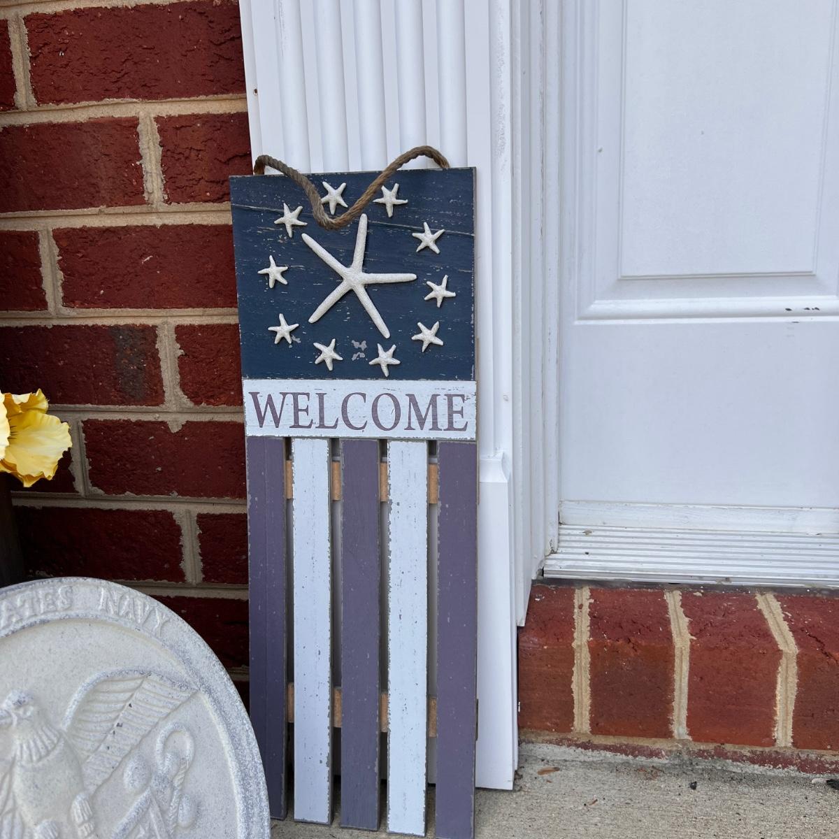 Tall wooden WELCOME porch plank planter. The base had the owners name in vinyl stickers but has been removed. The outline is still there but can easily be painted over. Wooden decorative flag star fish wall hanging, white United States Navy metal garden stone.