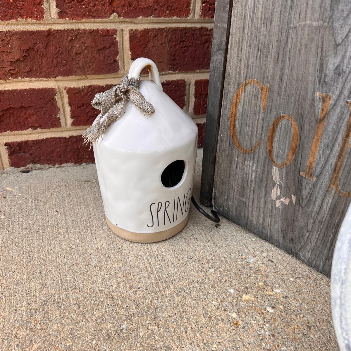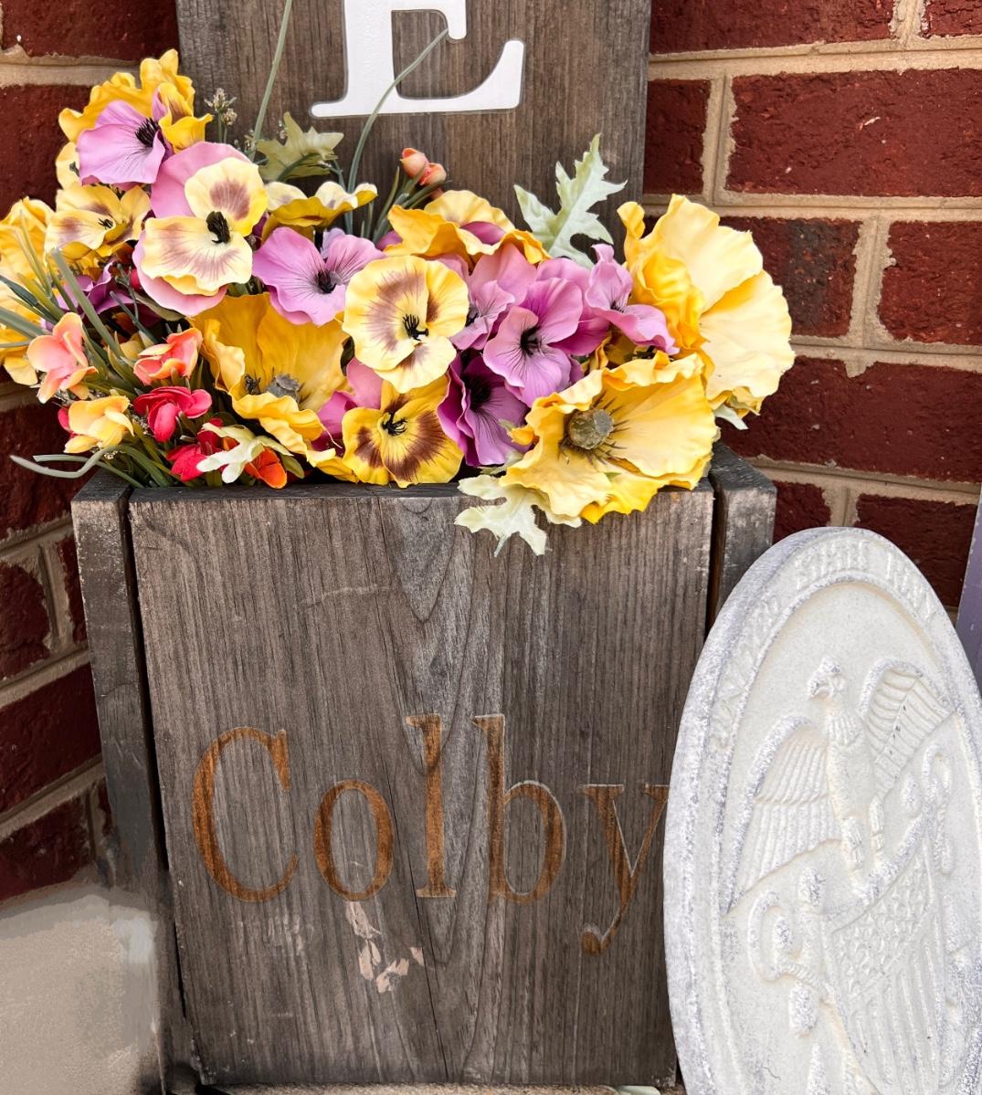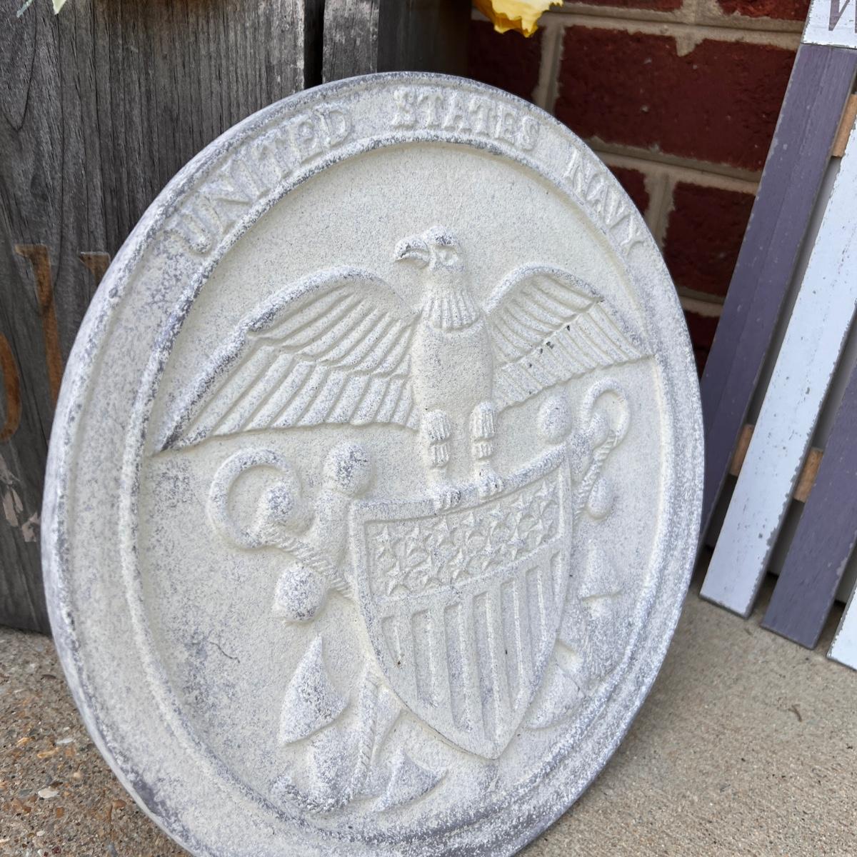Tall wooden WELCOME porch plank planter. The base had the owners name in vinyl stickers but has been removed. The outline is still there but can easily be painted over. Wooden decorative flag star fish wall hanging, white United States Navy metal garden stone.