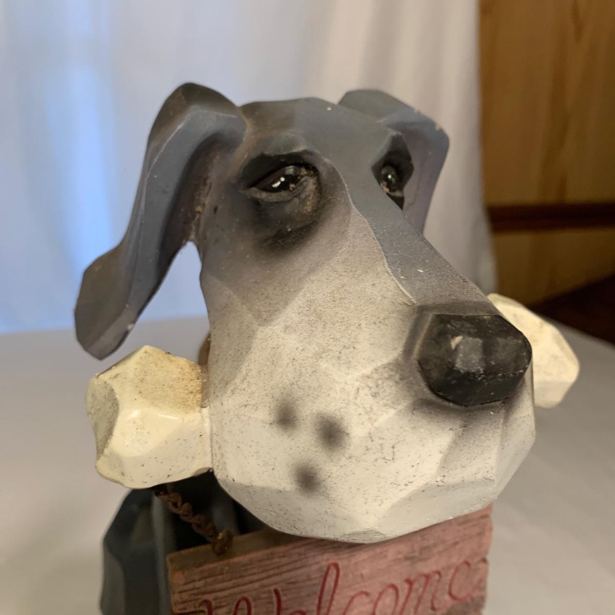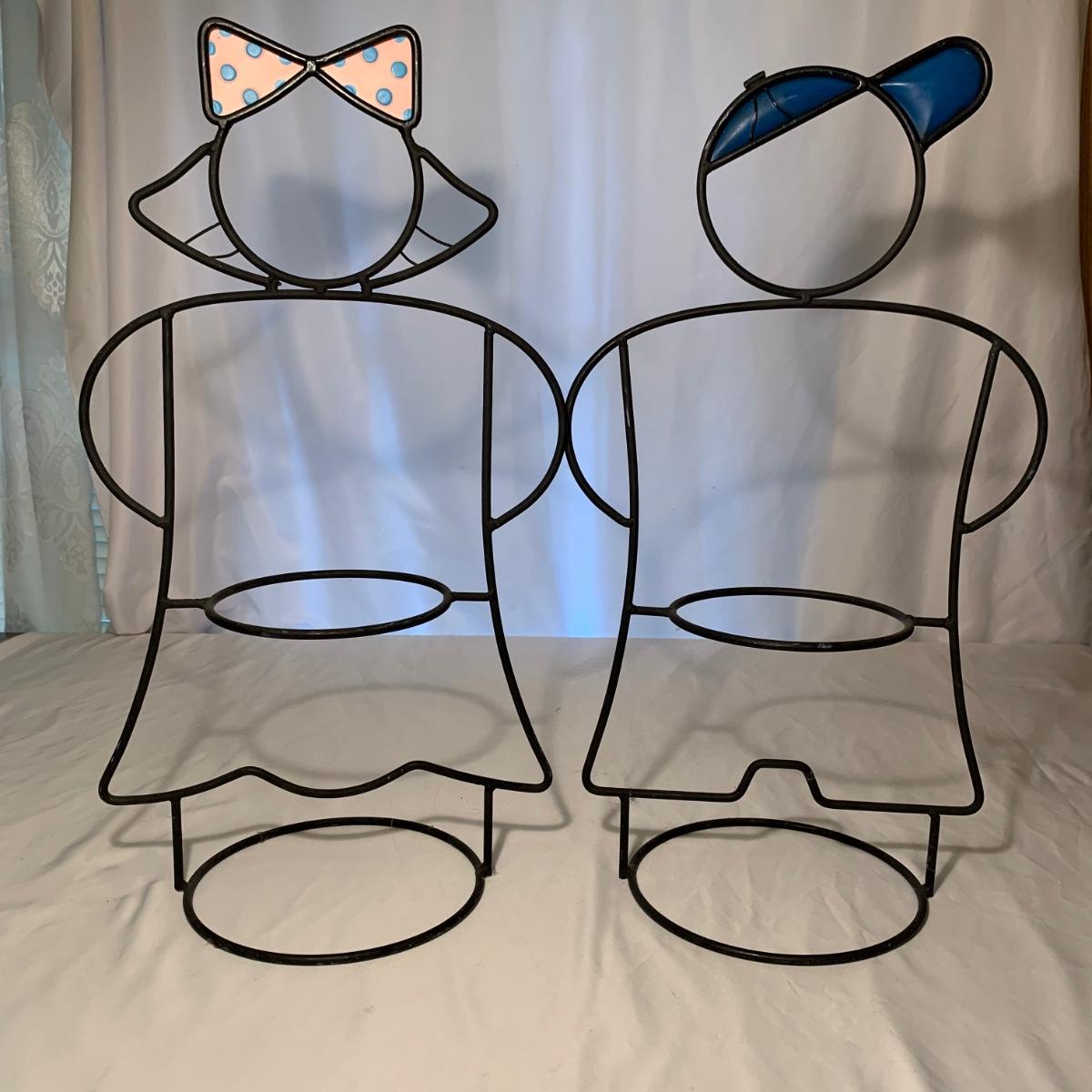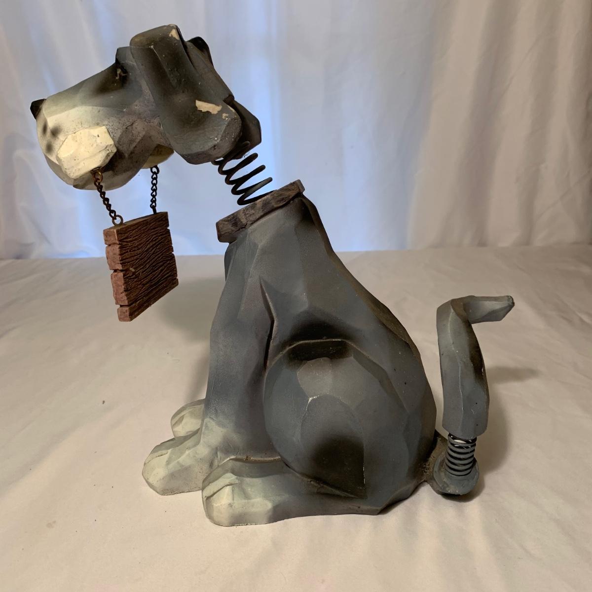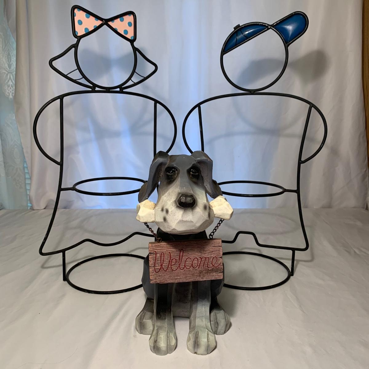 Three items of outdoor decor. One is a dog with a springy bobble head and tail, holding a bone and a welcome sign in his mouth. It’s been on a porch and has gathered some dust from being outside. It’s about 12.5” tall. It feels like it is made of resin. Some paint is chipping. The pot holders are a matching pair metal outline of a boy and a girl. They also have a little dust and superficial wear, but are otherwise in very good condition. They measure about 22” tall. Local pickup only.