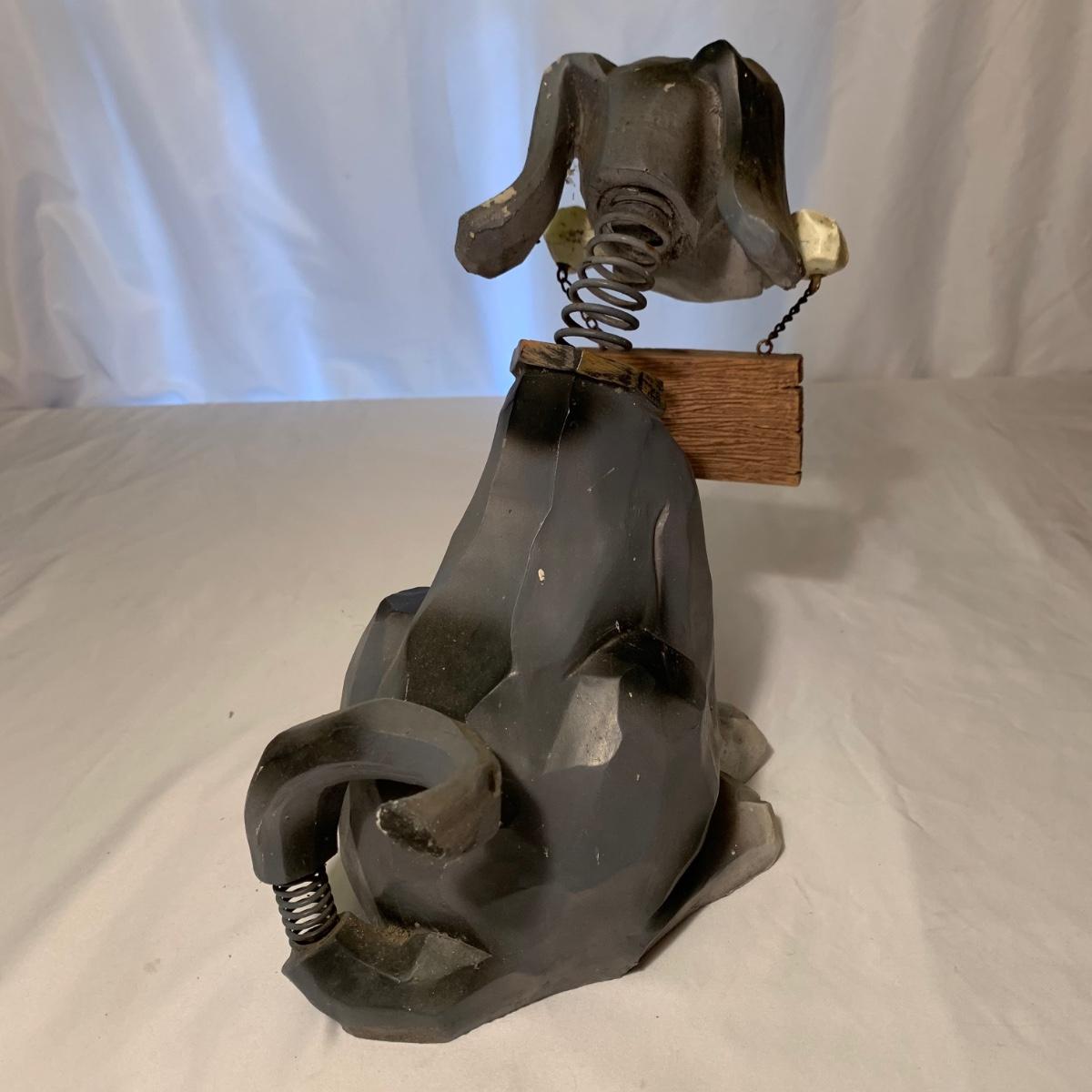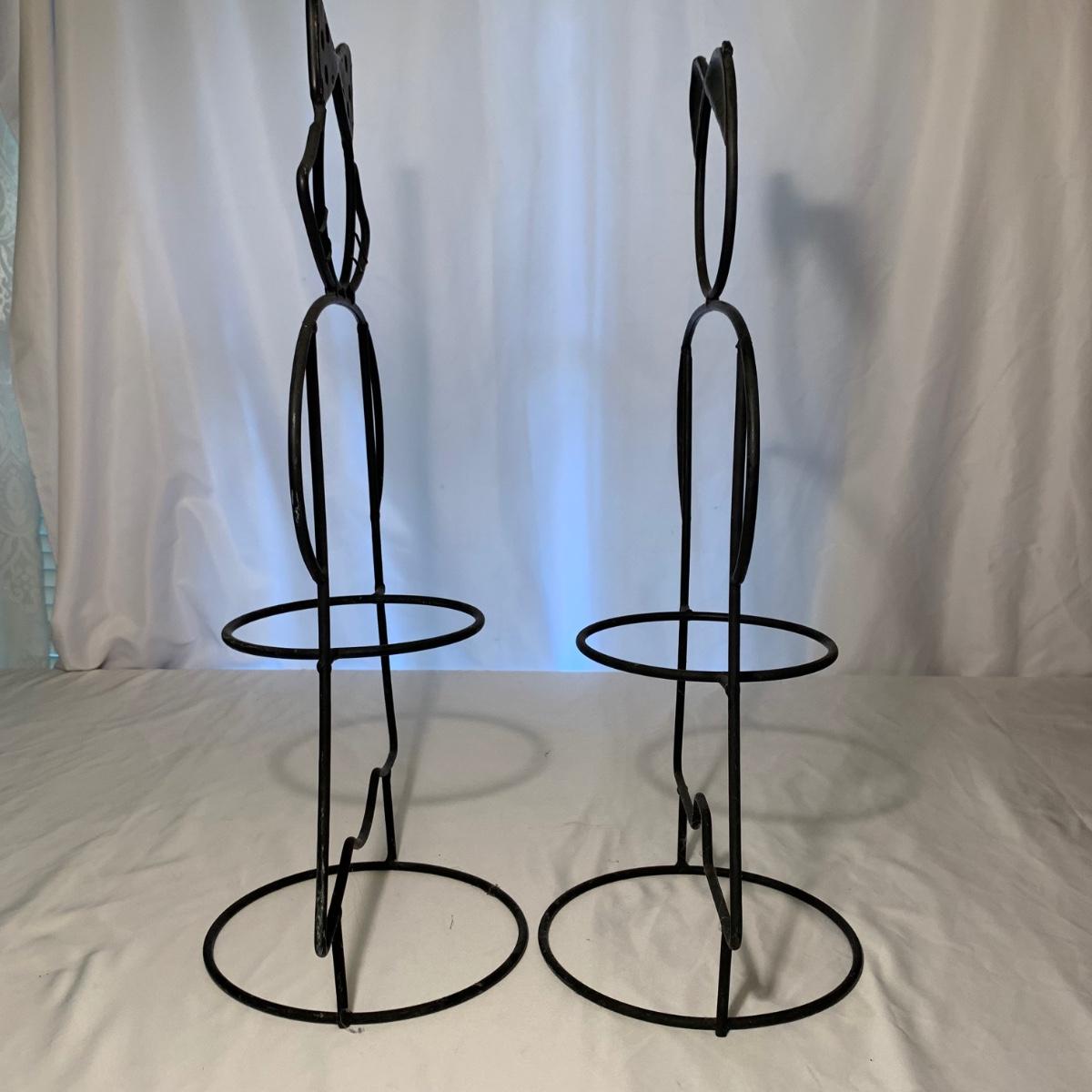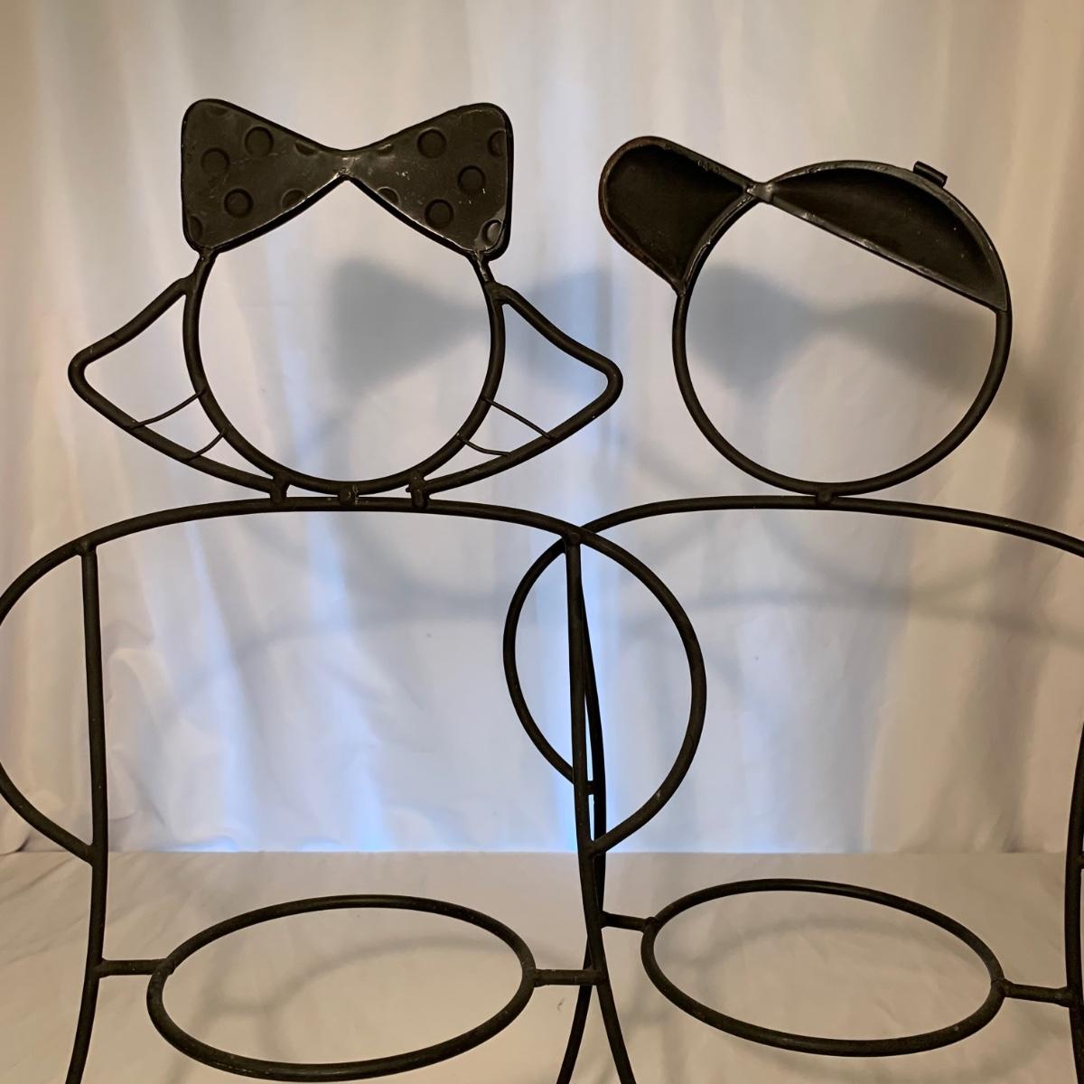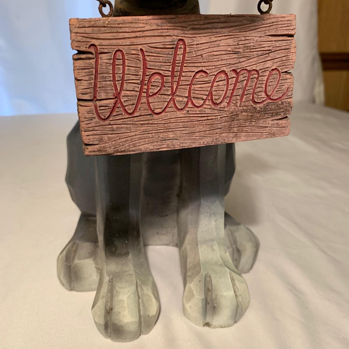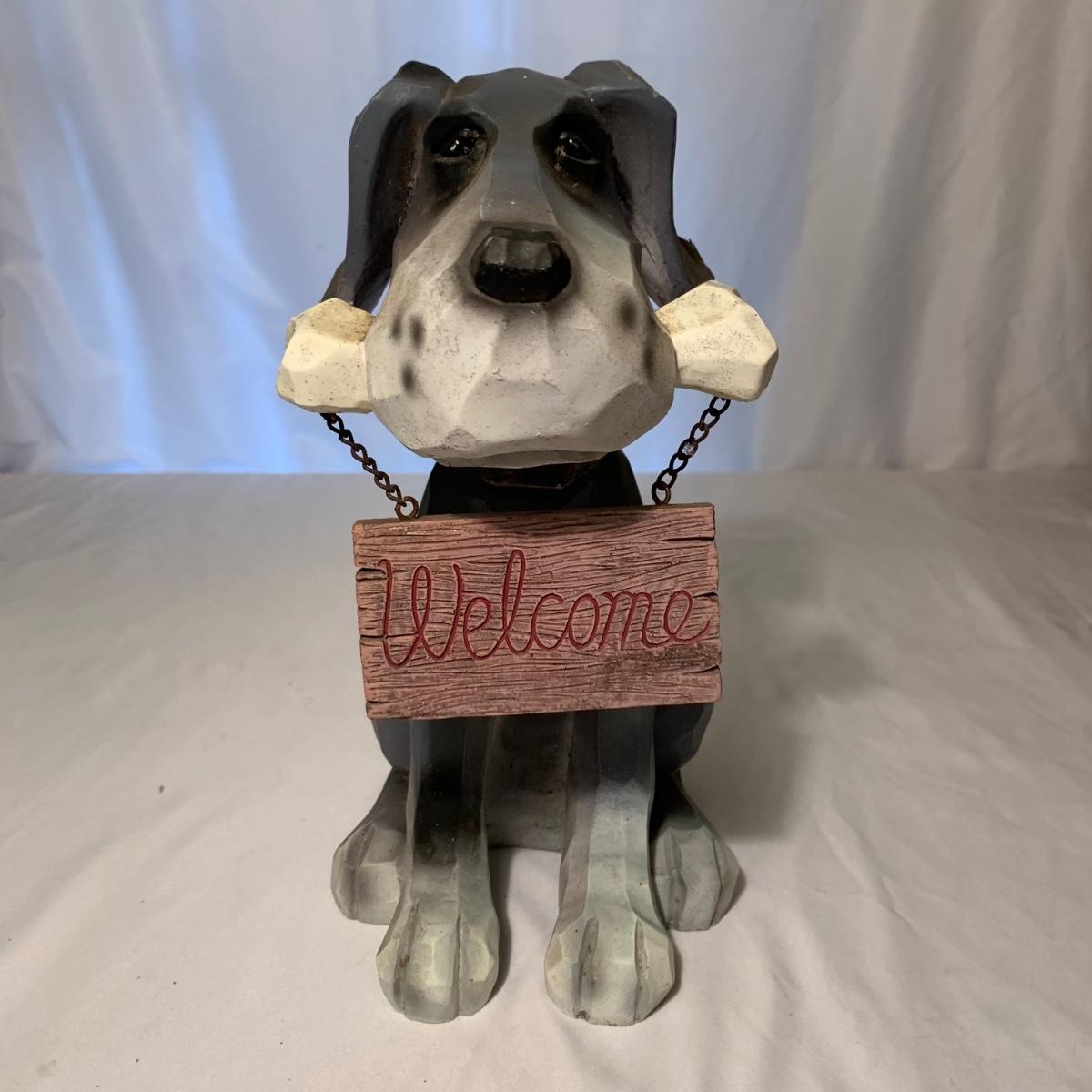 Three items of outdoor decor. One is a dog with a springy bobble head and tail, holding a bone and a welcome sign in his mouth. It’s been on a porch and has gathered some dust from being outside. It’s about 12.5” tall. It feels like it is made of resin. Some paint is chipping. The pot holders are a matching pair metal outline of a boy and a girl. They also have a little dust and superficial wear, but are otherwise in very good condition. They measure about 22” tall. Local pickup only.