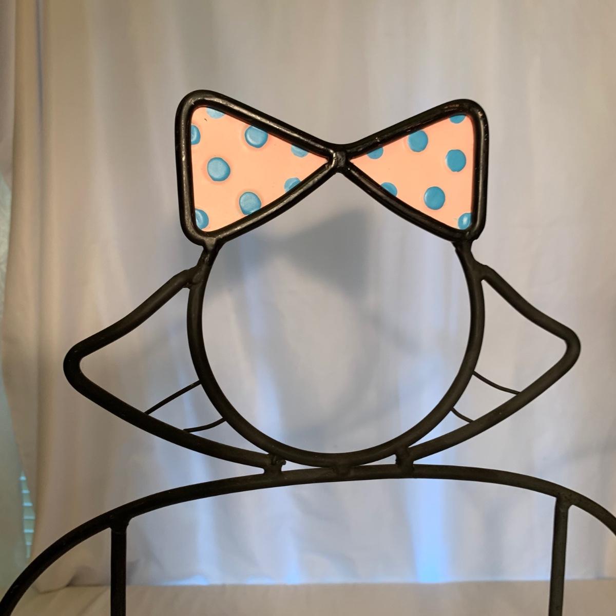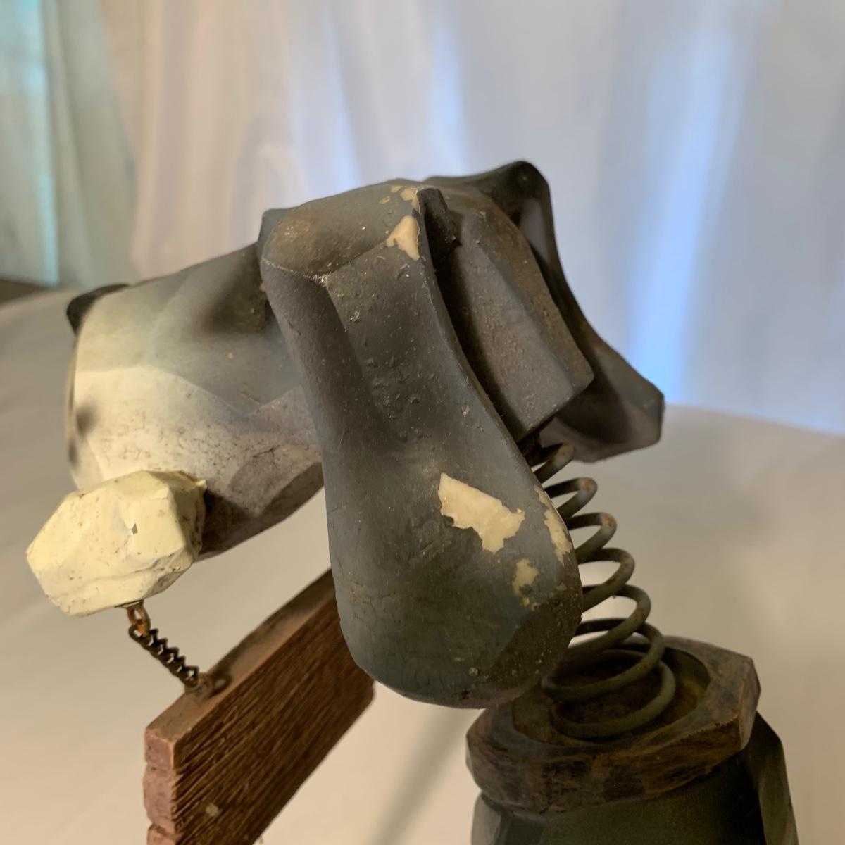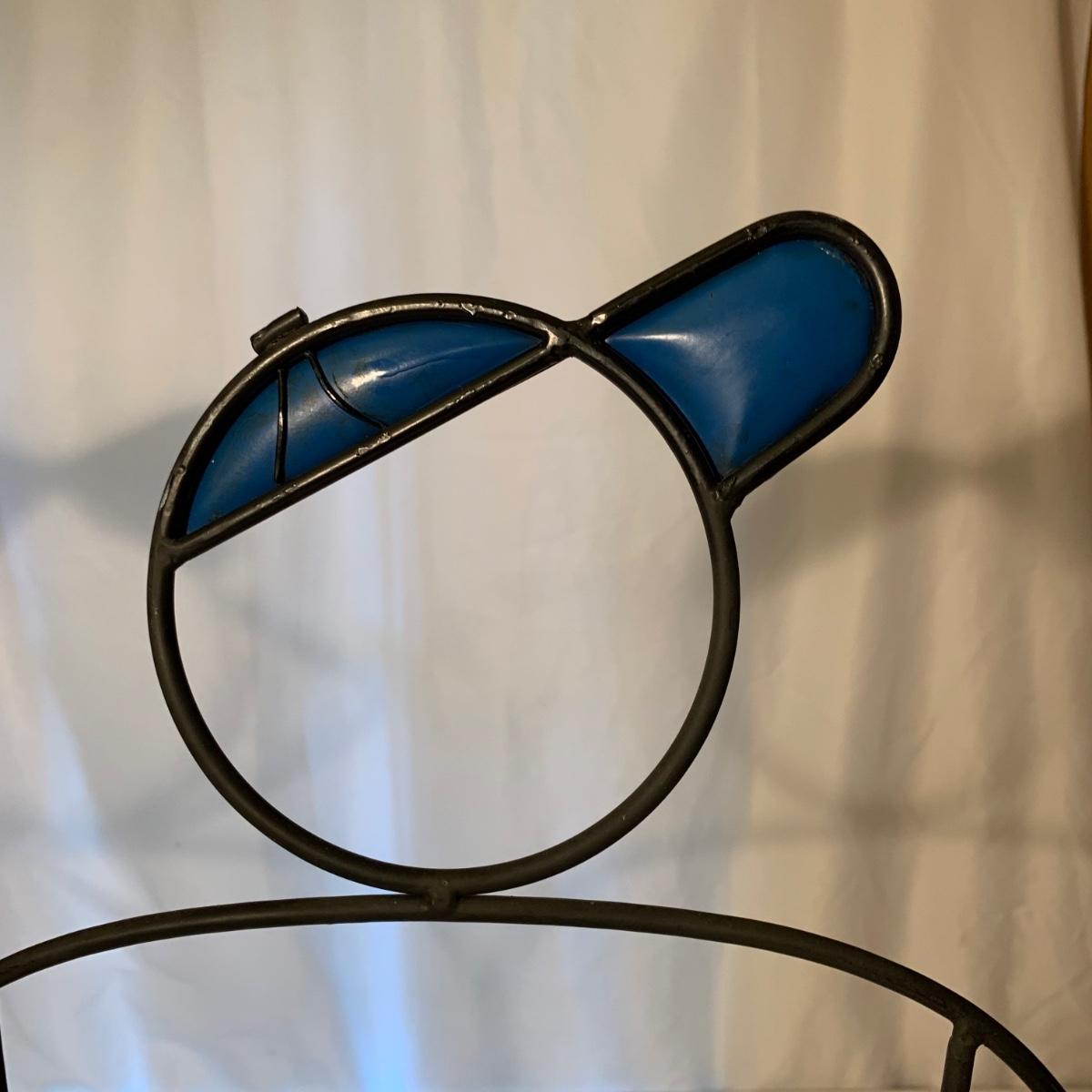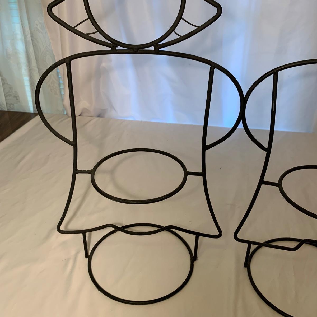 Three items of outdoor decor. One is a dog with a springy bobble head and tail, holding a bone and a welcome sign in his mouth. It’s been on a porch and has gathered some dust from being outside. It’s about 12.5” tall. It feels like it is made of resin. Some paint is chipping. The pot holders are a matching pair metal outline of a boy and a girl. They also have a little dust and superficial wear, but are otherwise in very good condition. They measure about 22” tall. Local pickup only.