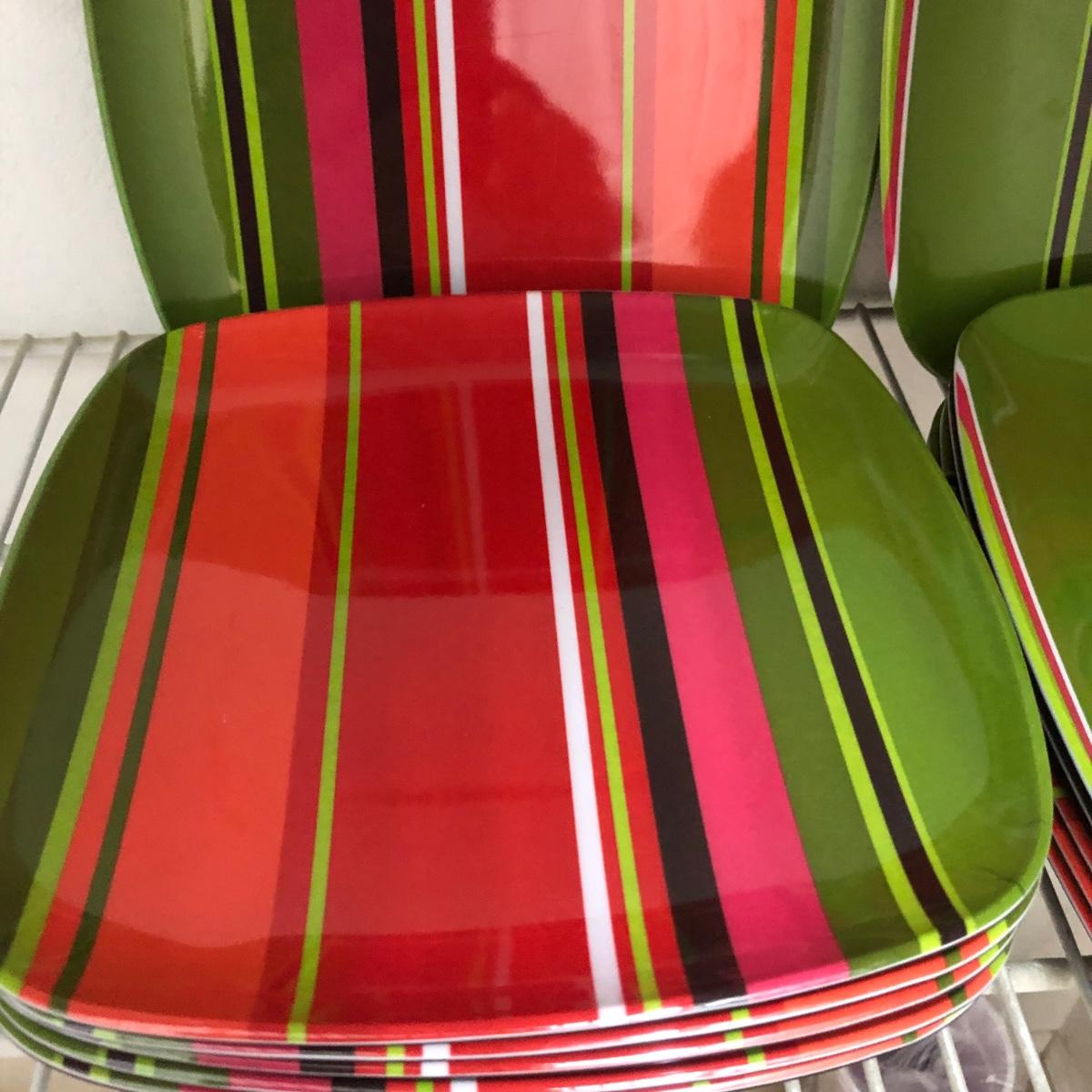 This lot includes a four condiment tray; all are ceramic and two are salt and pepper shakers. The striped plates are plastic and have two sizes (larger ones 10.5” x 10.5” and 8.5” x 8.5”). There are six of each. The plastic supplies include unopened plastic bowls, paper napkins and party cups. There is also a plastic covered butter dish and plastic tongs. There are six heavy brown plastic tumblers and ten clear plastic tumblers. This lot also has two plastic table cloths, a green beverage dispenser and plastic water pitcher. Finally, there is a set of six yellow, red and orange plastic bowls (5.5” in diameter and stands 3” tall) and a matching serving bowl (10” in diameter and stands 4.5” tall). There are also three plastic serving trays. Shipping Available.