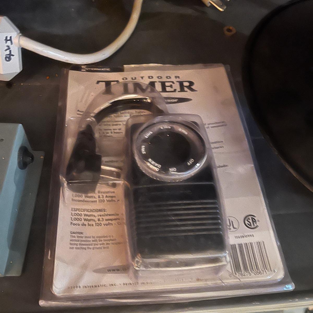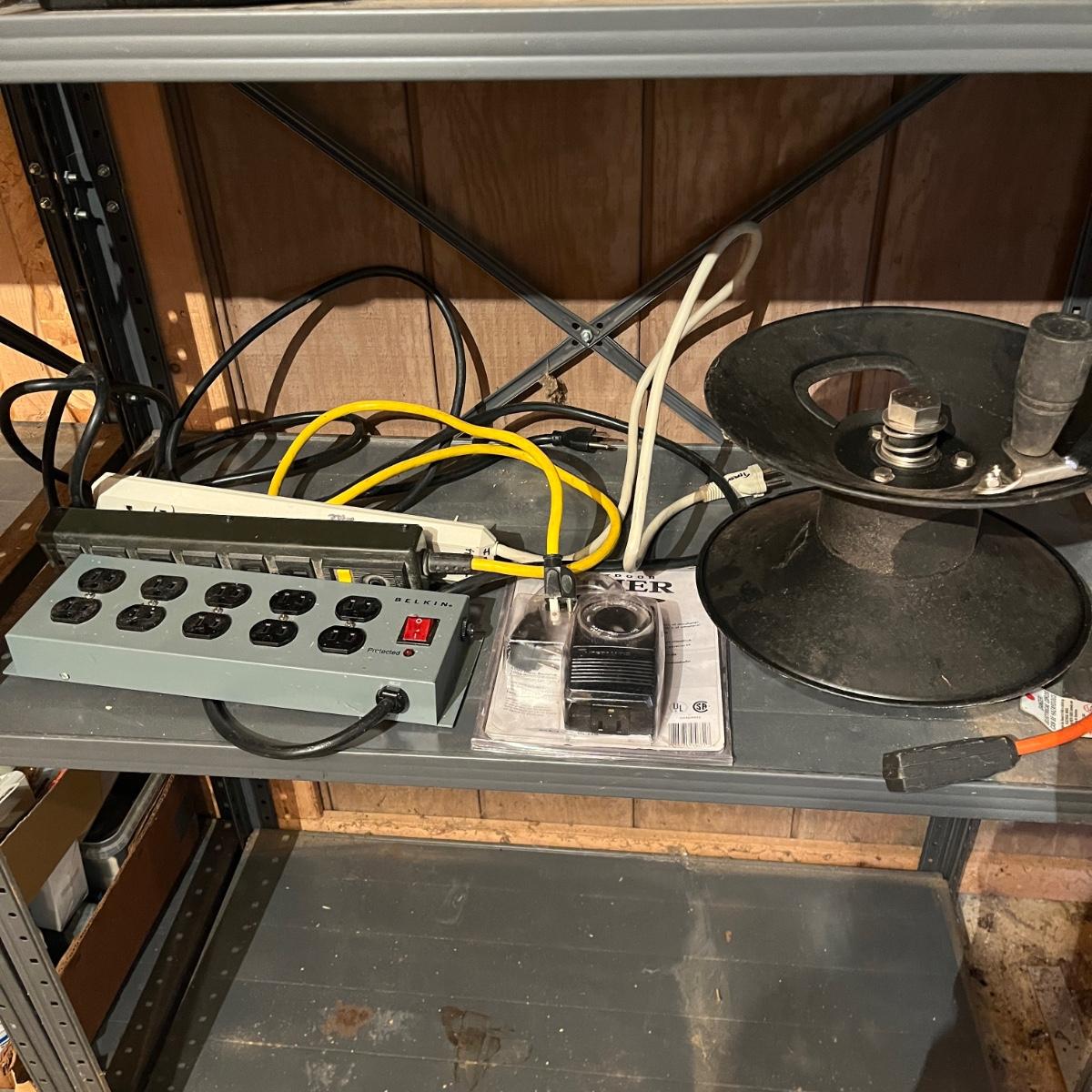 Lot includes two outdoor timers, cord reel, three power strips, and four outdoor extension cords.