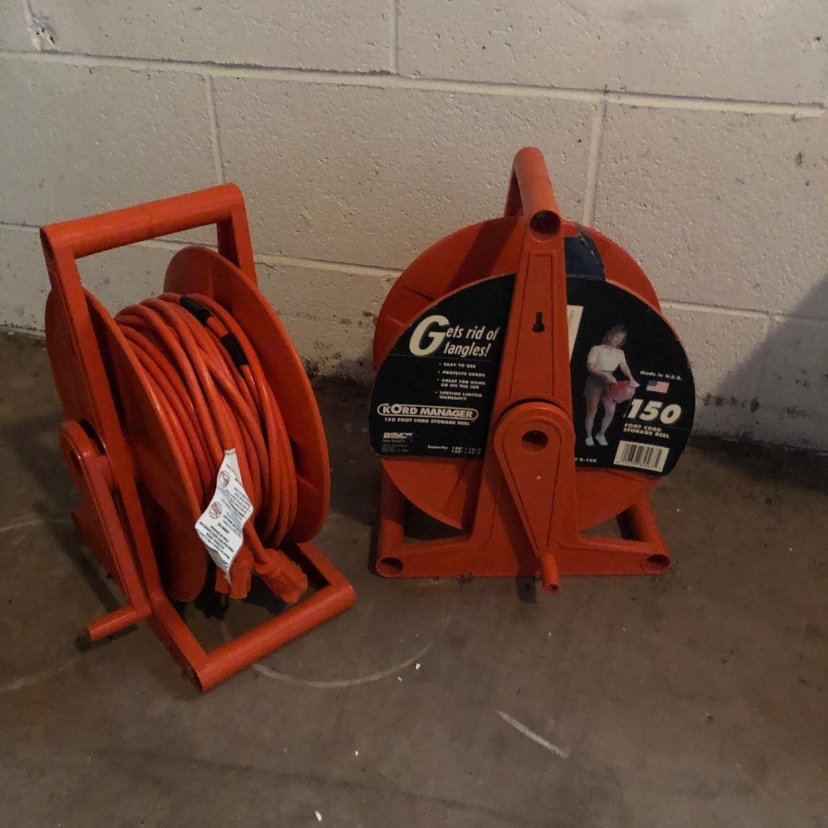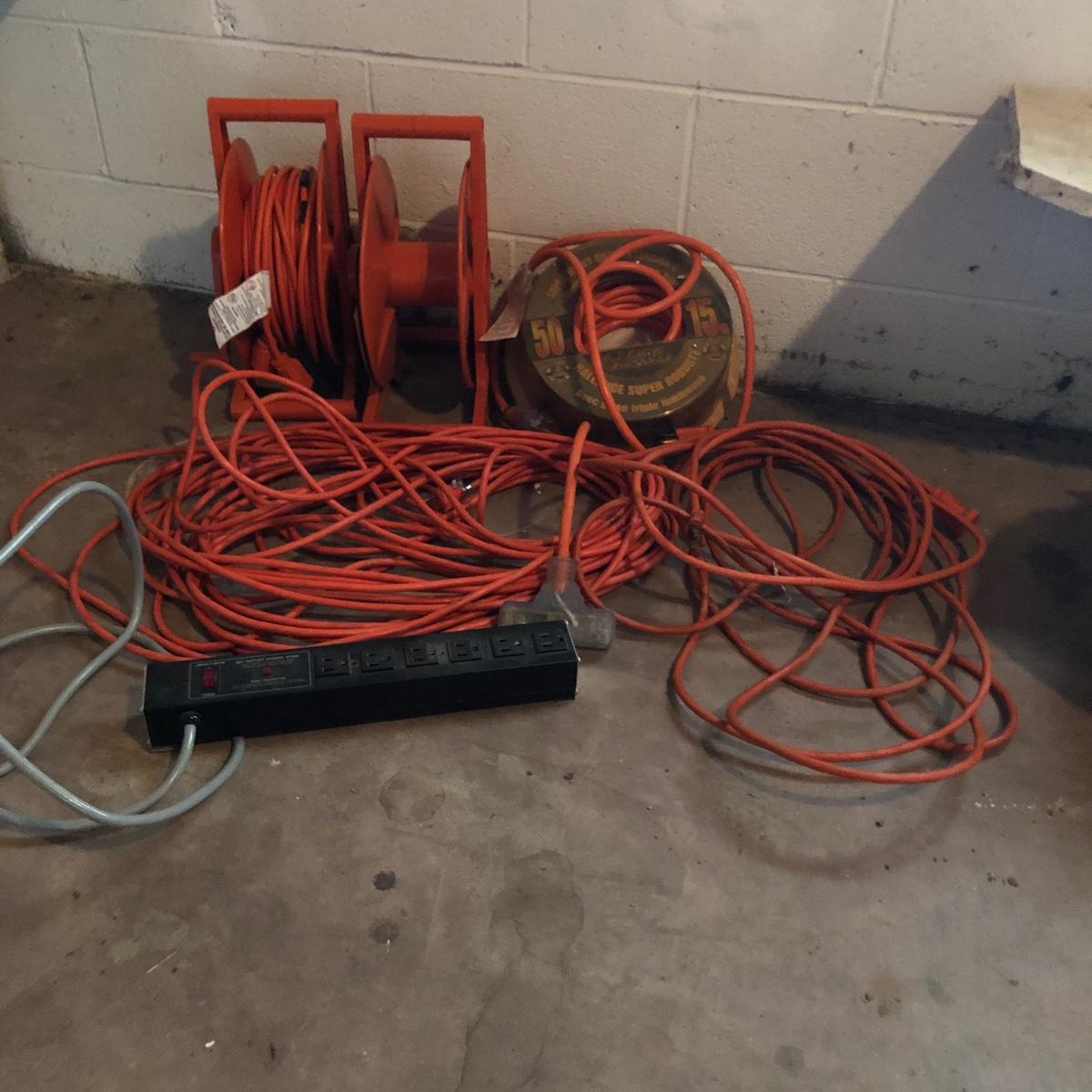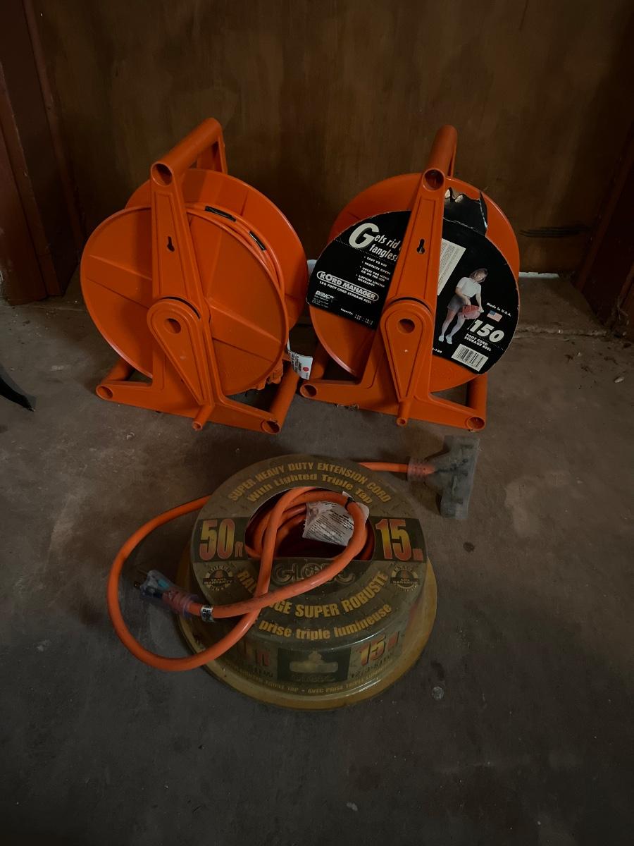 Lot includes two plastic extension cord reel with one having a extension cord, fifty foot heavy duty cord with lighted triple tap, surge protector and three orange extension cords of varying length’s.