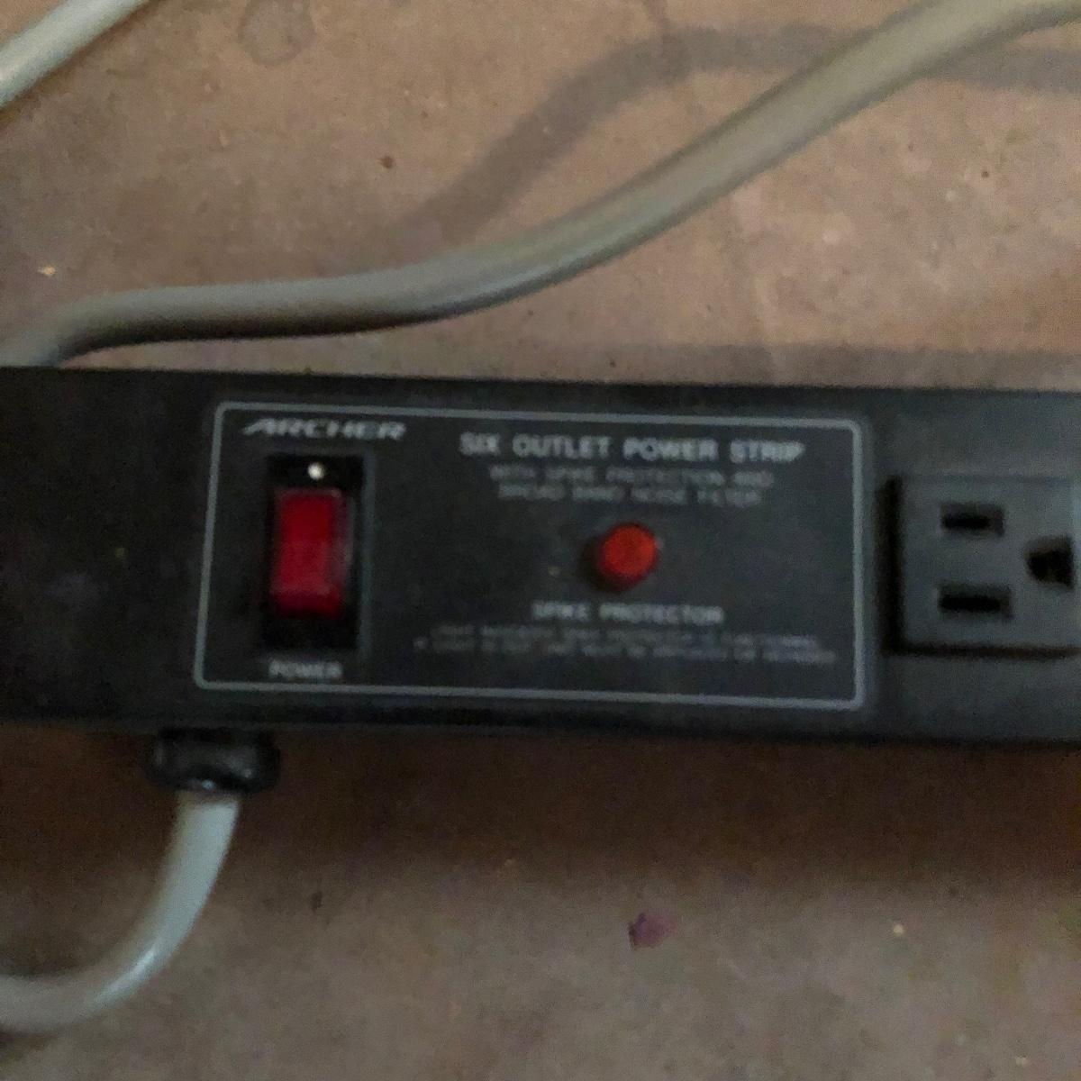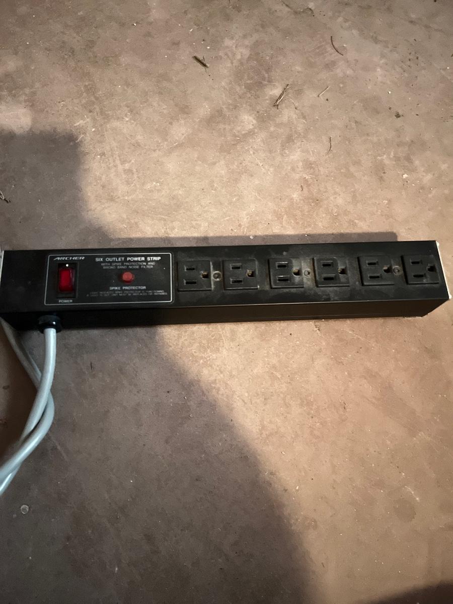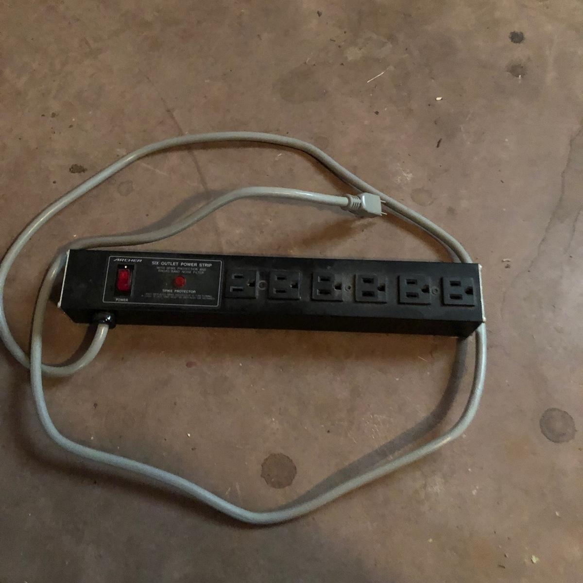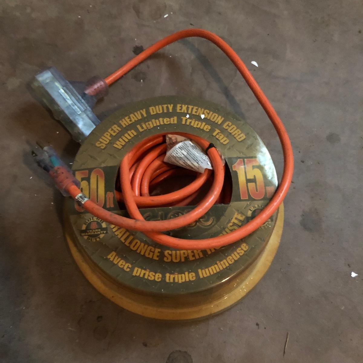 Lot includes two plastic extension cord reel with one having a extension cord, fifty foot heavy duty cord with lighted triple tap, surge protector and three orange extension cords of varying length’s.