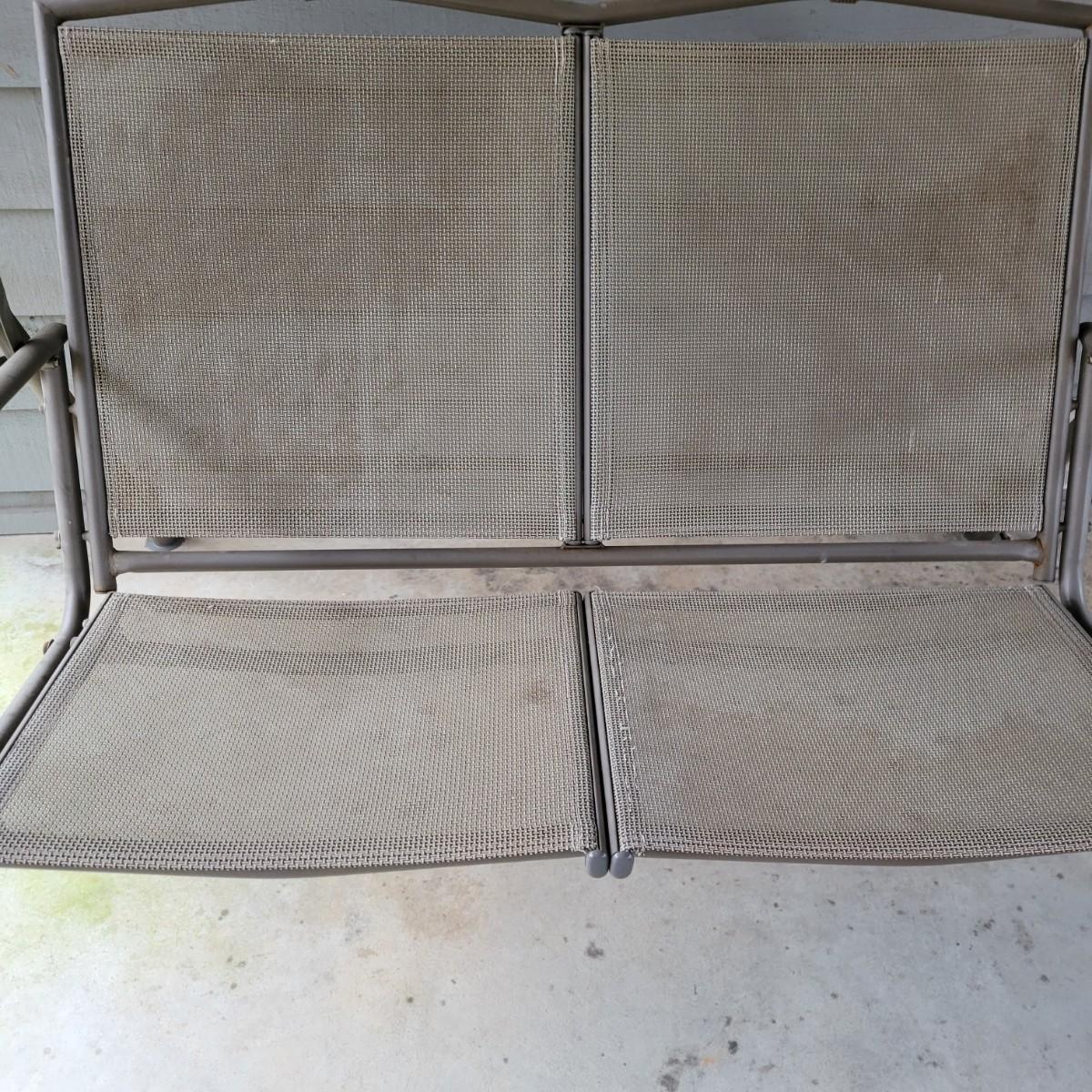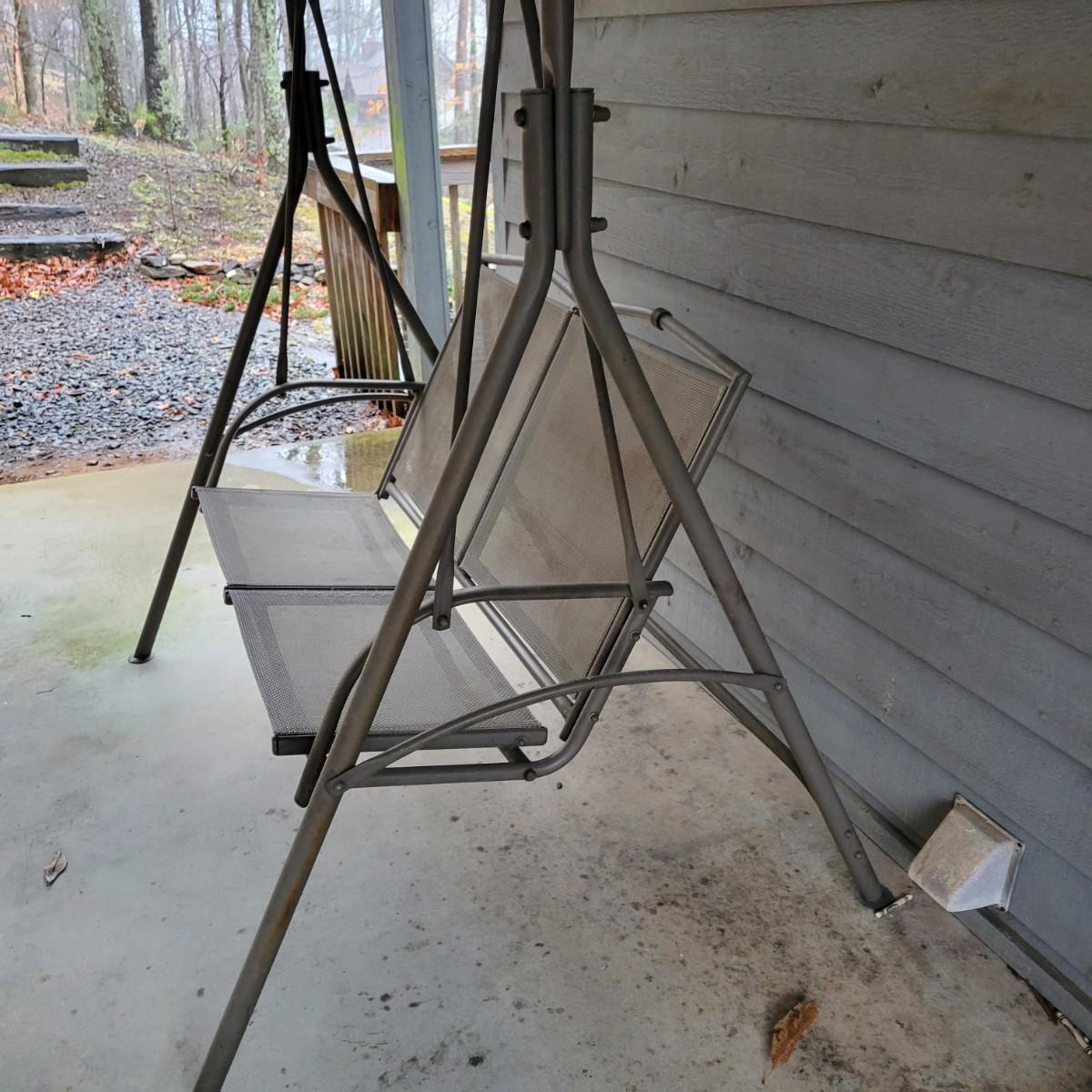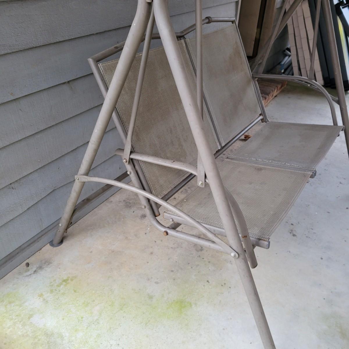 A freestanding outdoor swing with an aluminum frame and mesh seat and back. Mesh is stained from being out doors and could possibly be cleaned with bleach. Measures approximately 57" x 48" x 68"H. Local pickup only