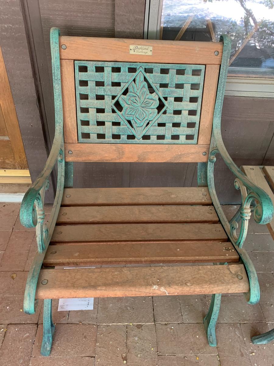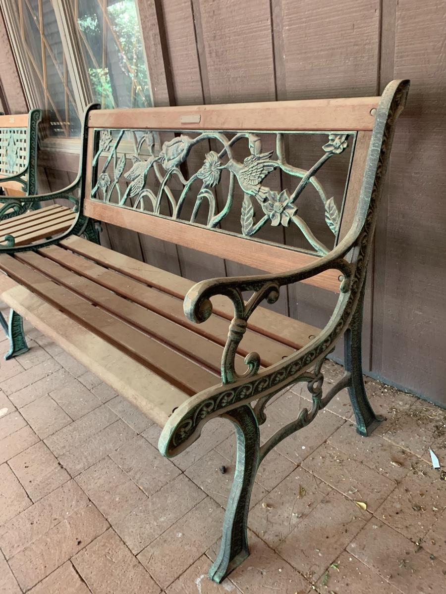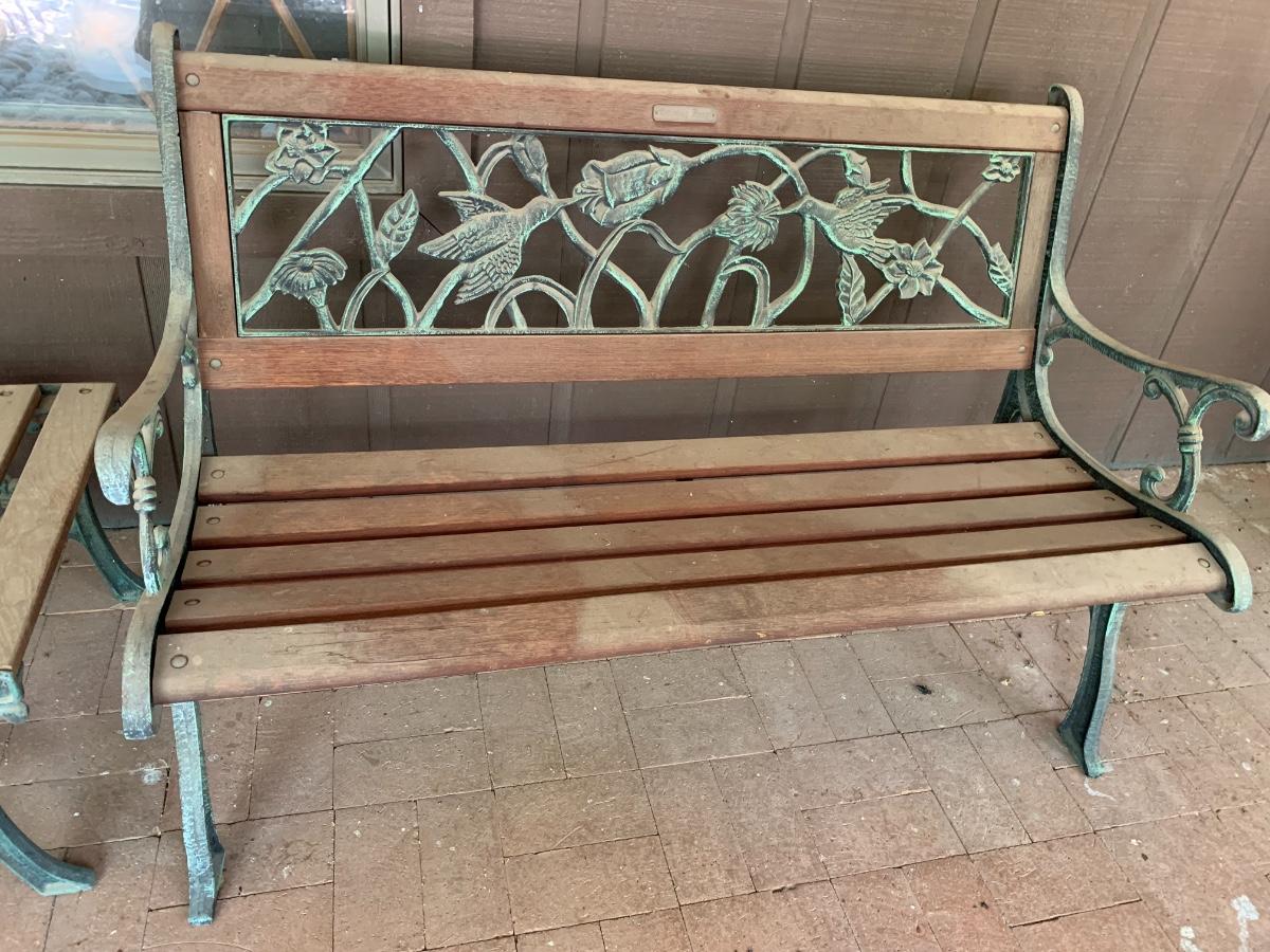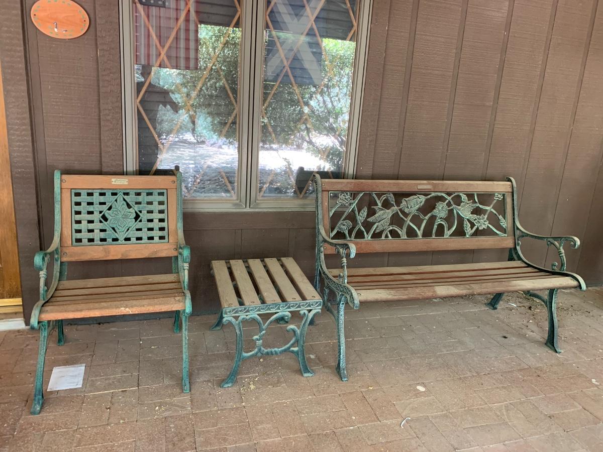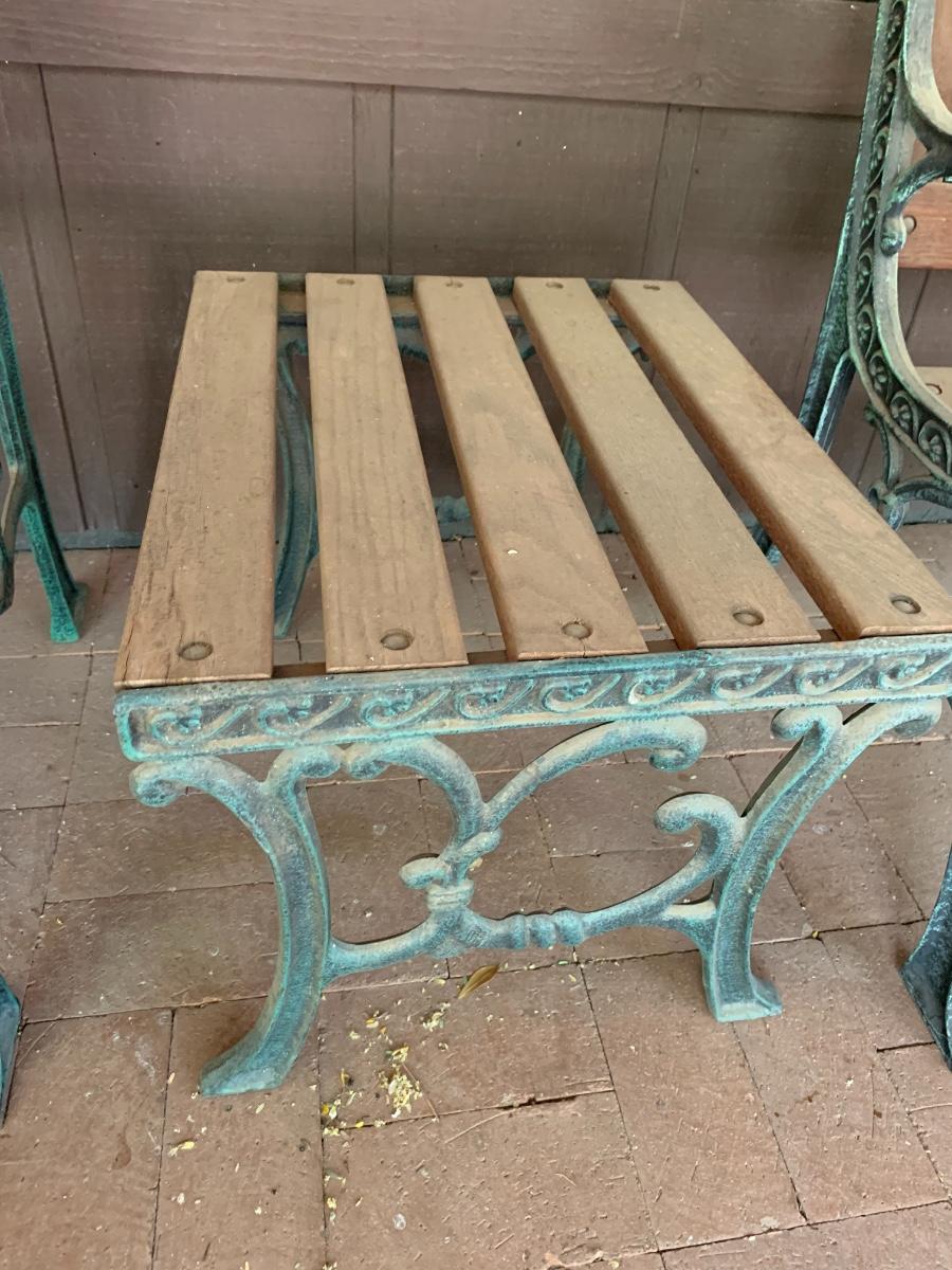 Metal outdoor bench (50” in length), Chair (21.5” in length), small table (20” in length)