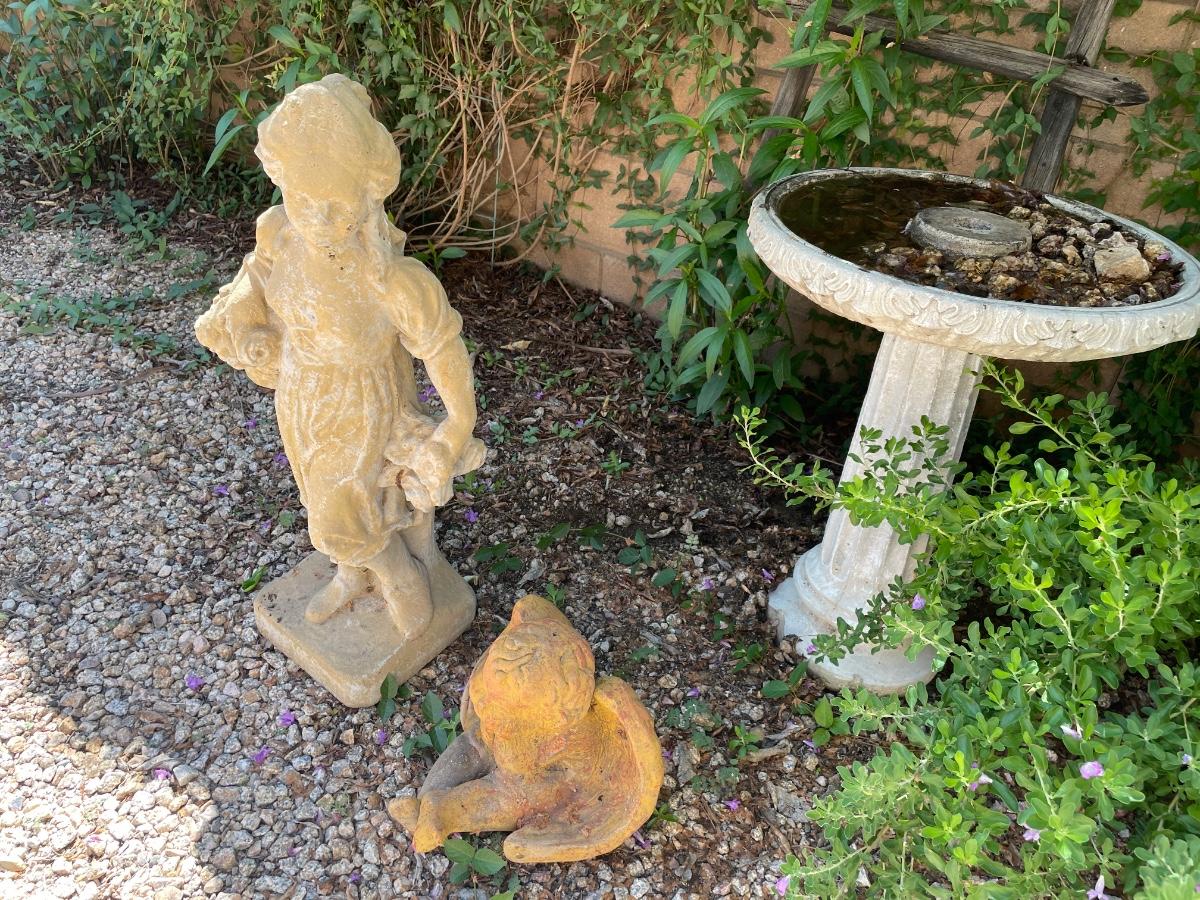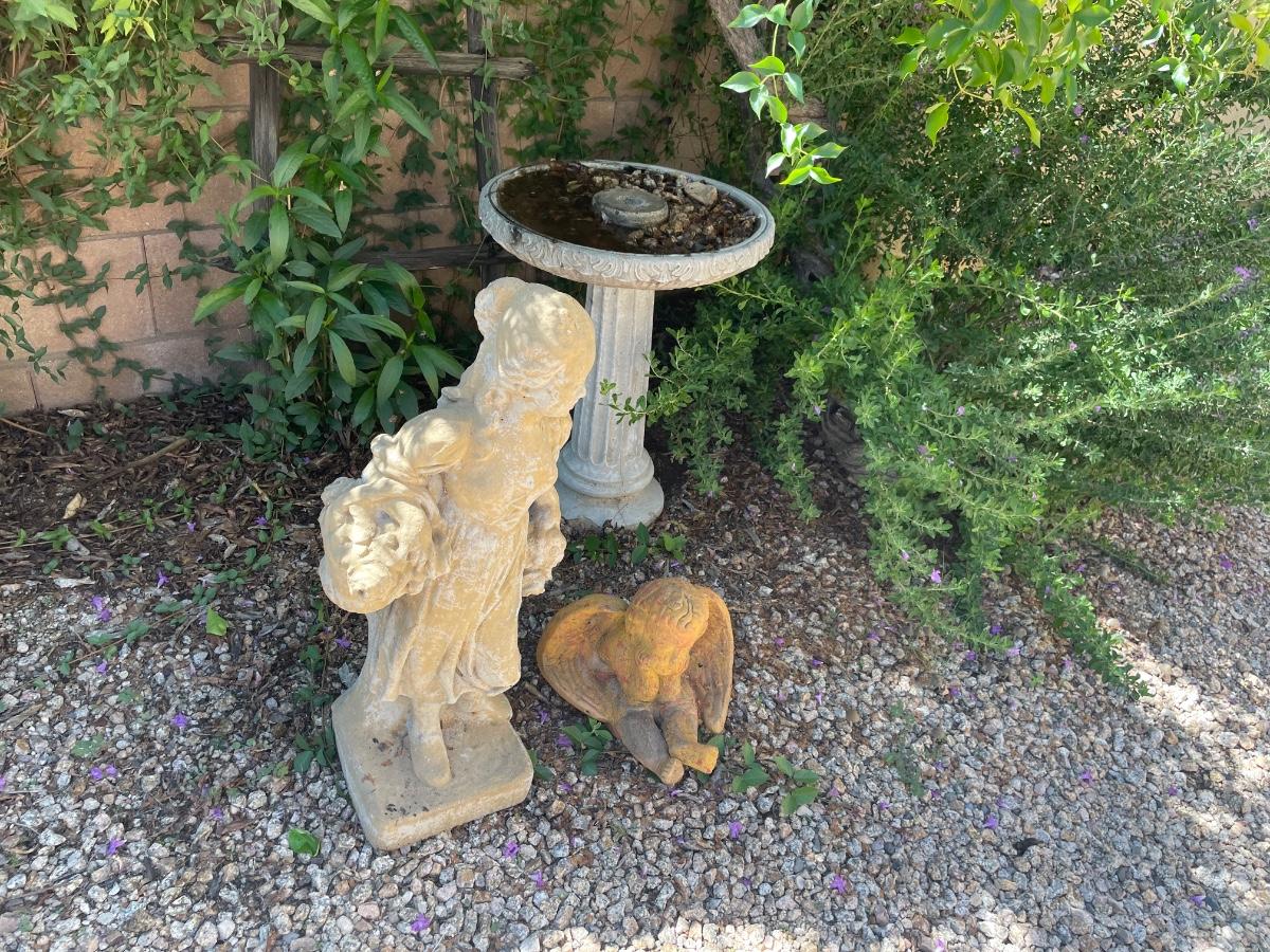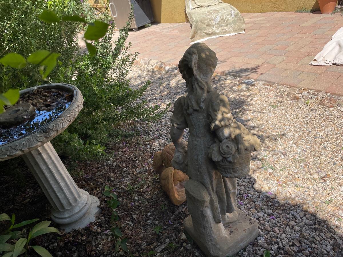 Outdoor garden decor includes a bird bath (2 feetX18 inches), an angel and a maiden (30in tall). All in good condition