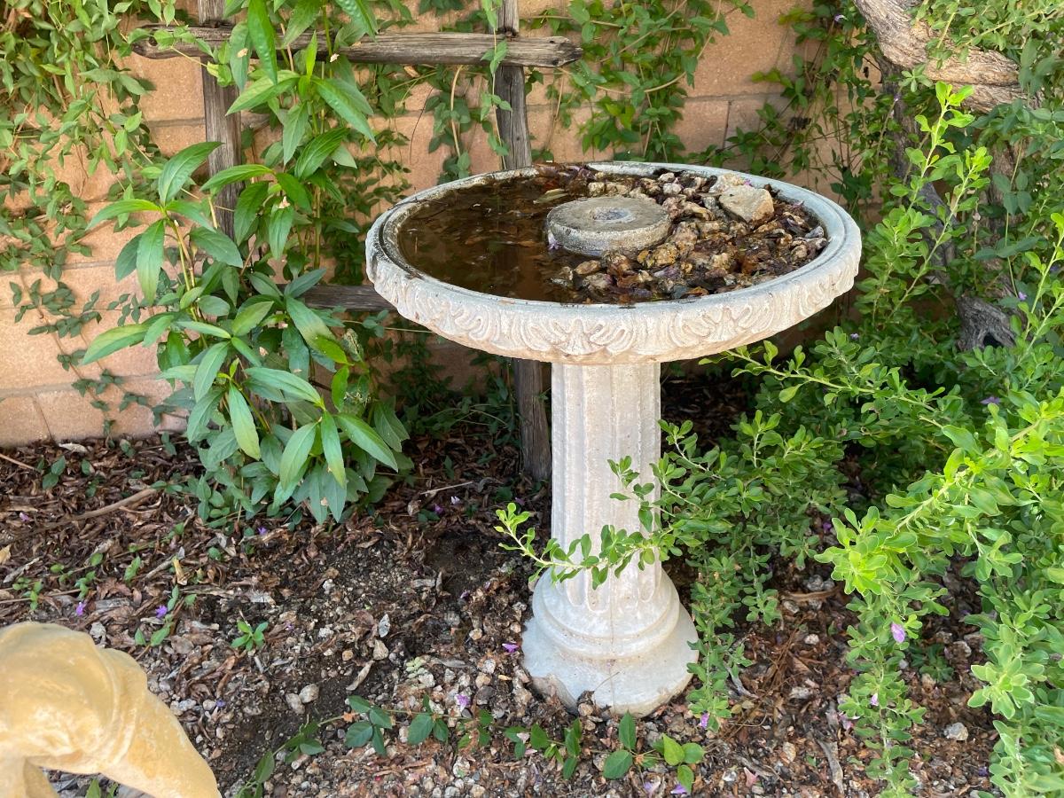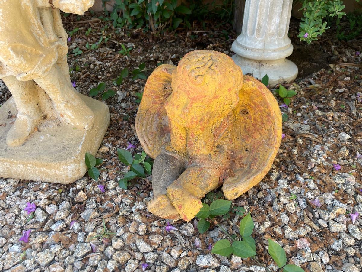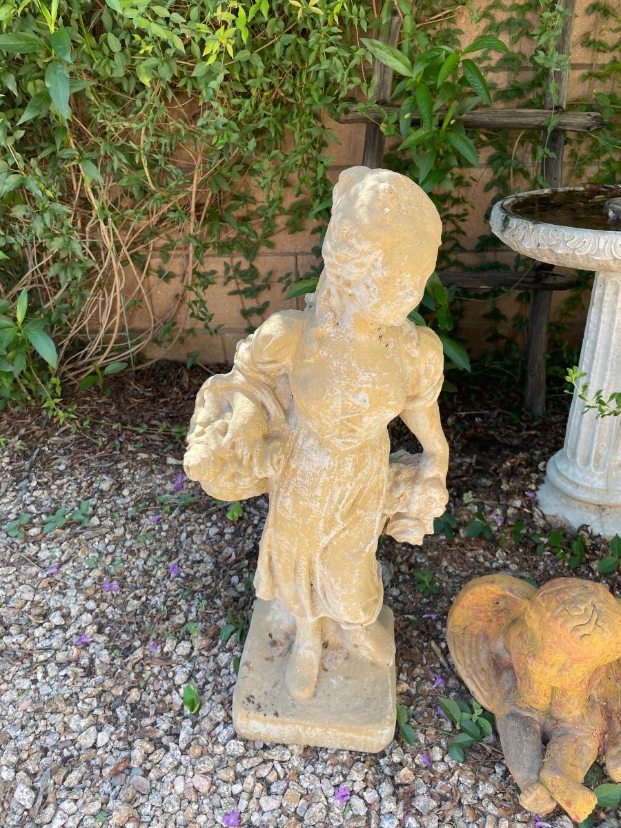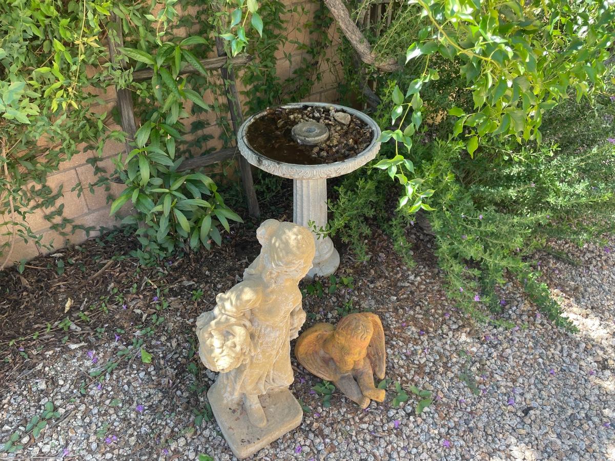 Outdoor garden decor includes a bird bath (2 feetX18 inches), an angel and a maiden (30in tall). All in good condition