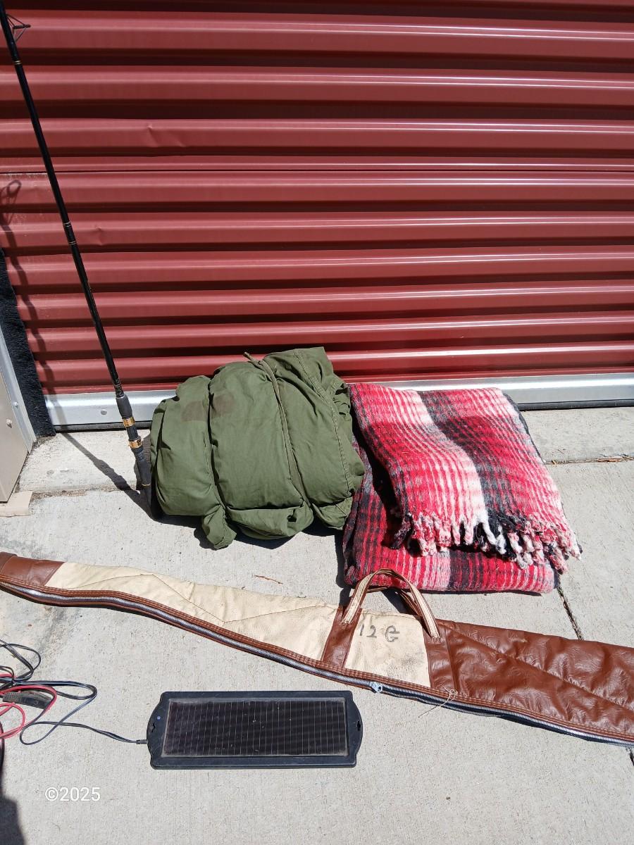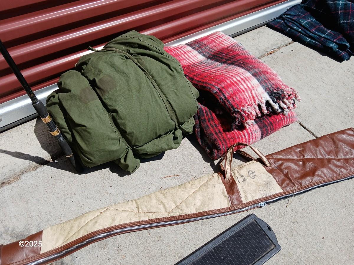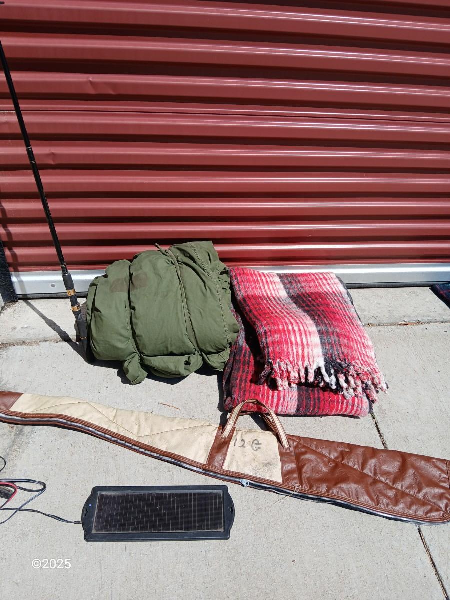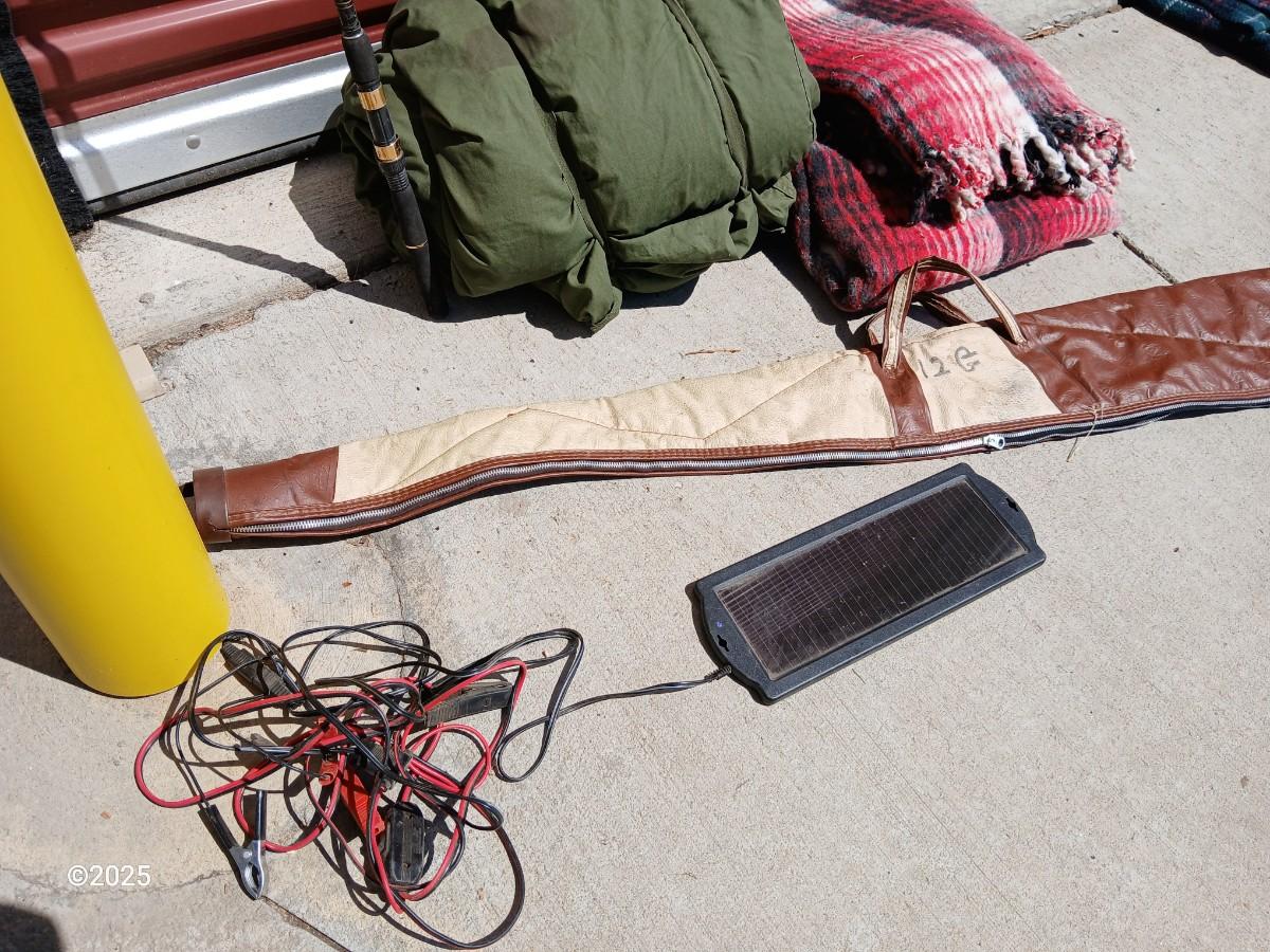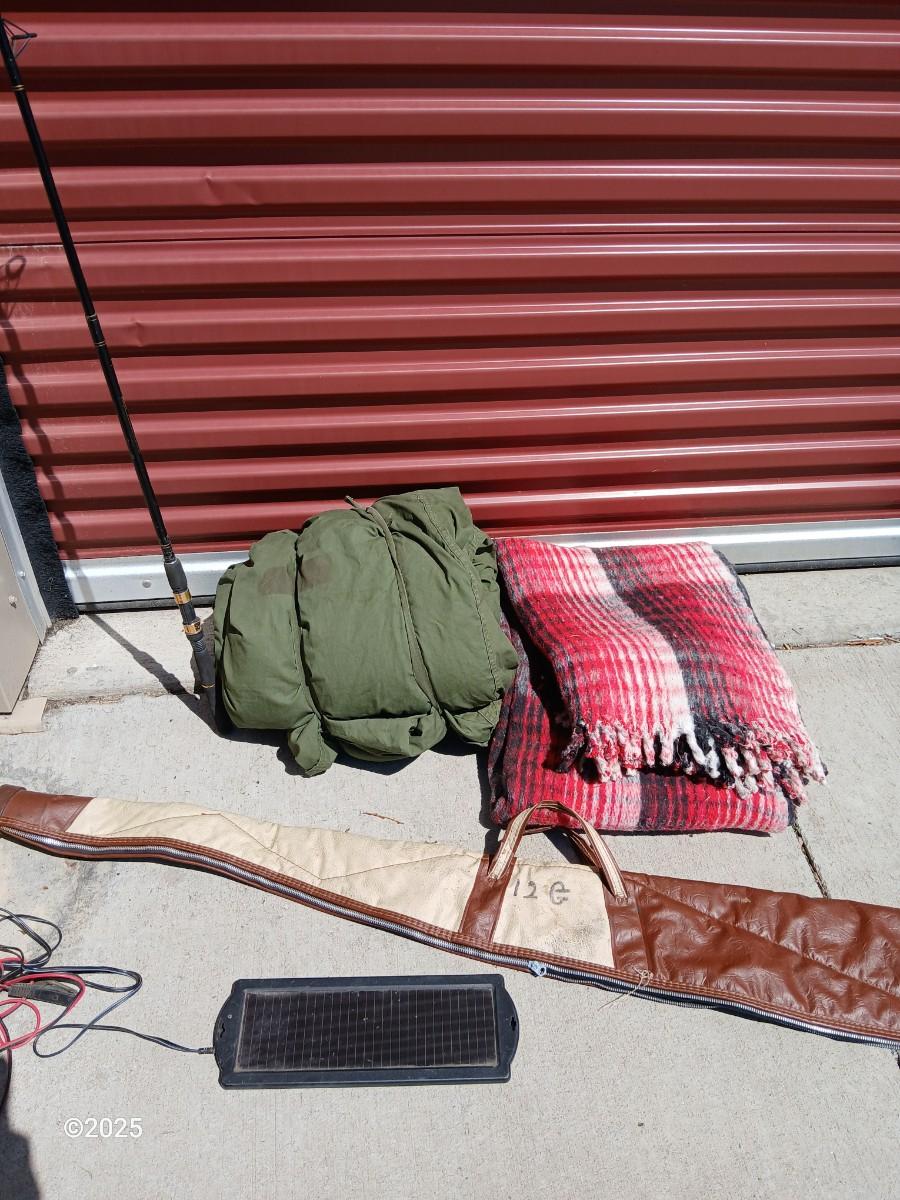 Outdoor Gear Lot – Sleeping Bag, Wool Blanket, fishing Rod, Solar Panel & Gun Case