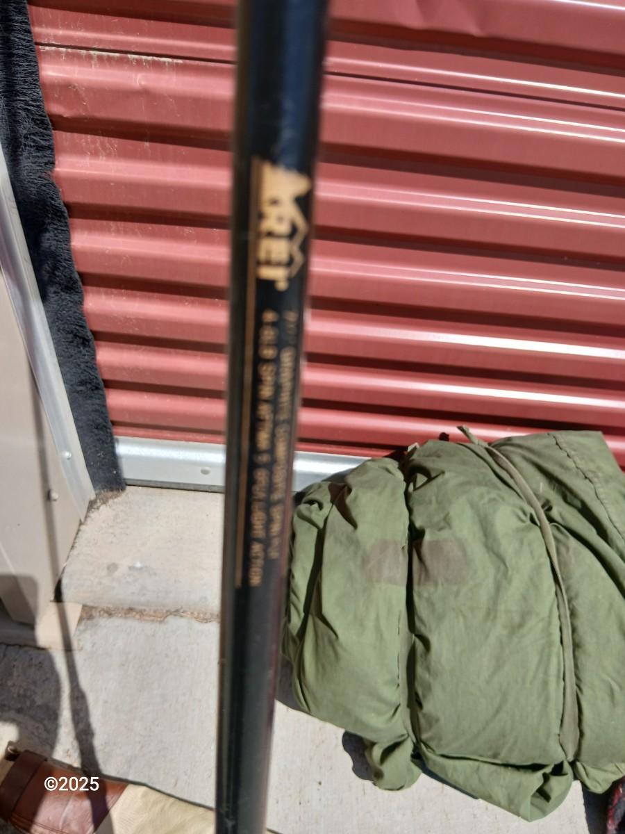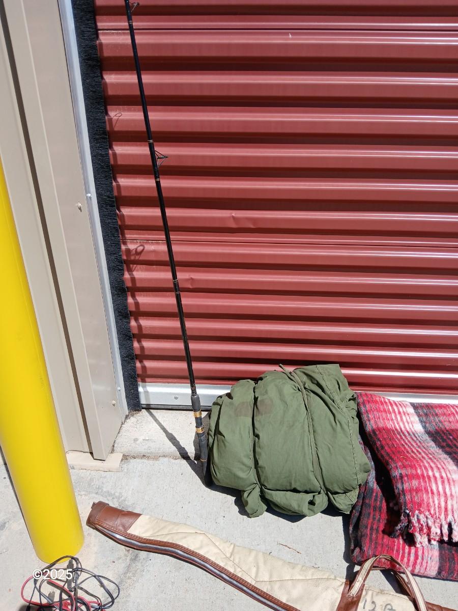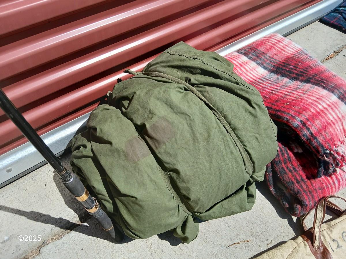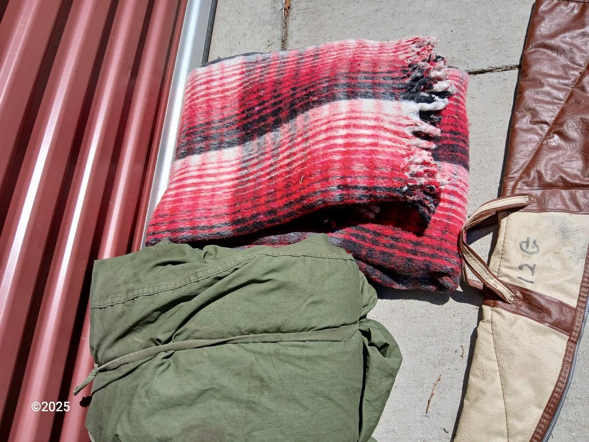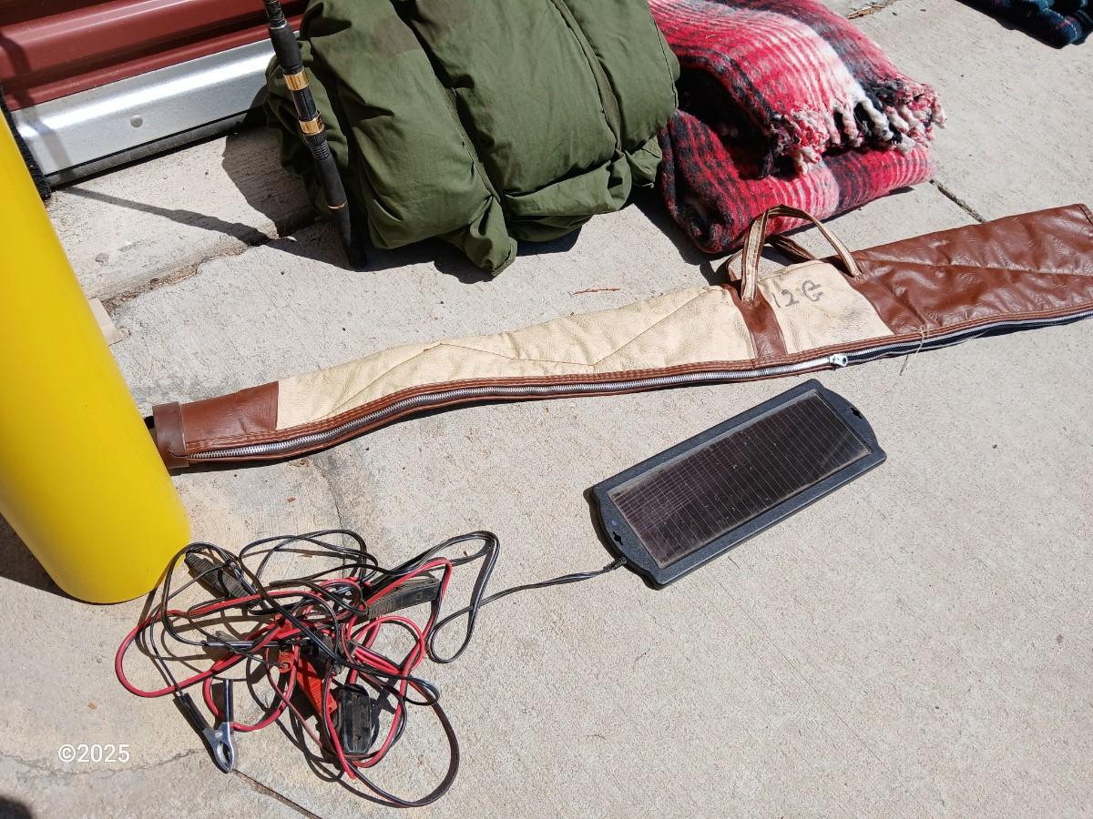 Outdoor Gear Lot – Sleeping Bag, Wool Blanket, fishing Rod, Solar Panel & Gun Case