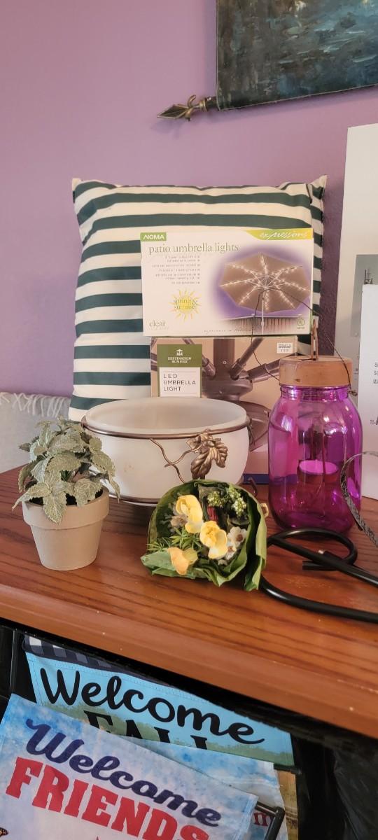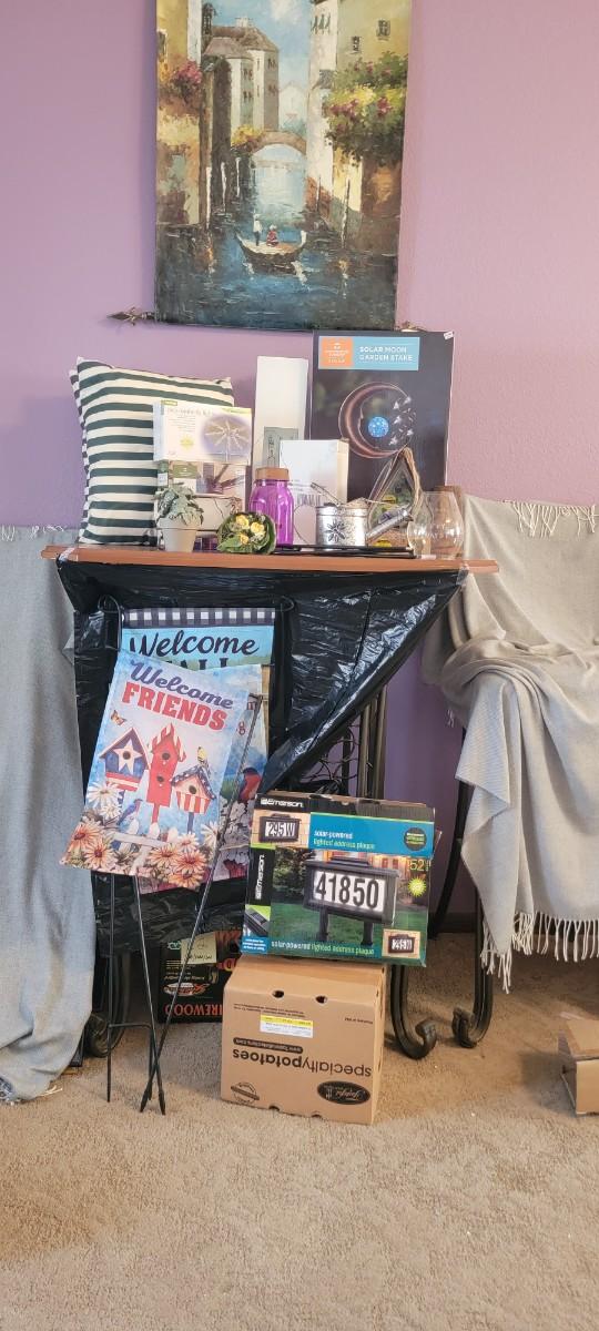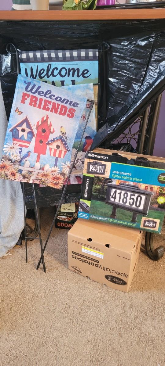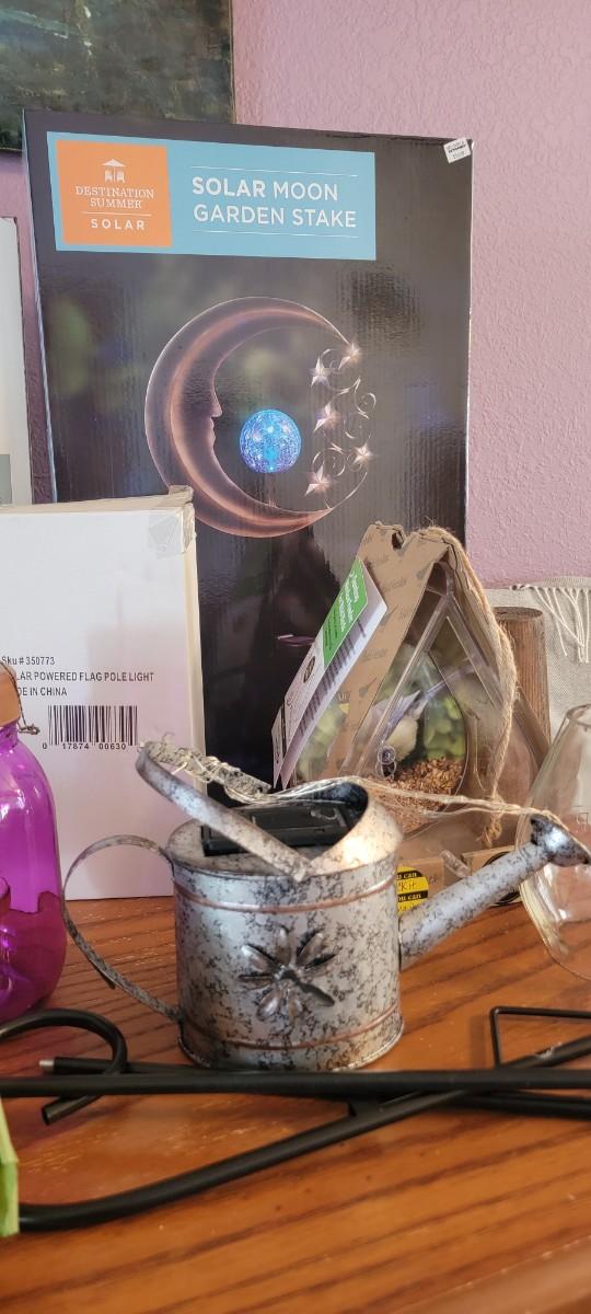 Solar Moon garden stake NIB, patio umbrella lights, lighted address plaque, signs. And more. Excludes art on wall.