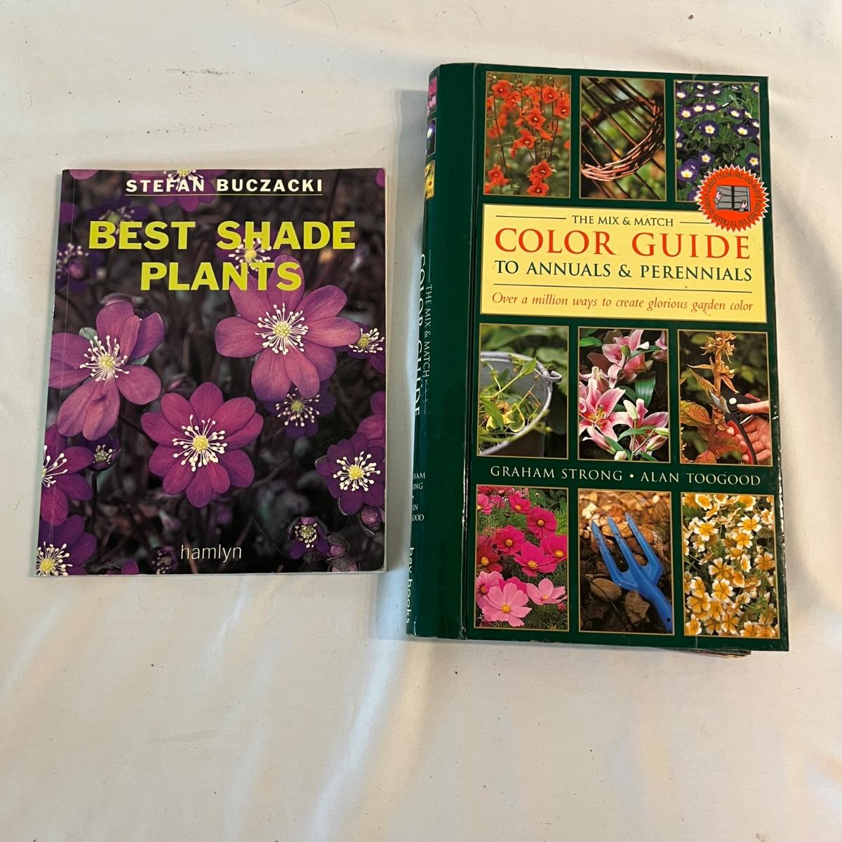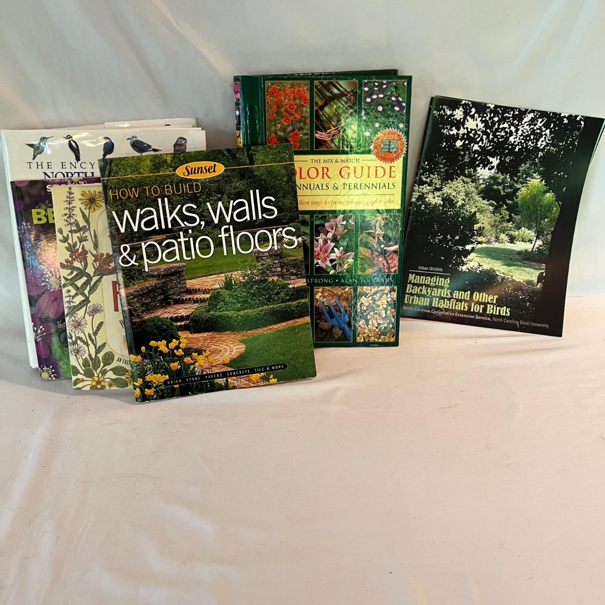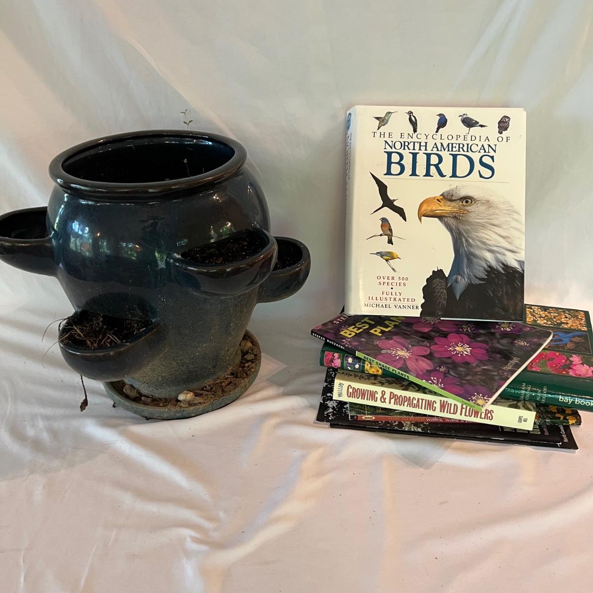 A collection of excellent reference materials for outdoor life. North American, birds, shade plants, growing and propagating wildflowers, the mix and match color guide to annuals and perennials, walks, walls and patio floors and managing backyard and other urban habitat for birds. Blue ceramic planter measures 15”D x 12”H.