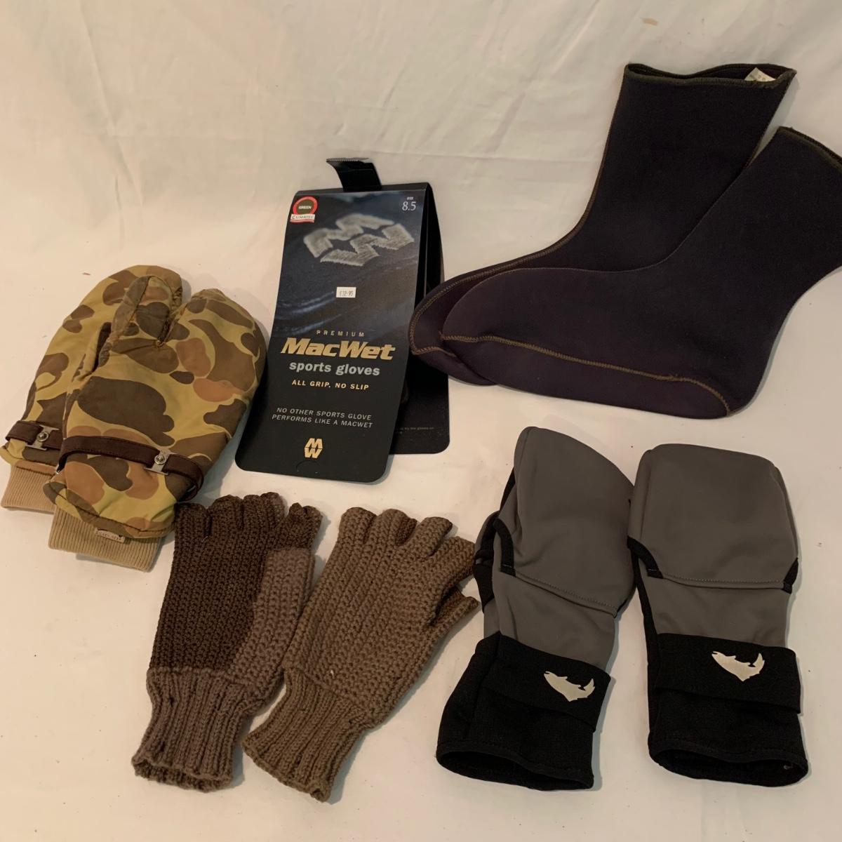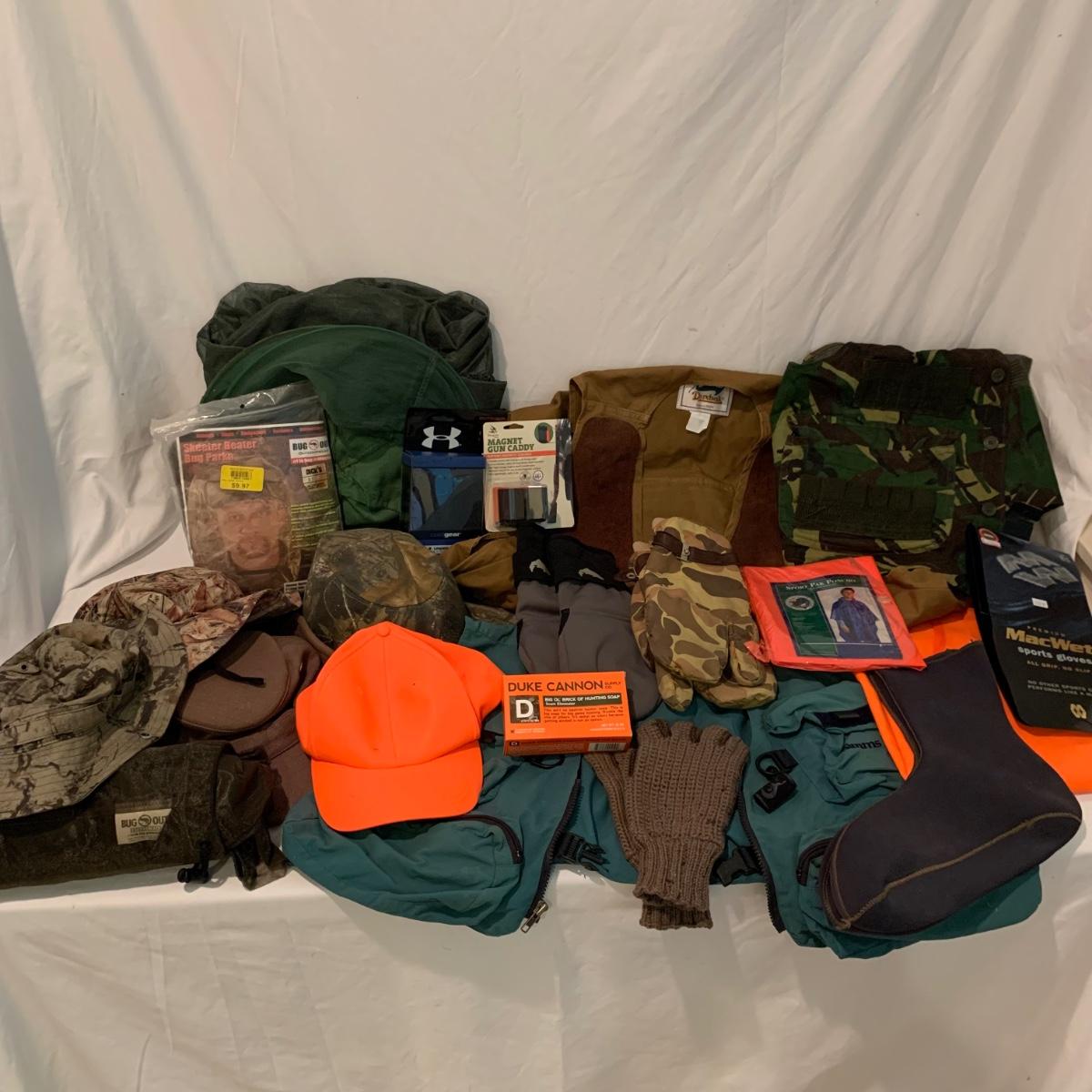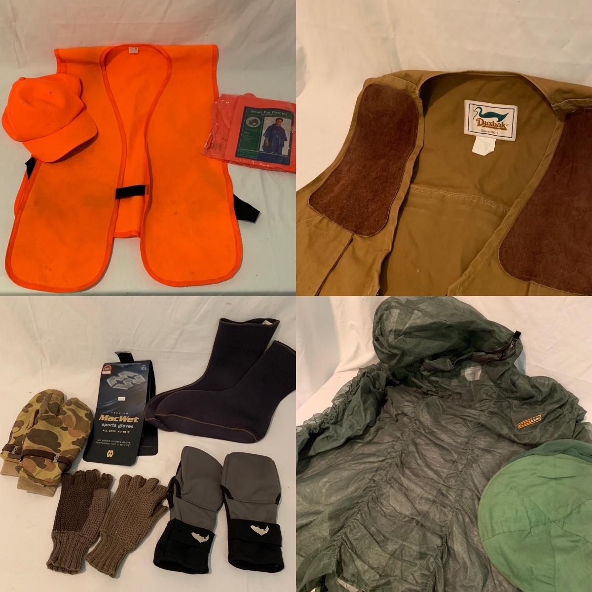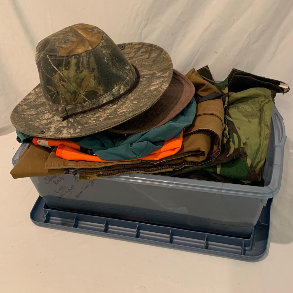 A variety of hats, vests, gloves, and more hunting and fishing gear. There are four brimmed hats, three of which are camouflage. There is a bright Orange hat, vest, and poncho. There is a variety of mosquito blocking clothing including a parka, a pant and jacket set, and more. Four pairs of gloves/mittens and a pair of neoprene socks. There are three vests of different styles, and a few accessories. 22” x 16” x 7”H bin is included.