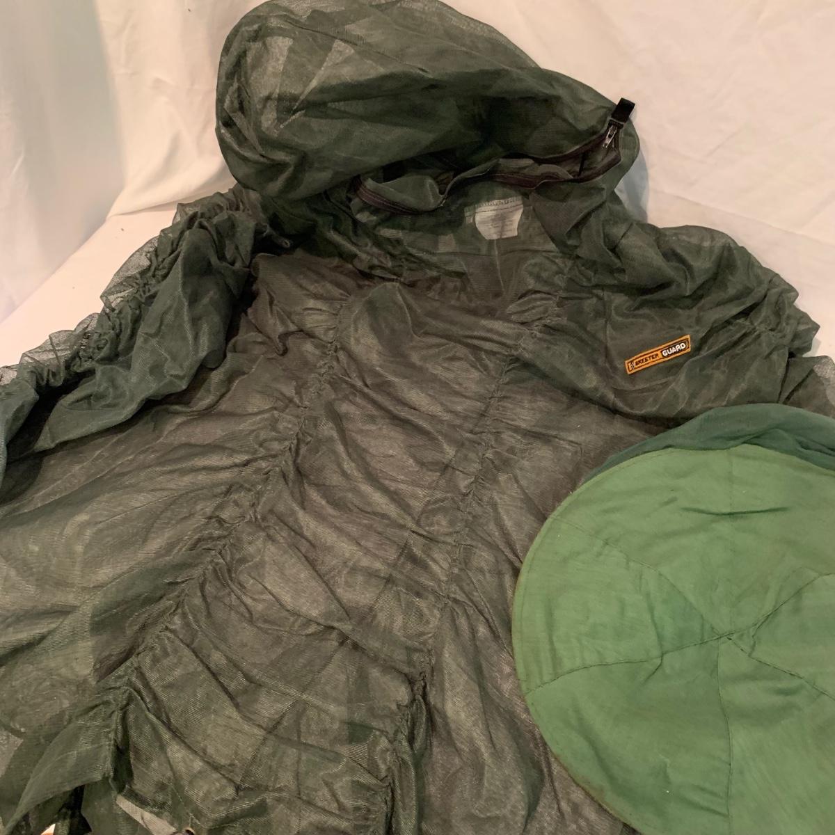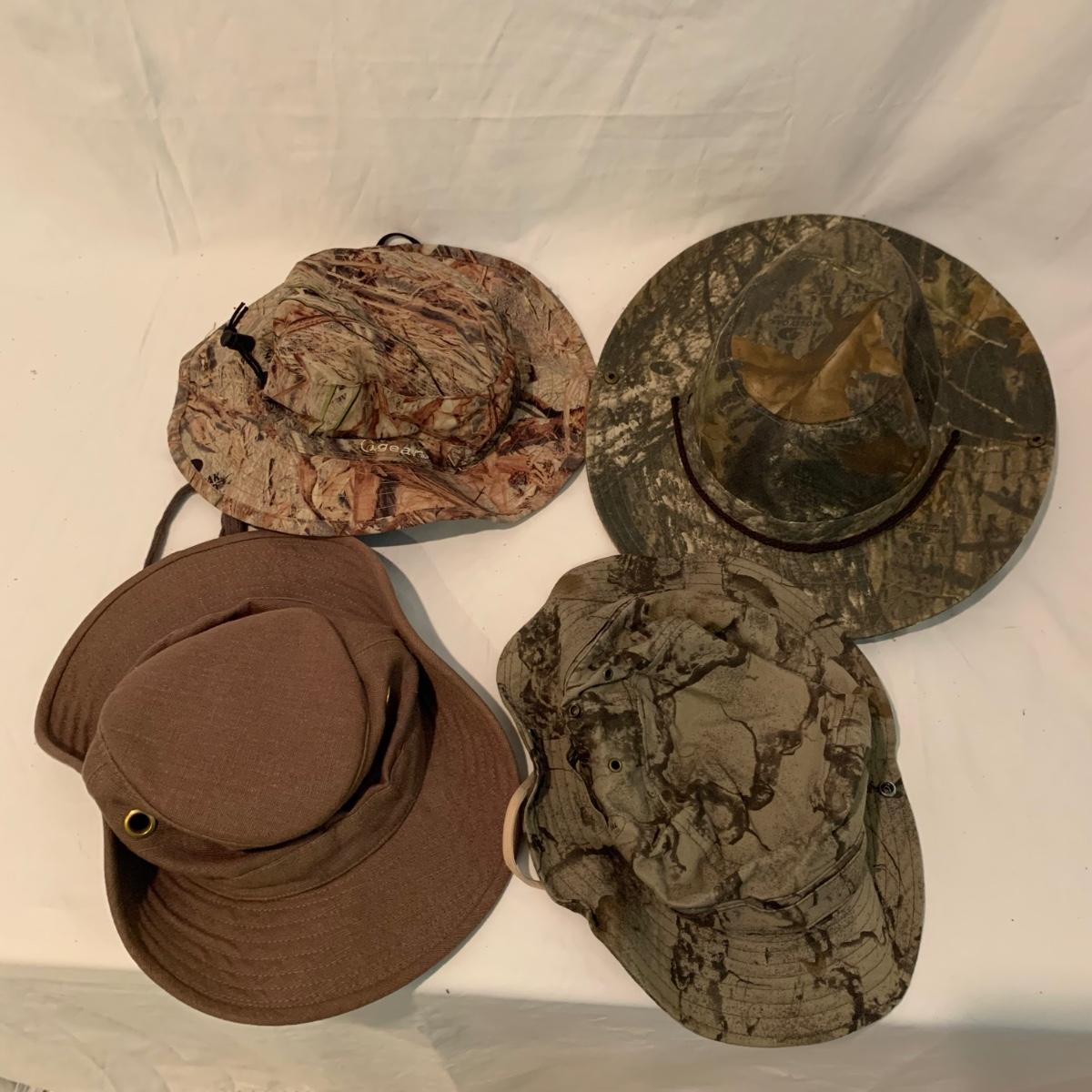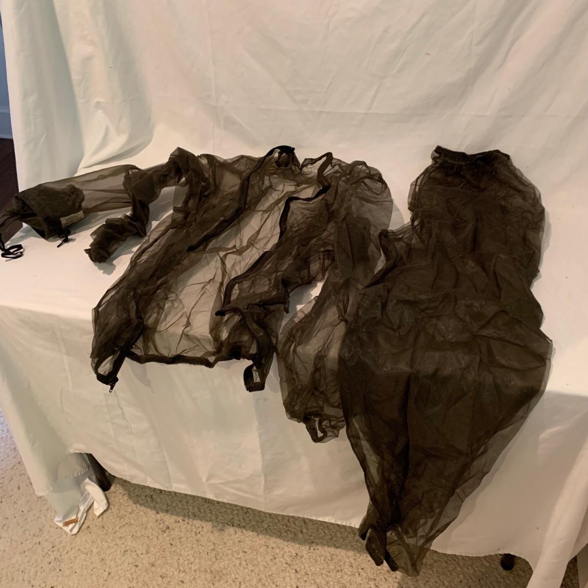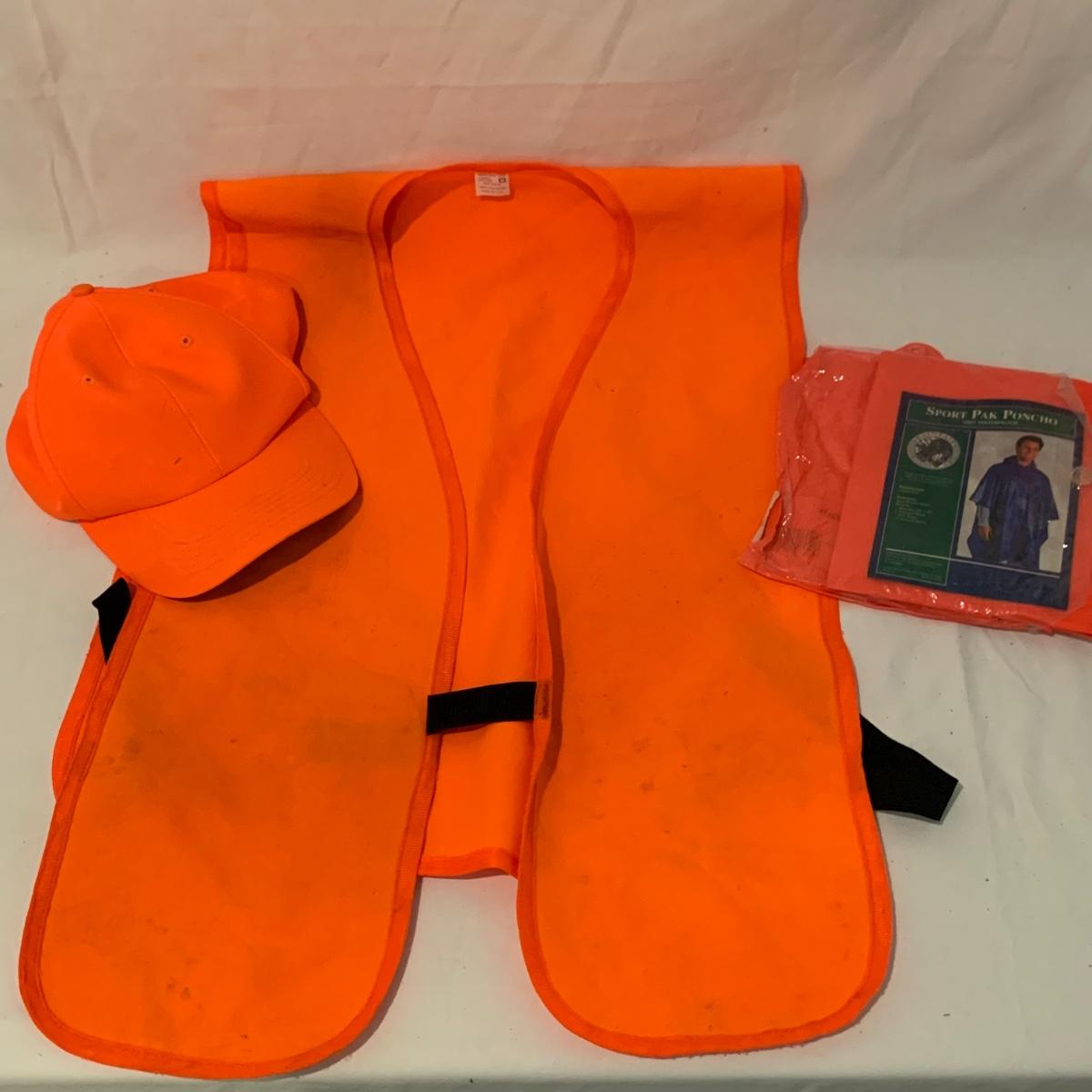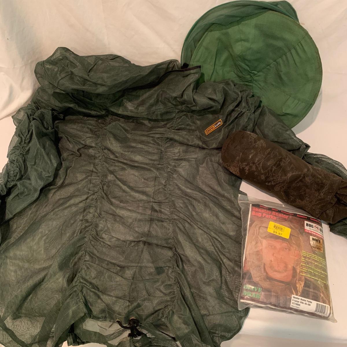 A variety of hats, vests, gloves, and more hunting and fishing gear. There are four brimmed hats, three of which are camouflage. There is a bright Orange hat, vest, and poncho. There is a variety of mosquito blocking clothing including a parka, a pant and jacket set, and more. Four pairs of gloves/mittens and a pair of neoprene socks. There are three vests of different styles, and a few accessories. 22” x 16” x 7”H bin is included.