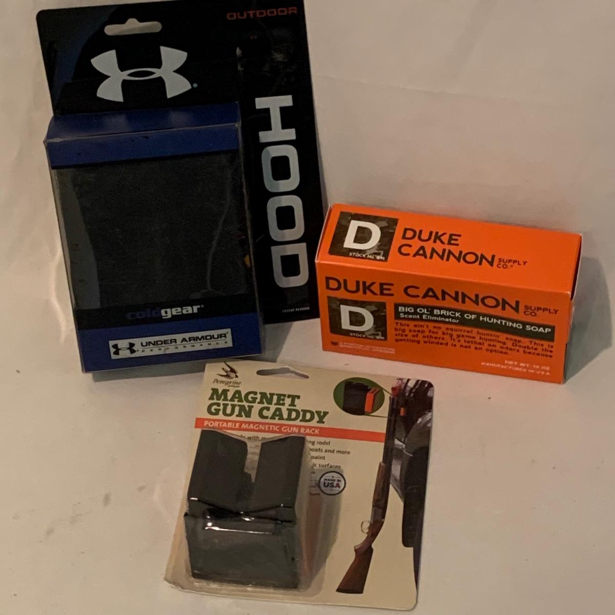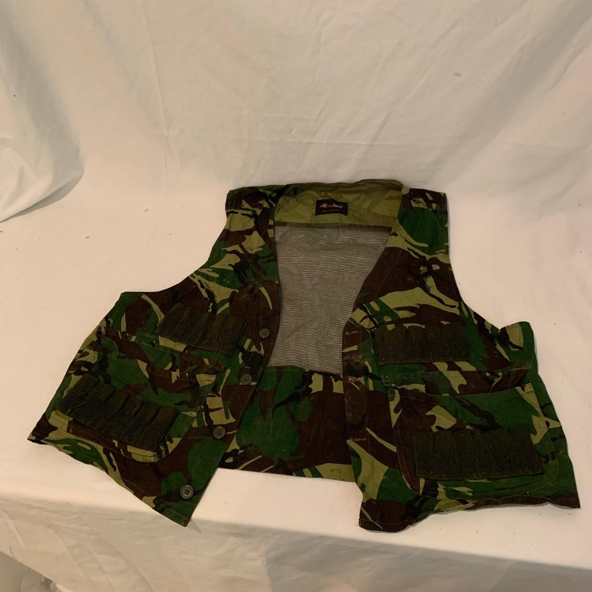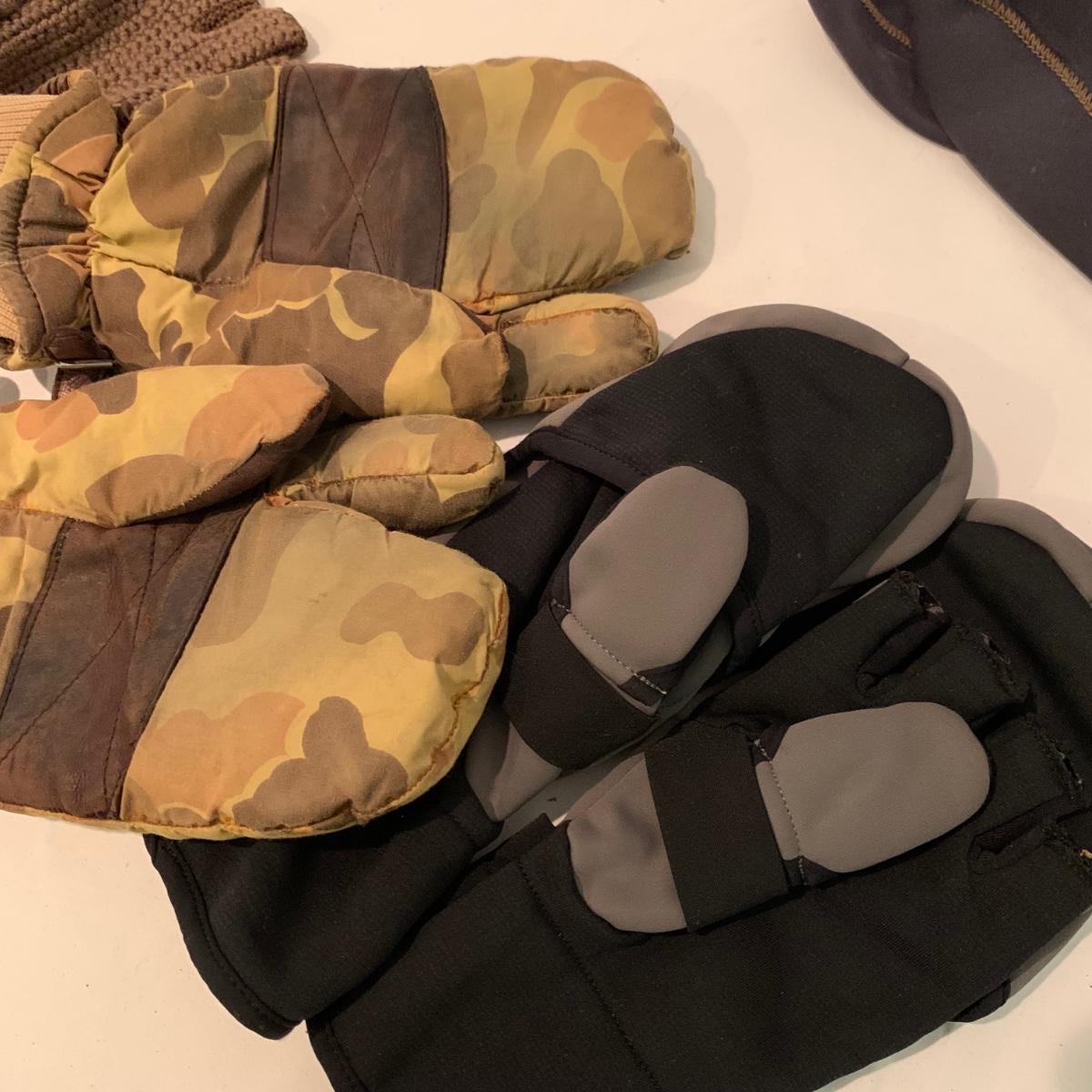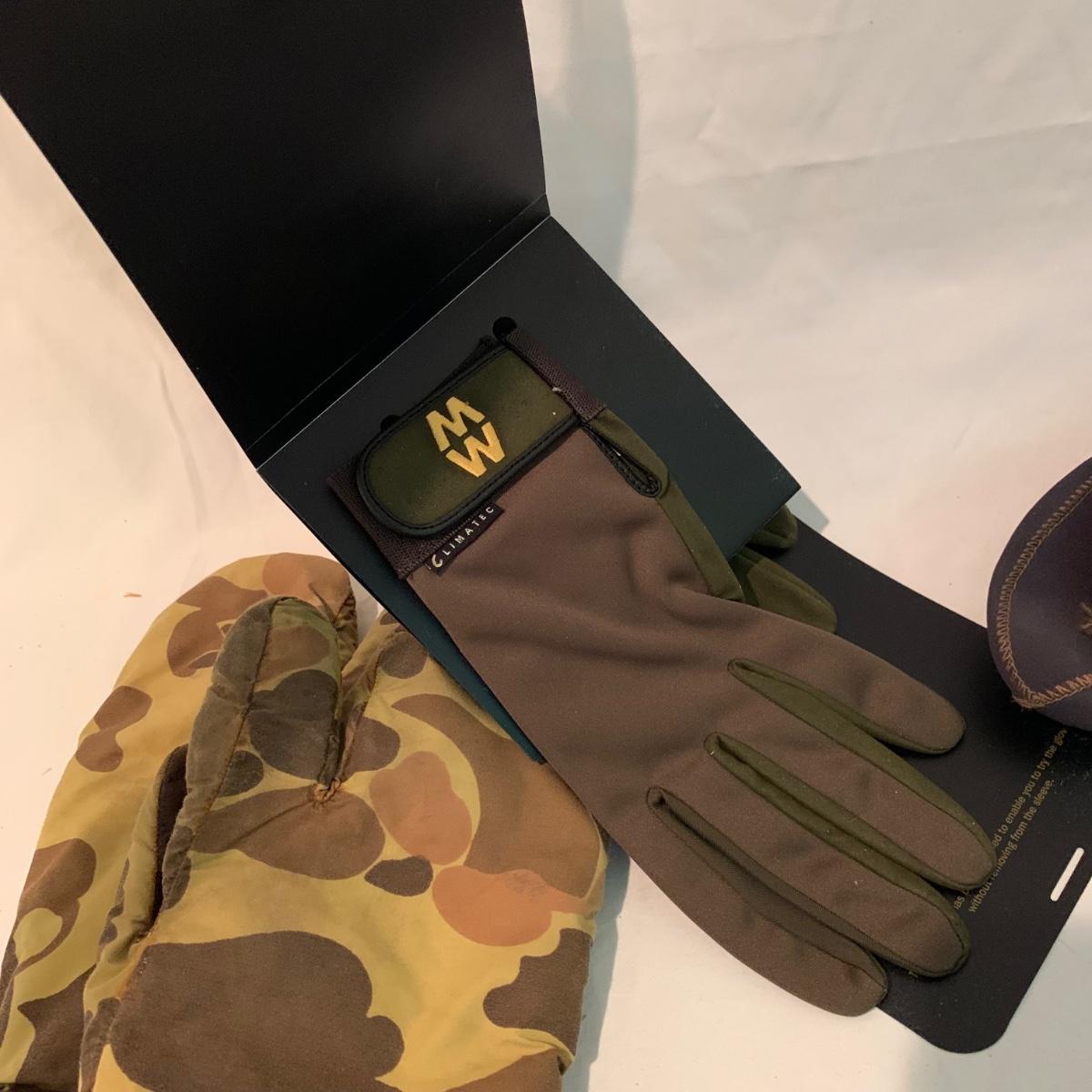 A variety of hats, vests, gloves, and more hunting and fishing gear. There are four brimmed hats, three of which are camouflage. There is a bright Orange hat, vest, and poncho. There is a variety of mosquito blocking clothing including a parka, a pant and jacket set, and more. Four pairs of gloves/mittens and a pair of neoprene socks. There are three vests of different styles, and a few accessories. 22” x 16” x 7”H bin is included.