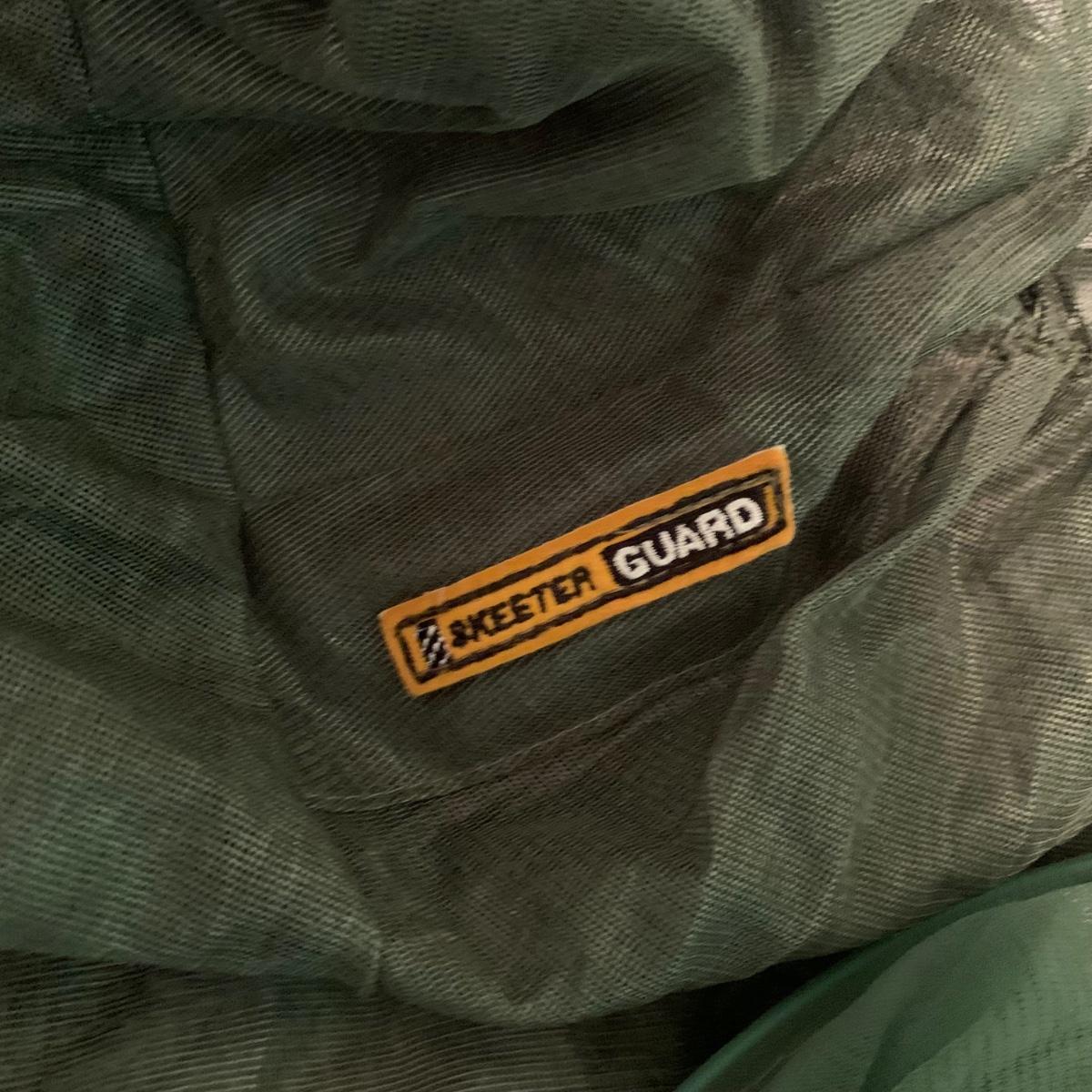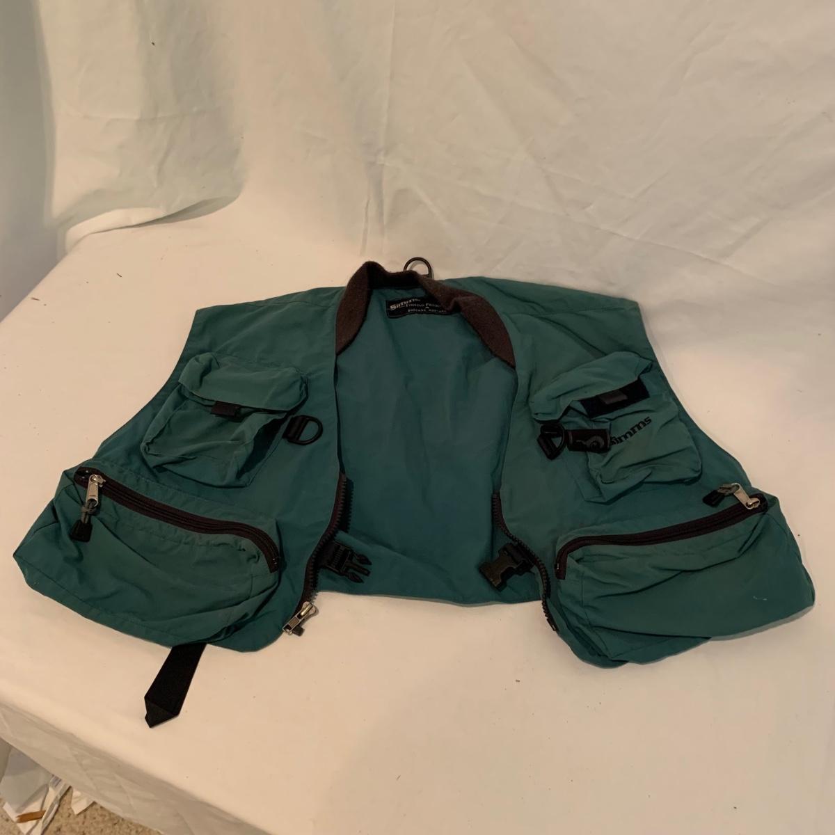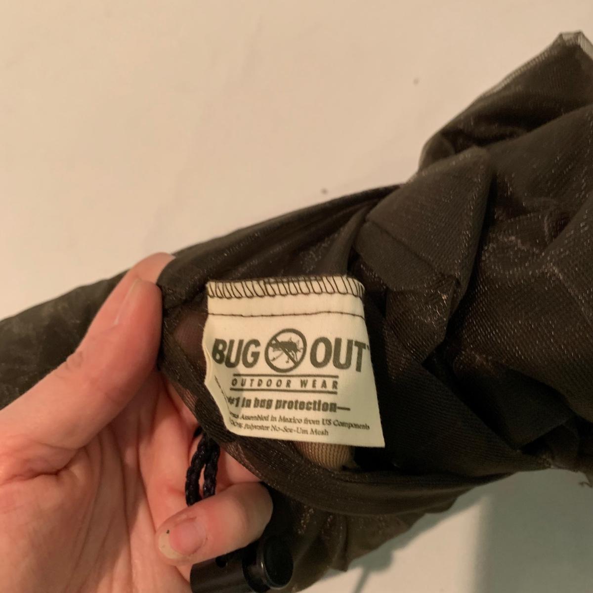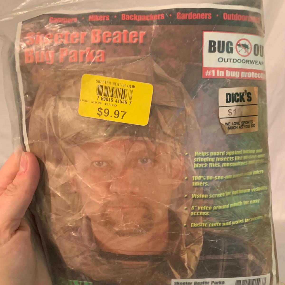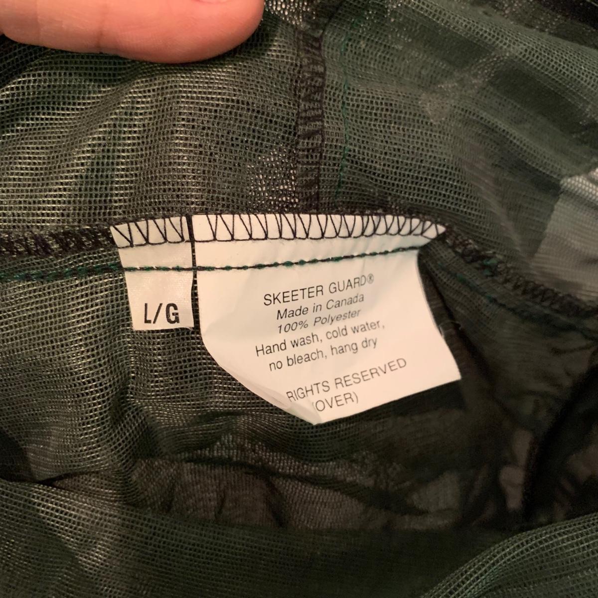 A variety of hats, vests, gloves, and more hunting and fishing gear. There are four brimmed hats, three of which are camouflage. There is a bright Orange hat, vest, and poncho. There is a variety of mosquito blocking clothing including a parka, a pant and jacket set, and more. Four pairs of gloves/mittens and a pair of neoprene socks. There are three vests of different styles, and a few accessories. 22” x 16” x 7”H bin is included.