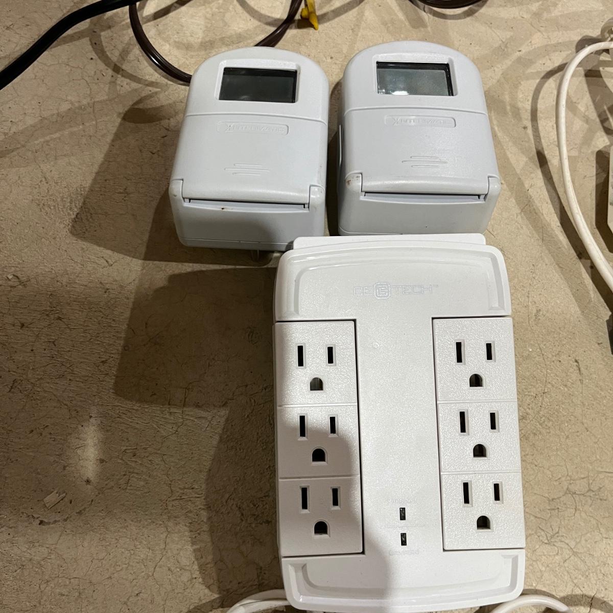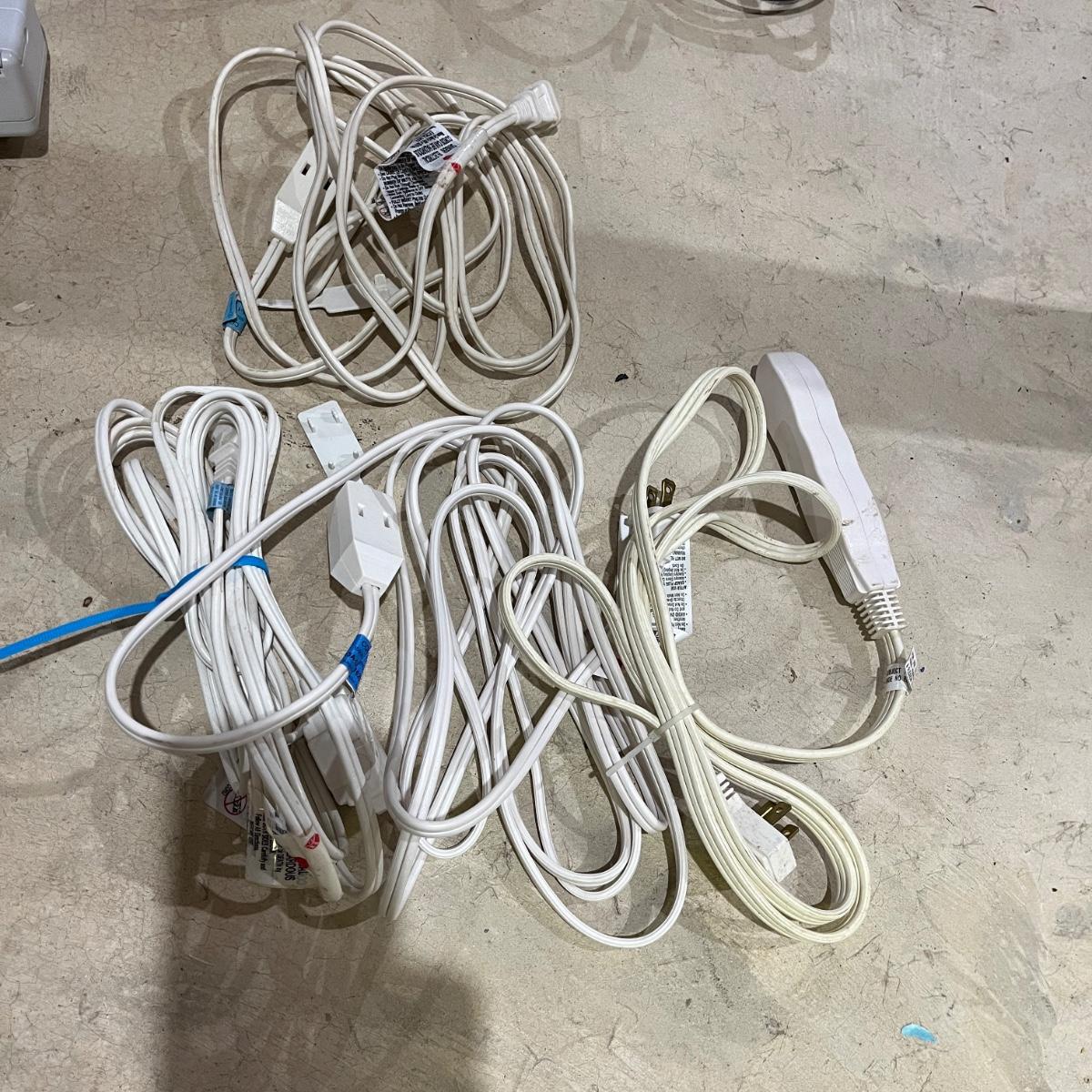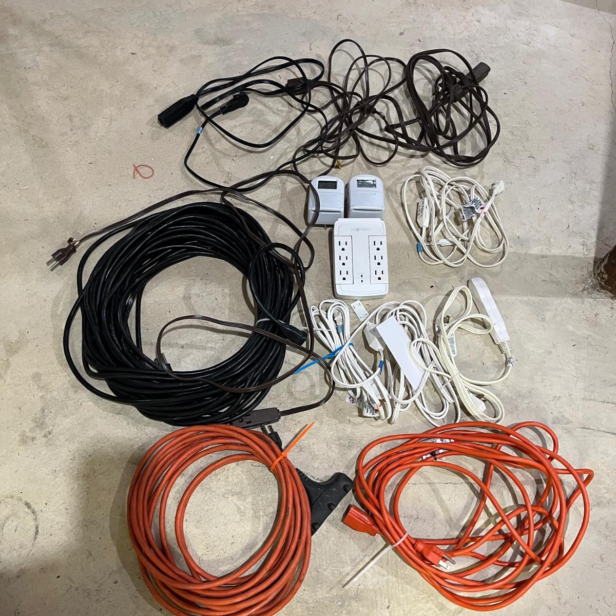 Lot includes three outdoor extension cords, four white indoor extension cords, four dark indoor extension cords, two timers and a multi plug.