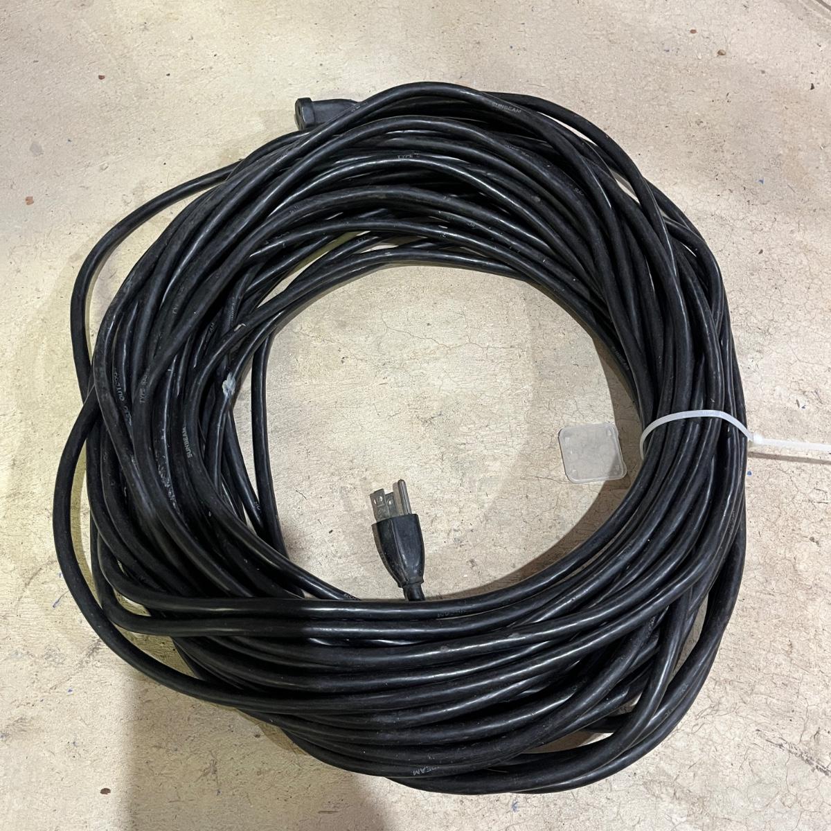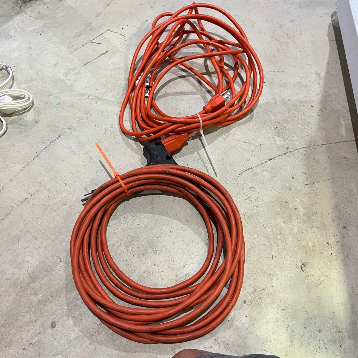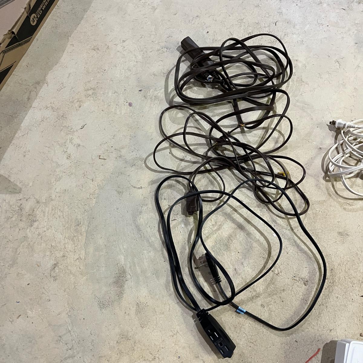 Lot includes three outdoor extension cords, four white indoor extension cords, four dark indoor extension cords, two timers and a multi plug.