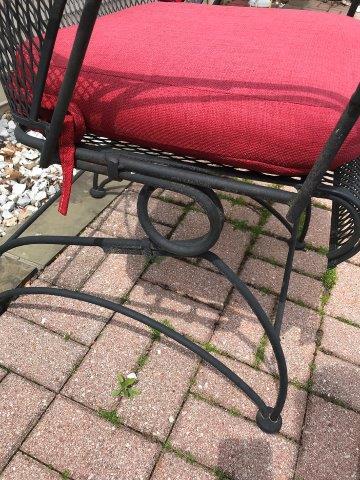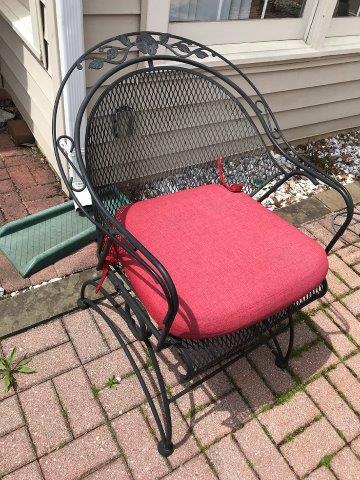 Very nice iron and iron mesh barrel back spring chair with flower, leaf, and scroll design back. Includes red cushion. May be by Meadowcraft. 26" x 26" x 35" H