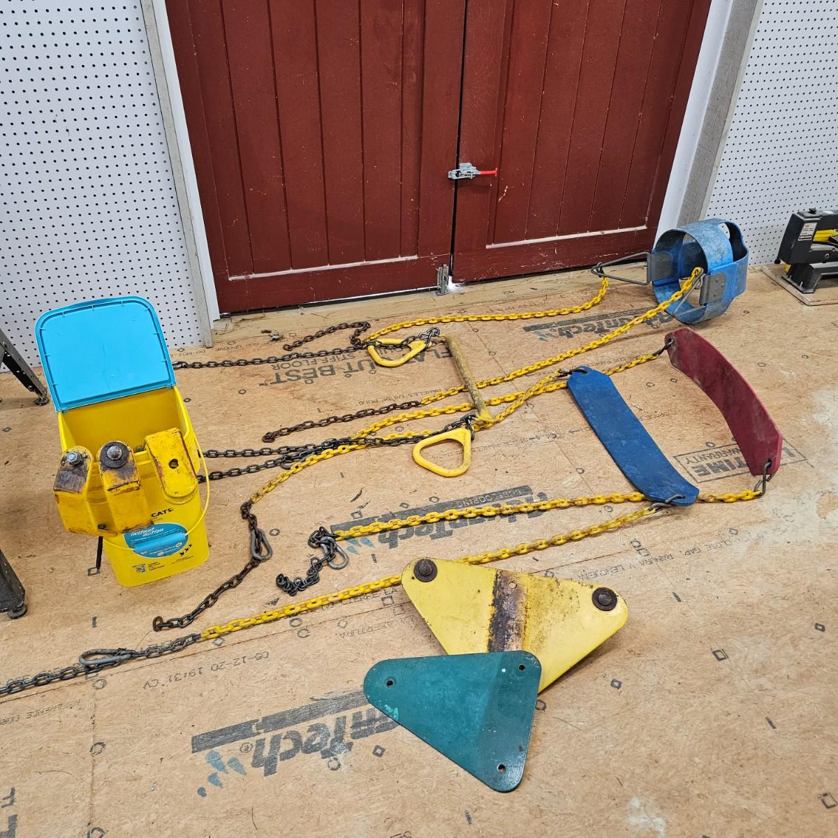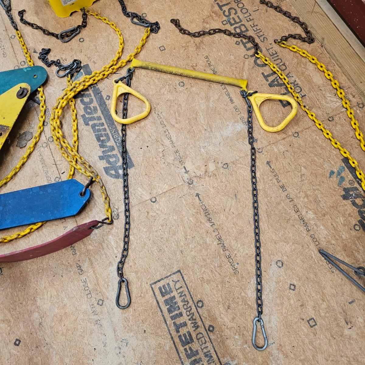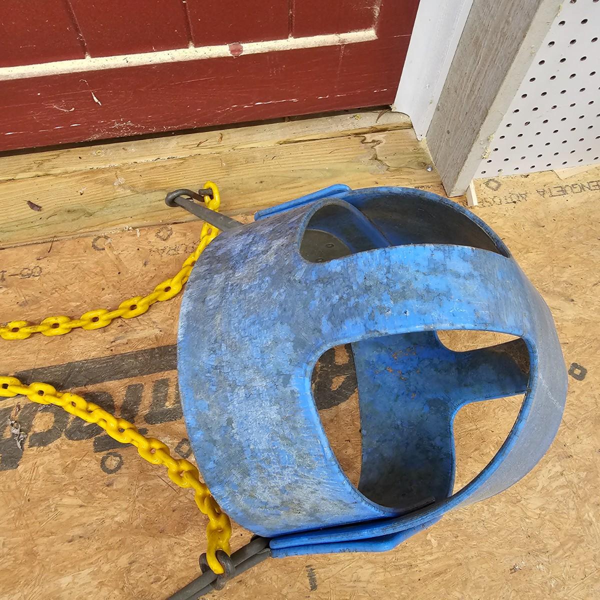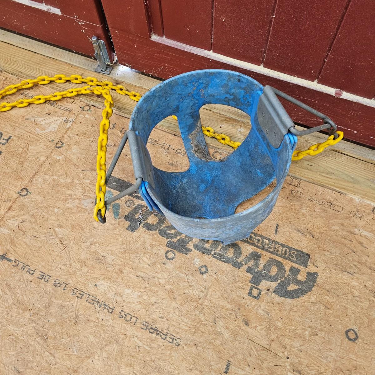 Several pieces of outdoor playground equipment. Two sling style swings, 5.5" x 25" with a 65" rubber covered chain for attachment. Also one small child basket style seat, 10" x 12"D with 60" chain. One bar with handles, 20" wide with 36" chain. Most items have carabiner clips for hanging. Two angled steel plates, use uncertain and a bin of extra hardware. See photos for details. Local pickup only.