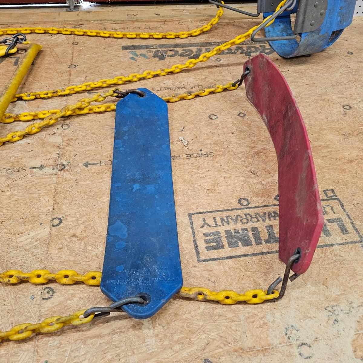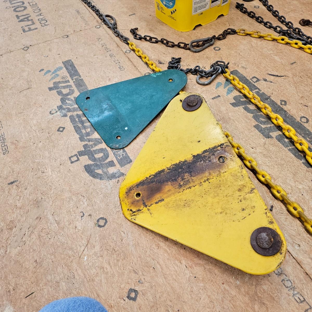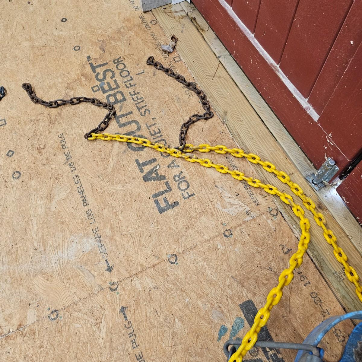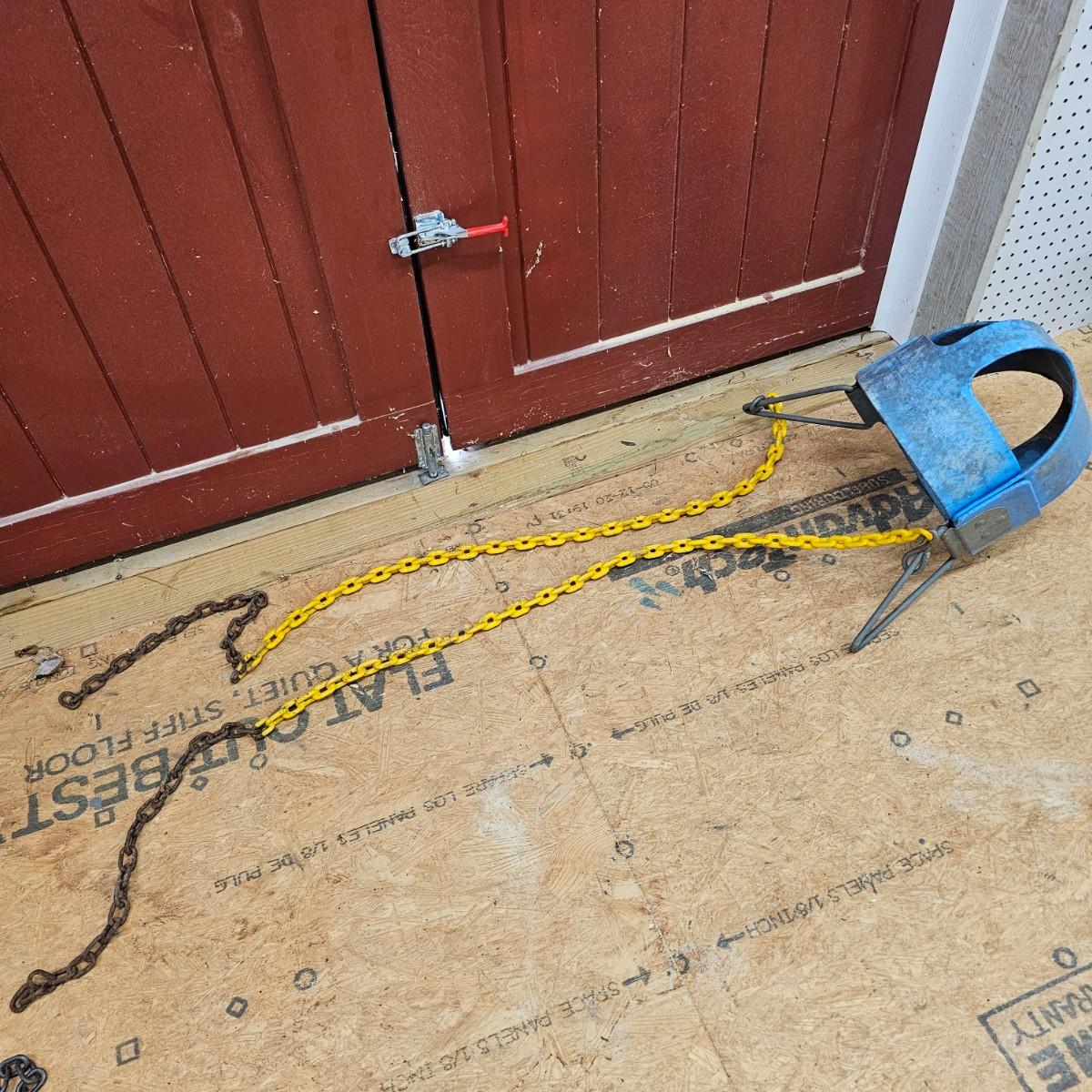 Several pieces of outdoor playground equipment. Two sling style swings, 5.5" x 25" with a 65" rubber covered chain for attachment. Also one small child basket style seat, 10" x 12"D with 60" chain. One bar with handles, 20" wide with 36" chain. Most items have carabiner clips for hanging. Two angled steel plates, use uncertain and a bin of extra hardware. See photos for details. Local pickup only.