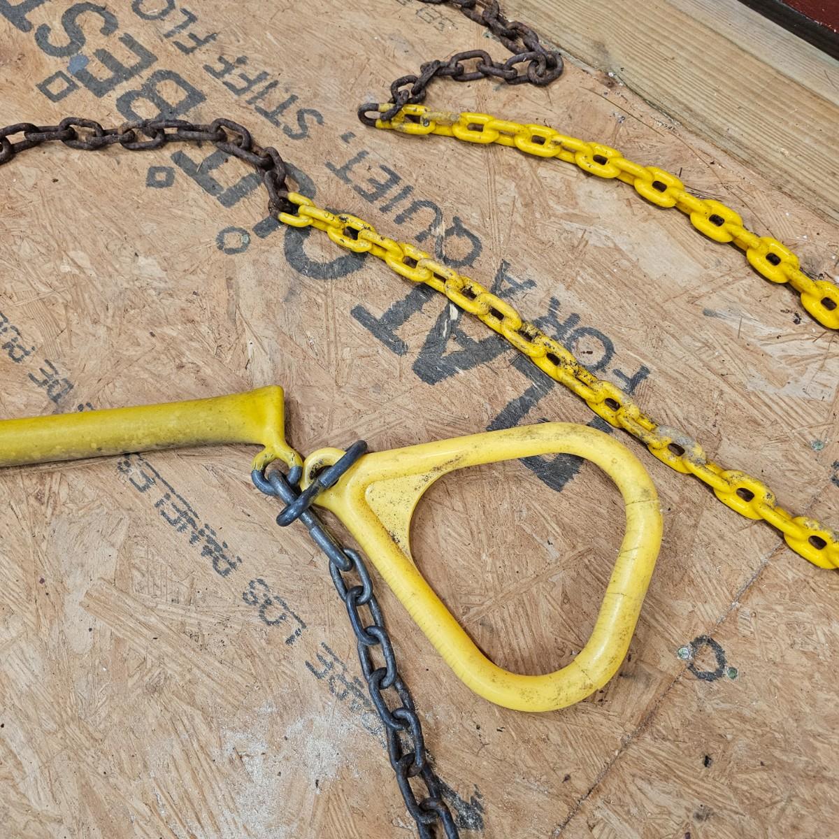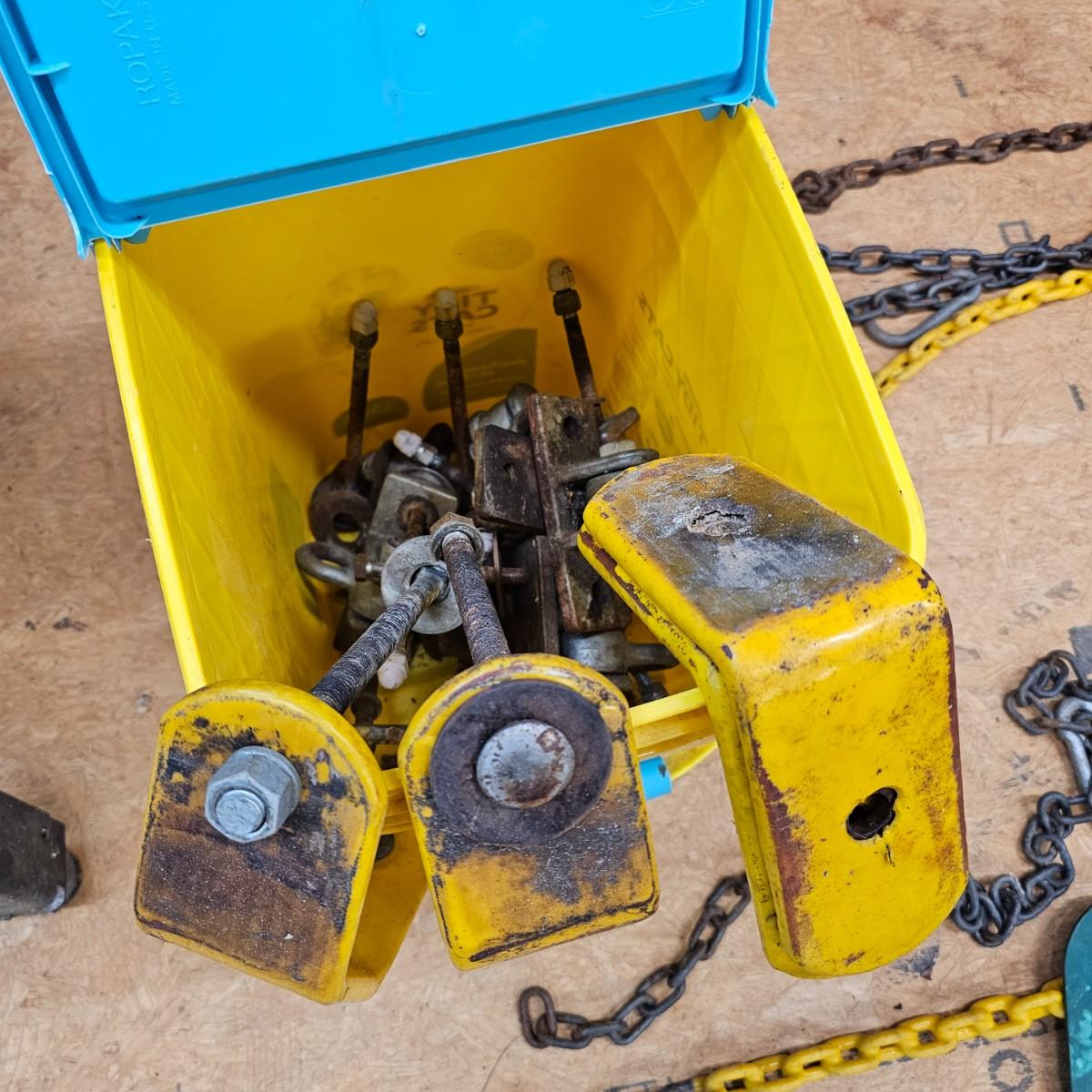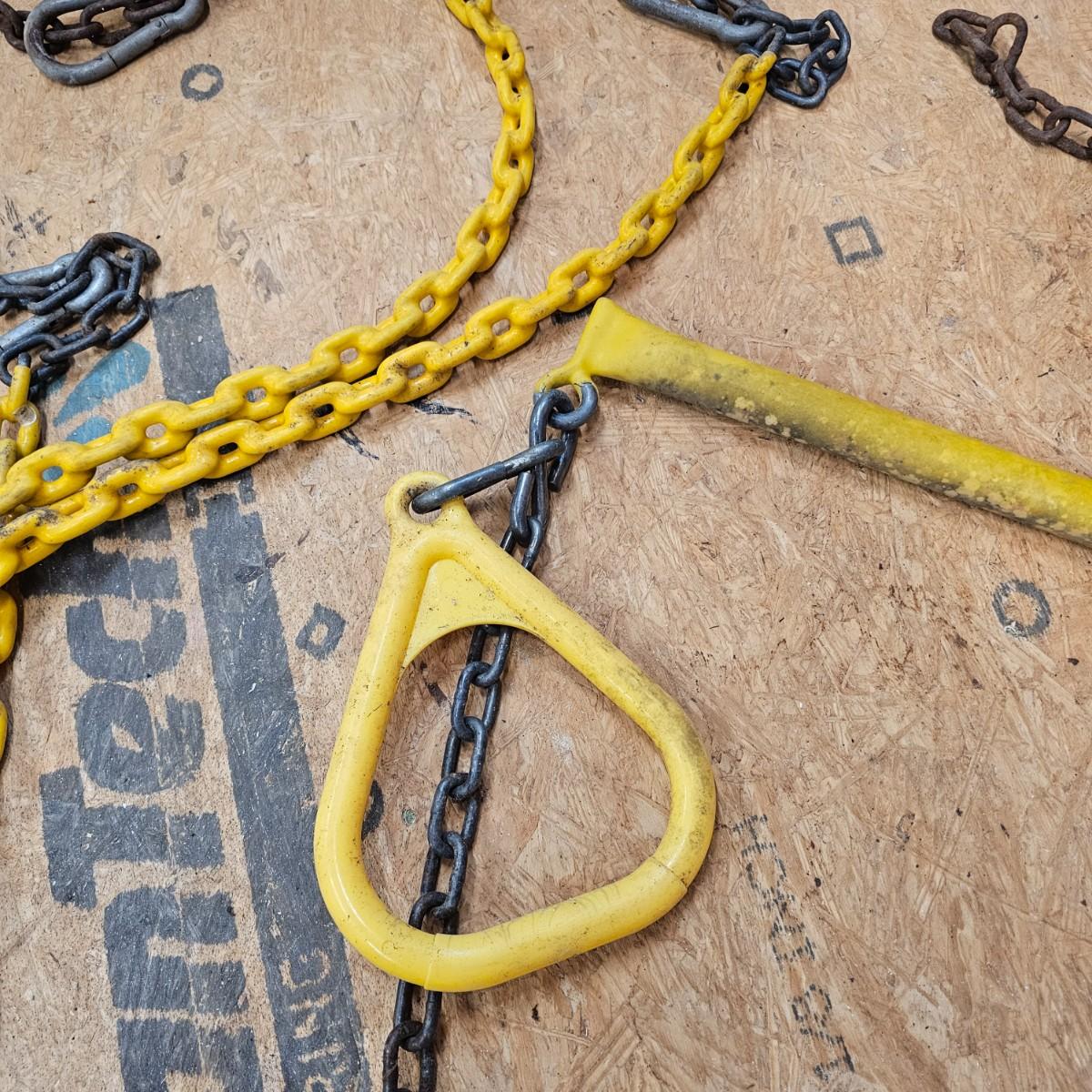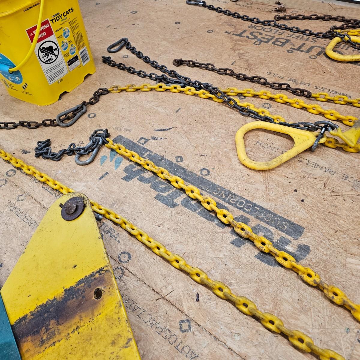 Several pieces of outdoor playground equipment. Two sling style swings, 5.5" x 25" with a 65" rubber covered chain for attachment. Also one small child basket style seat, 10" x 12"D with 60" chain. One bar with handles, 20" wide with 36" chain. Most items have carabiner clips for hanging. Two angled steel plates, use uncertain and a bin of extra hardware. See photos for details. Local pickup only.