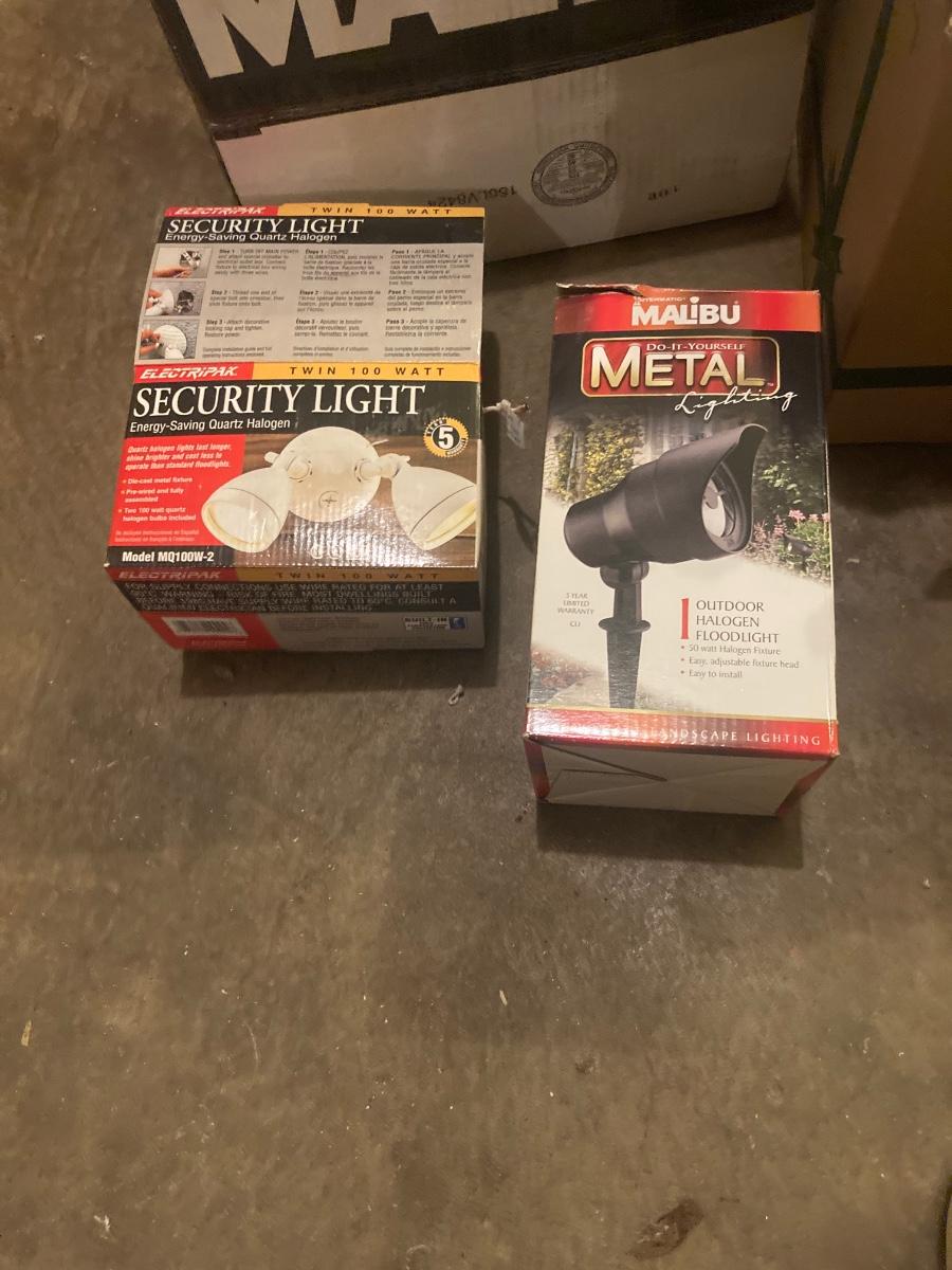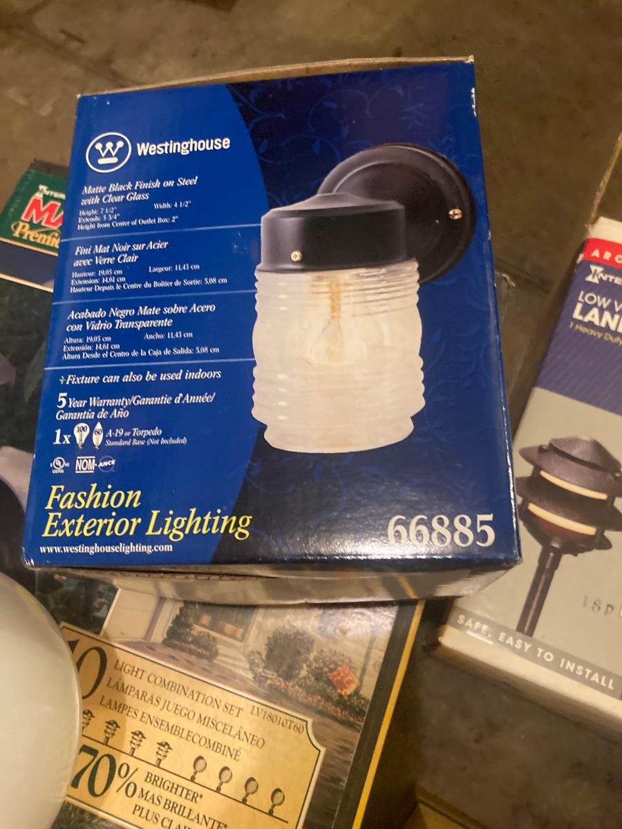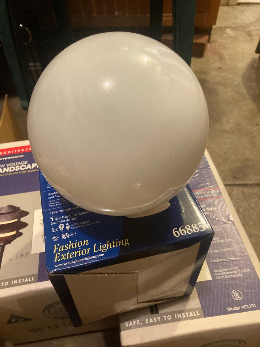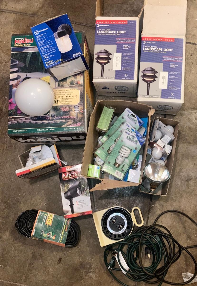 Lot includes 1 globe light shade, 2 landscaping lights, a Malibu low voltage 10 landscaping light set, 2 boxes of various light bulbs, security light, Malibu metal landscape light, low voltage outdoor wire, extension cord, and an extension cord reel. All untested