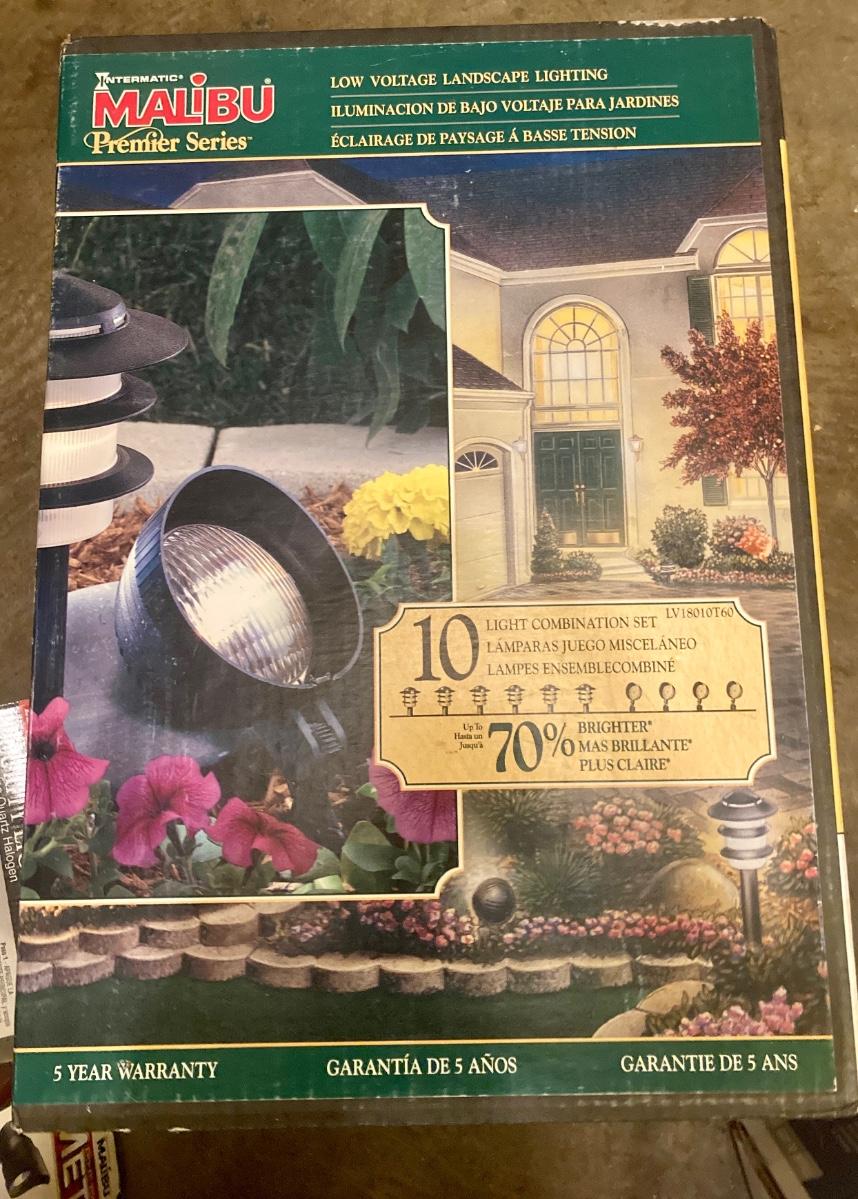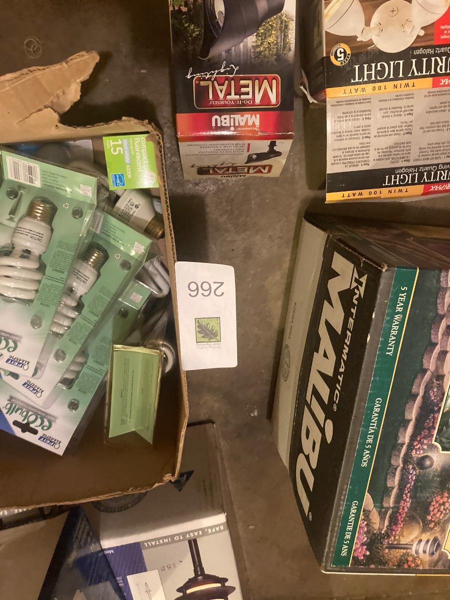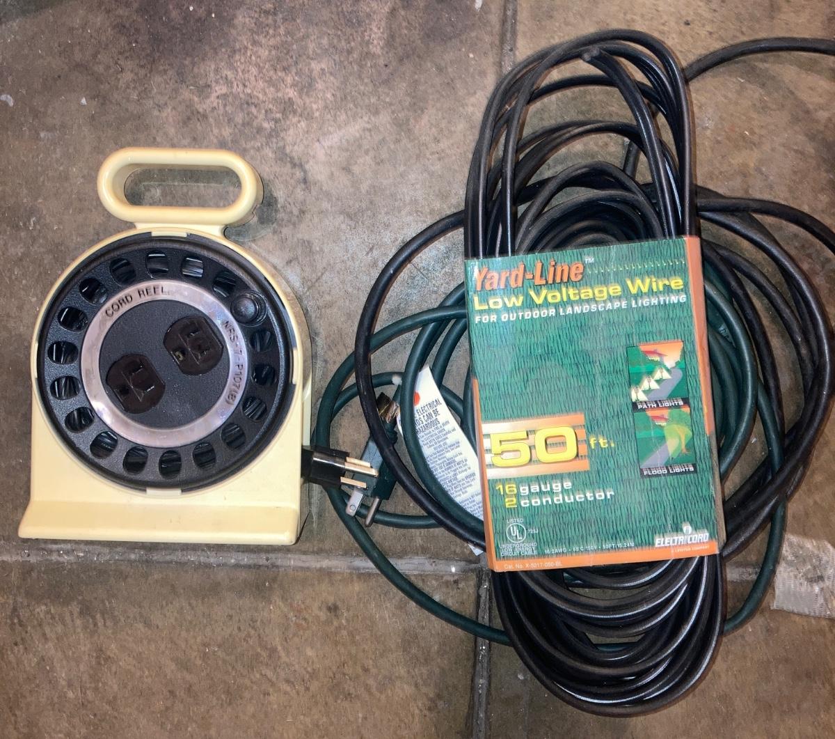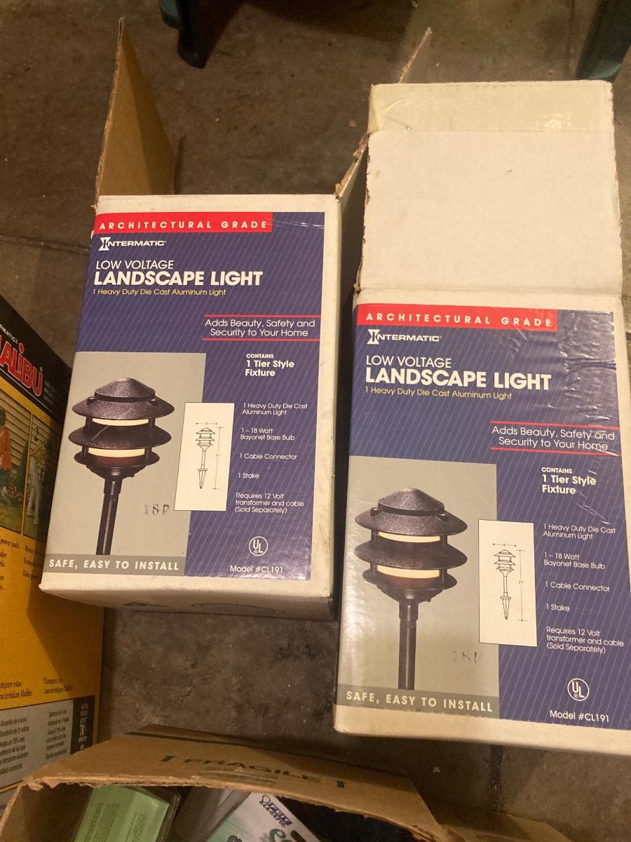 Lot includes 1 globe light shade, 2 landscaping lights, a Malibu low voltage 10 landscaping light set, 2 boxes of various light bulbs, security light, Malibu metal landscape light, low voltage outdoor wire, extension cord, and an extension cord reel. All untested