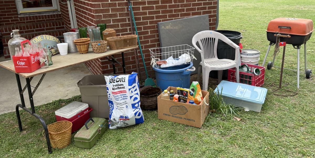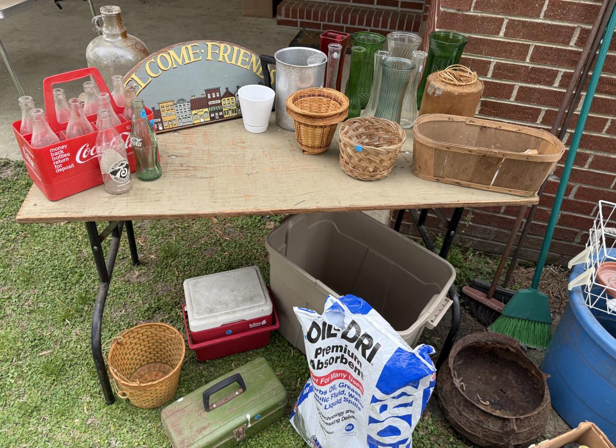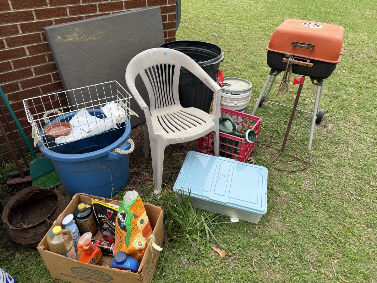 Grill, vases, chair, planters, chemicals, Coca Cola bottles & carrier, cooler, metal box, bucket,