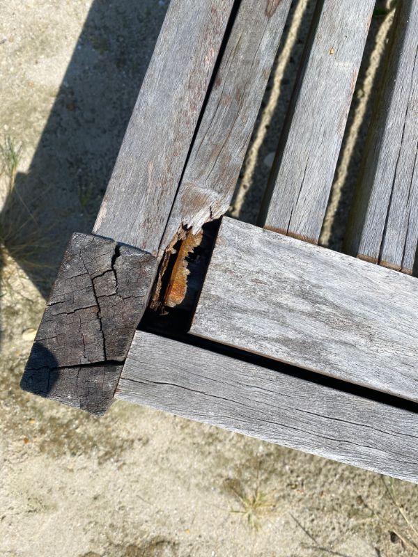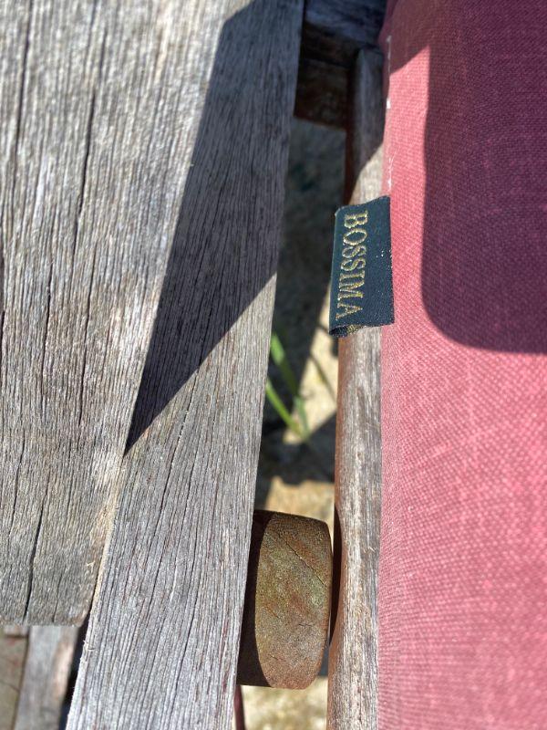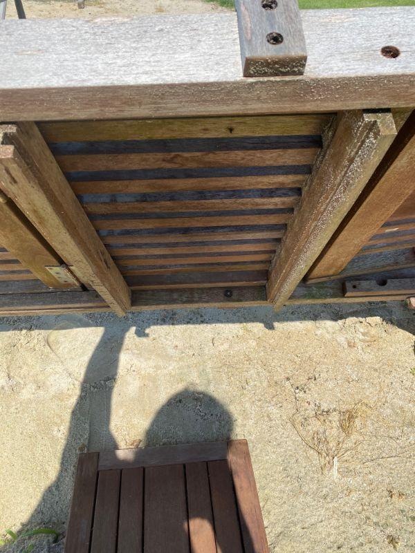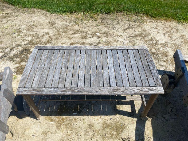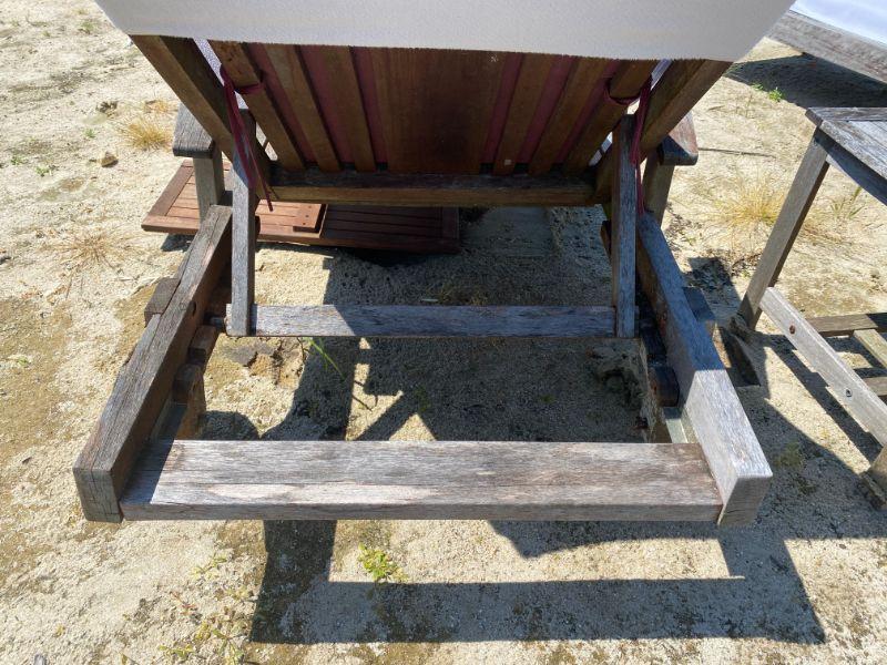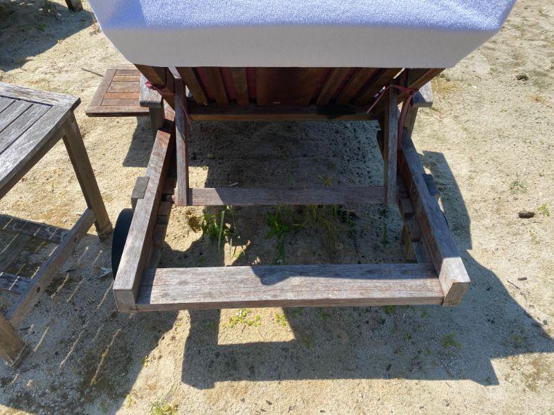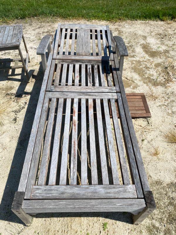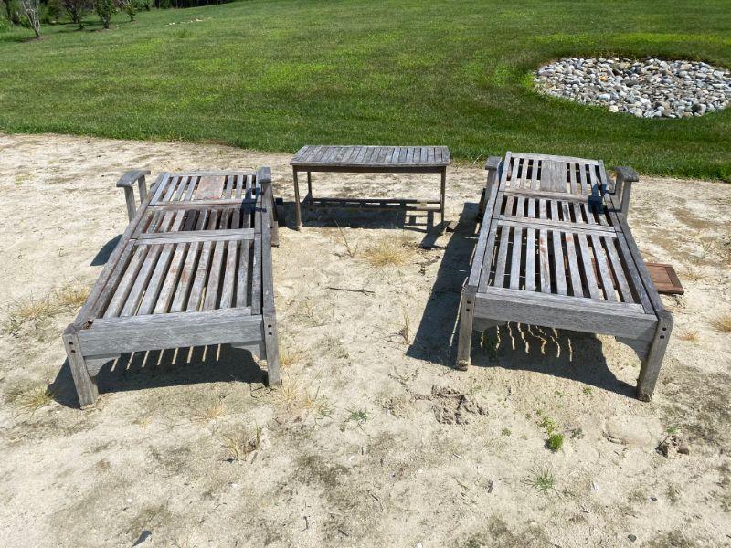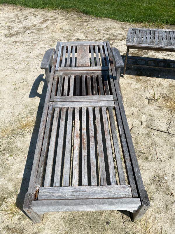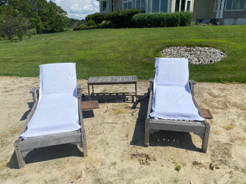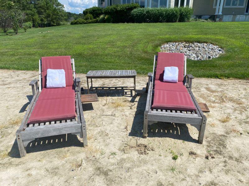 Outdoor lounge chairs with sliding tray underneath (one chair needs tray repaired and corner is damaged ) and cushions.