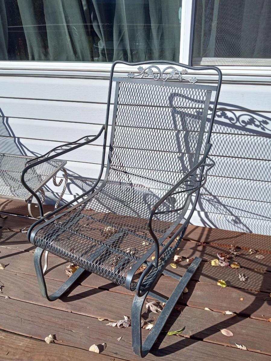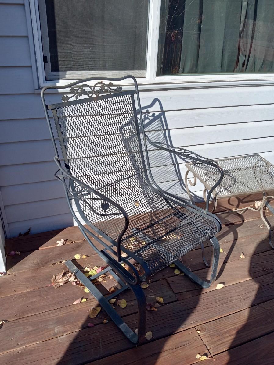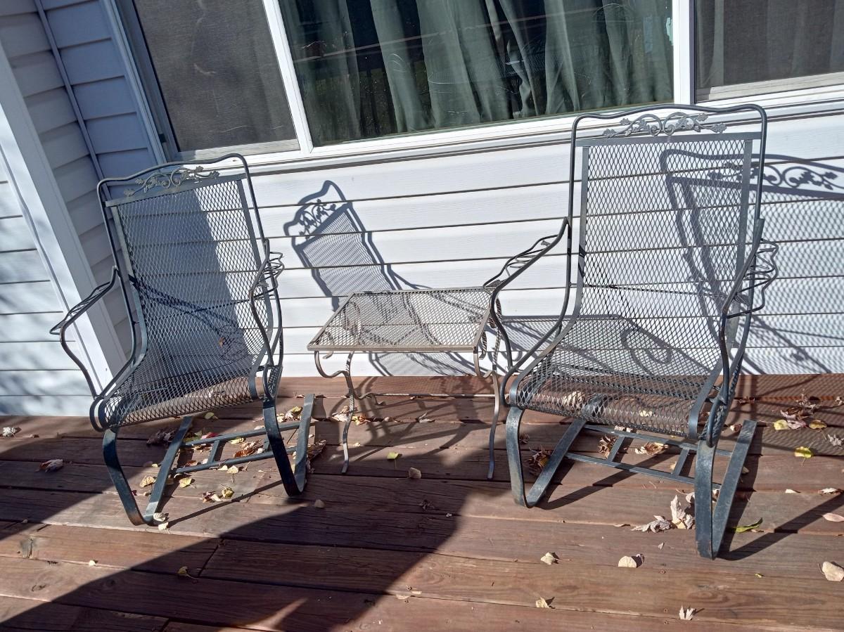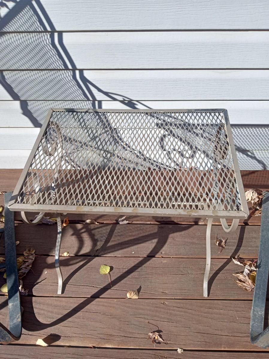 WROUGHT IRON ARMCHAIRS AND SIDE TABLE. THE 2 ARMCHAIRS MATCH