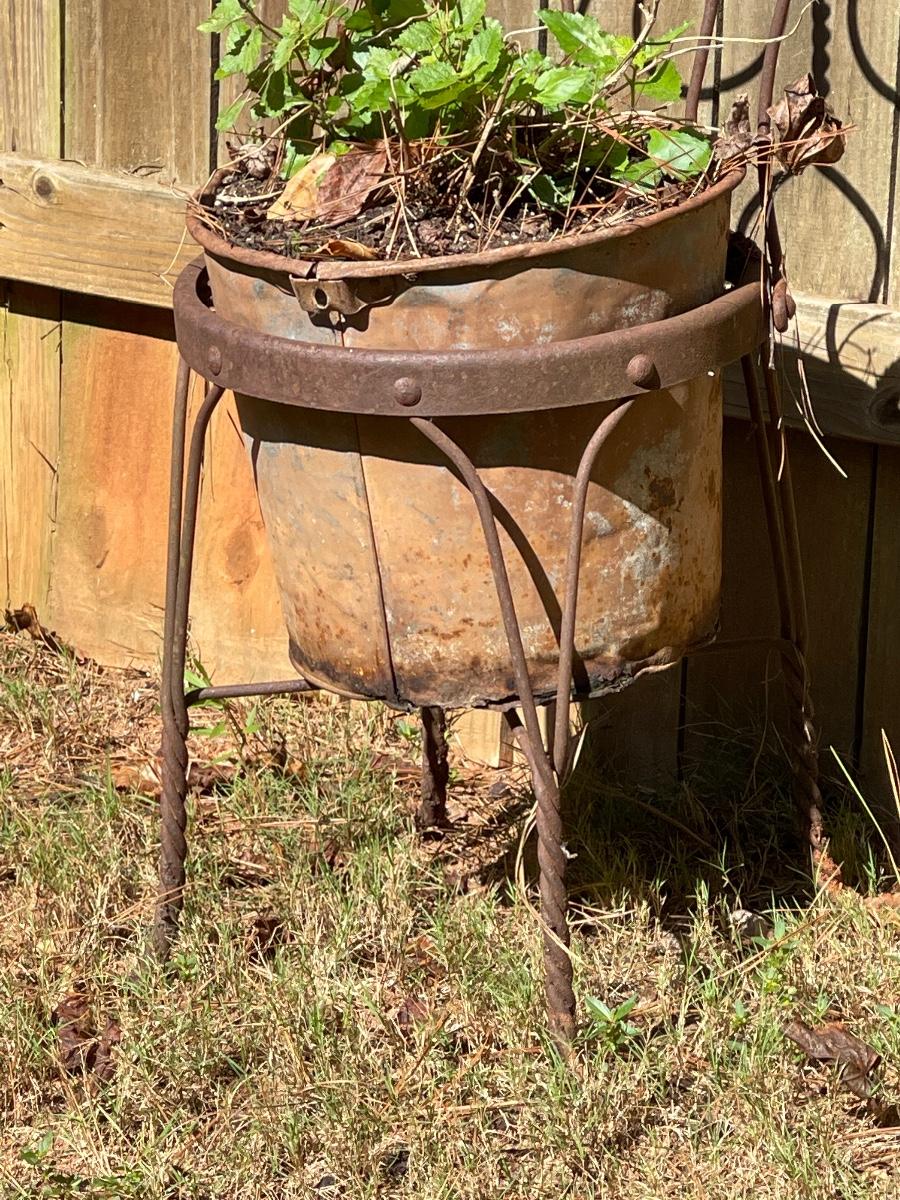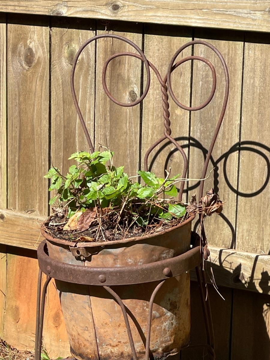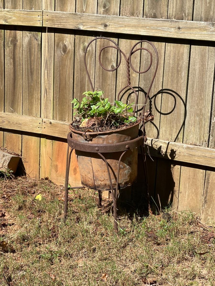 “Outdoor” Reclaimed Metal Rustic Soda Chair & Rustic Pot